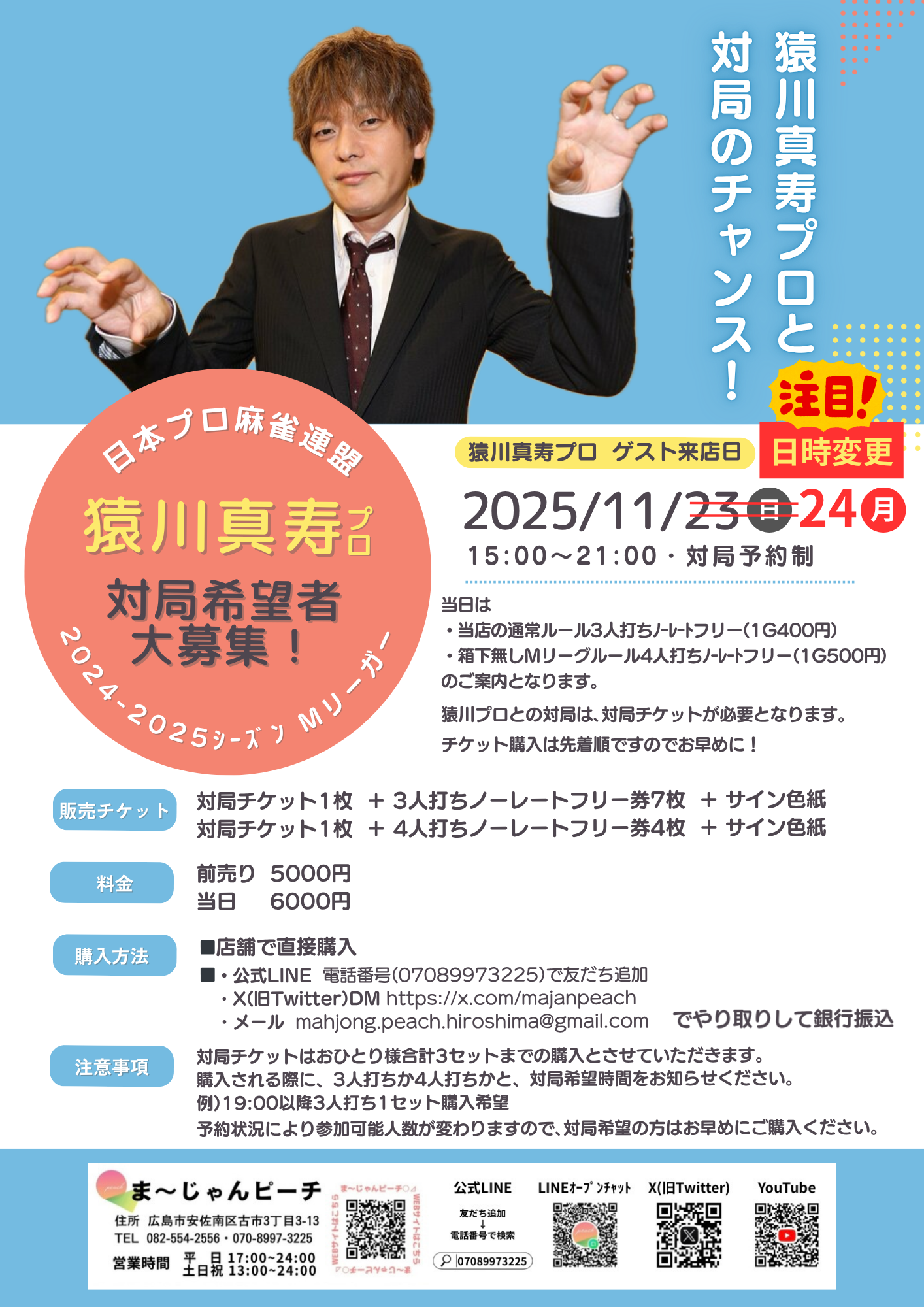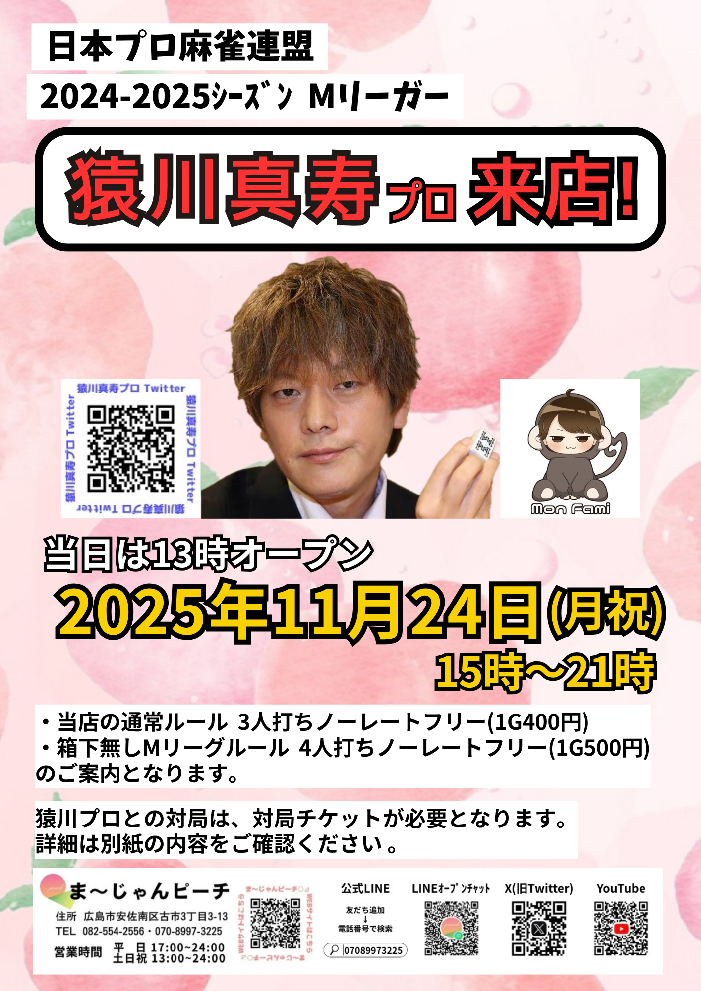 まーじゃんピーチ広島県 マージャンピーチ 広島県 古市橋駅 徒歩3分 三麻、ノーレート、セット、フリー 電話する082-554-2556 地図 店舗トップ ルール 写真/動画 イベント 求人 クーポン プロ イチオシ ランキング クチコミ イベント詳細 イベント 2026年2月1日(日) 麻雀YouTuber 堀内正人さん来店! 日時 : 2026年2月1日(日)~2026年2月1日(日) 2026年2月1日(日) 15:00~21:00 麻雀YouTuber 堀内正人さん来店! 全ルールご案内可能です! 当日来店され、ご遊技されている方から順番に堀内さんとの対局をご案内いたします。(状況により1~3半荘) イベント 2025年11月24日(月祝) 日本プロ麻雀連盟 猿川真寿プロ来店! 日時 : 2025年11月24日(月)~2025年11月24日(月) 2025年11月24日(月祝) 15:00~21:00 日本プロ麻雀連盟 猿川真寿プロ来店! ⚠️23日(日)から日程変更しました。 当日は ・当店通常ルール 3人打ちノーレートフリー(1G400円) ・箱下なしMリーグルール 4人打ちノーレートフリー(1G500円) のご案内となります。 猿川プロとの対局は、対局チケットが必要となります。 さらに読み込む... 次の6件〜2件/全2件の検索 お店のコトを友達に教える Facebook X(旧Twitter) Line Mail お店を評価する 閉店・休業・移転・情報違い報告 クチコミ投稿 報告内容詳細※必須 閉店 休業 移転 情報違い 送信する
