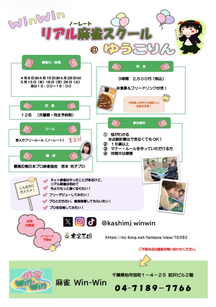 麻雀 win-win千葉県 マージャン ウィンウィン 千葉県 柏駅 徒歩3分 電話する0471-89-7766 地図 店舗トップ ルール 写真/動画 イベント 求人 クーポン プロ イチオシ ランキング クチコミ イベント詳細 スポットライトイベント イベント ✨✨win-win イベント情報②✨✨ 固定イベント 7の付く日限定イベント‼️ スピードバトル開催🔥 普段とは違った麻雀が楽しめる✨ イベント ✨2026年4月ゲスト来店情報✨ 日時 : 2026年4月1日(水)~2026年4月30日(木) 2026年4月24日(金)15:00〜21:00 日本プロ麻雀連盟所属『大川佳弥乃』プロ来店予定✨ 皆様のご来店をお待ちしております! イベント ✨✨win-winイベント情報①✨✨ 固定イベント 0と5の付く日は激アツ🔥 ✨赤3金3✨ イベント 4月麻雀スクール開催✨ 固定イベント 4月8日(水) 15日(水) 28日(火) 各日13時~16時 皆様のご参加をお待ちしております(*´ω`*) ※15日はアマ最強位のJokerさんが特別講師として参加予定 さらに読み込む... 次の6件〜4件/全4件の検索 お店のコトを友達に教える Facebook X(旧Twitter) Line Mail お店を評価する 閉店・休業・移転・情報違い報告 クチコミ投稿 報告内容詳細※必須 閉店 休業 移転 情報違い 送信する