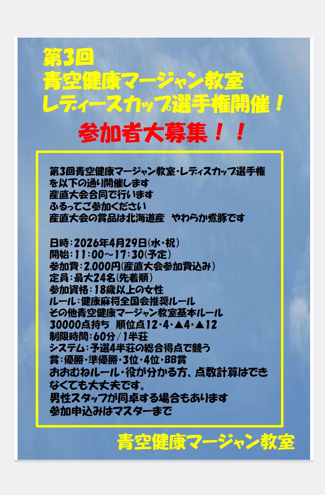 青空健康マージャン教室埼玉県 アオゾラケンコウマージャンキョウシツ 埼玉県 武里駅 徒歩5分 四麻、ノーレート、その他、麻雀教室、健康麻雀、セット、フリー 電話する048-796-8760 地図 店舗トップ ルール 写真/動画 イベント 求人 クーポン プロ イチオシ ランキング クチコミ イベント詳細 イベント 第3回青空健康マージャン教室レディースカップ選手権 日時 : 2026年4月29日(水)~2026年4月29日(水) 日時:4/29(水・祝) 開始:11:00 参加費:2,000円 定員:24名 参加資格:18歳以上女性 概ねルールのわかる方、点数計算ができなくても大丈夫です 4半荘戦 健康麻将全国会の産直大会と同時開催 イベント 星空CUP2026 日時 : 2026年4月19日(日)~2026年4月19日(日) 日時:2026/4/19日曜日 開始:17:30予定 終了:23:00予定 1DAY大会 参加費:1,500円 募集:16名 要予約 システム:総当たり4半荘 4半荘のトータルスコアで順位を決定します 主なルール:アリアリ、赤ドラ3枚、時間制限60分など イベント 第2・第4金曜日限定セット打ち放題 日時 : 2025年7月8日(火)~2025年12月31日(水) 毎月、第2・第4金曜日に限り セット料金通常1時間1,500円を4時間以上ご利用の場合5,000円で時間制限なしの割引を実施いたします 1日2卓限定 要予約 さらに読み込む... 次の6件〜3件/全3件の検索 お店のコトを友達に教える Facebook X(旧Twitter) Line Mail お店を評価する 閉店・休業・移転・情報違い報告 クチコミ投稿 報告内容詳細※必須 閉店 休業 移転 情報違い 送信する