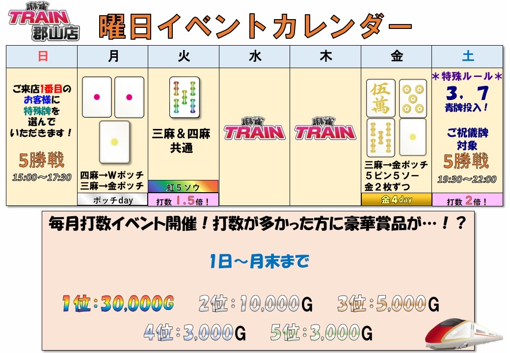麻雀TRAIN 郡山店福島県 マージャントレインコオリヤマテン 福島県 郡山駅 車で15分 四麻、三麻、セット、フリー 電話する024-900-9910 地図 店舗トップ ルール 写真/動画 イベント 求人 クーポン プロ イチオシ ランキング クチコミ イベント詳細 イベント ★曜日イベントカレンダー★水曜日木曜日はいつもの祝儀牌です✧˖° 日時 : 2023年4月21日(金)~2030年12月31日(火) イベント 【週末土日開催】スピード5勝戦☆【制限時間2時間半】 固定イベント 【開催時期】 土曜日の19時半〜22時 日曜日の15時〜17時半 上記の制限時間2時間半以内に5勝された方に特典あり♪ イベント 2025年7月イベント♬*॰¨̮ 日時 : 2023年4月24日(月)~2030年4月20日(土) 7月多くのイベントが盛りだくさん♪ 詳細は添付の画像をご確認ください(^^)/ さらに読み込む... 次の6件〜3件/全3件の検索 お店のコトを友達に教える Facebook X(旧Twitter) Line Mail お店を評価する 閉店・休業・移転・情報違い報告 クチコミ投稿 報告内容詳細※必須 閉店 休業 移転 情報違い 送信する