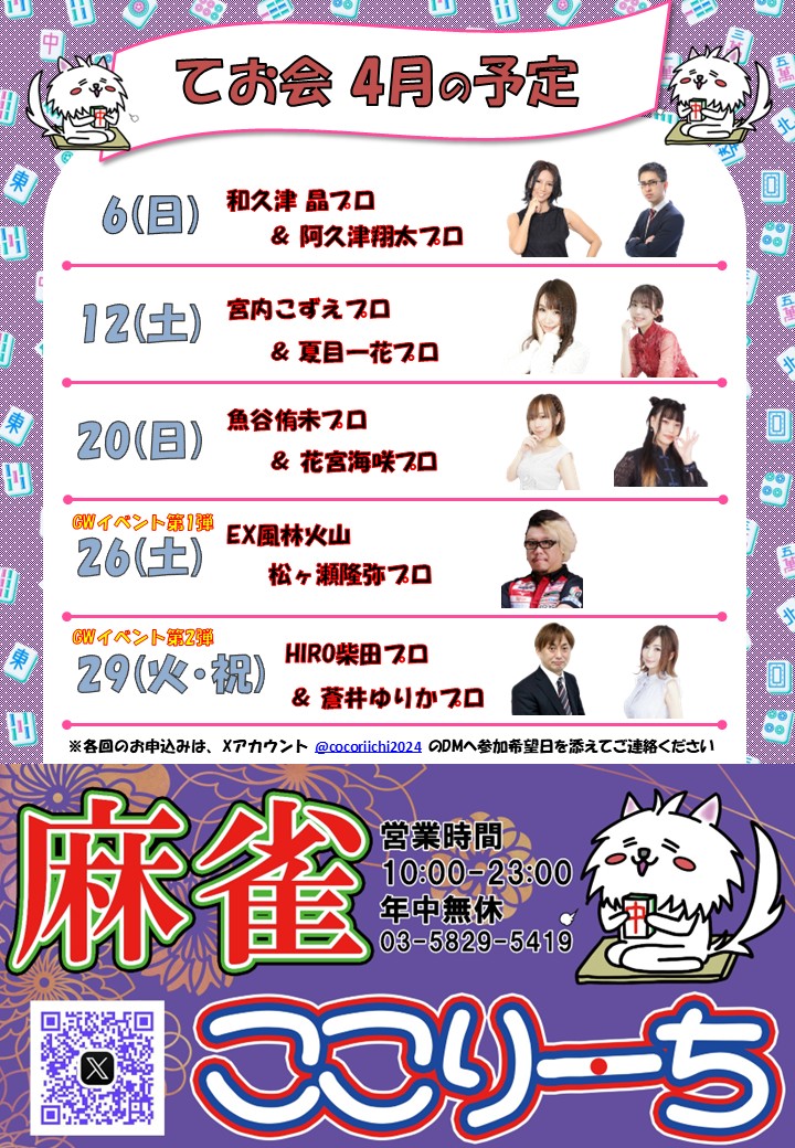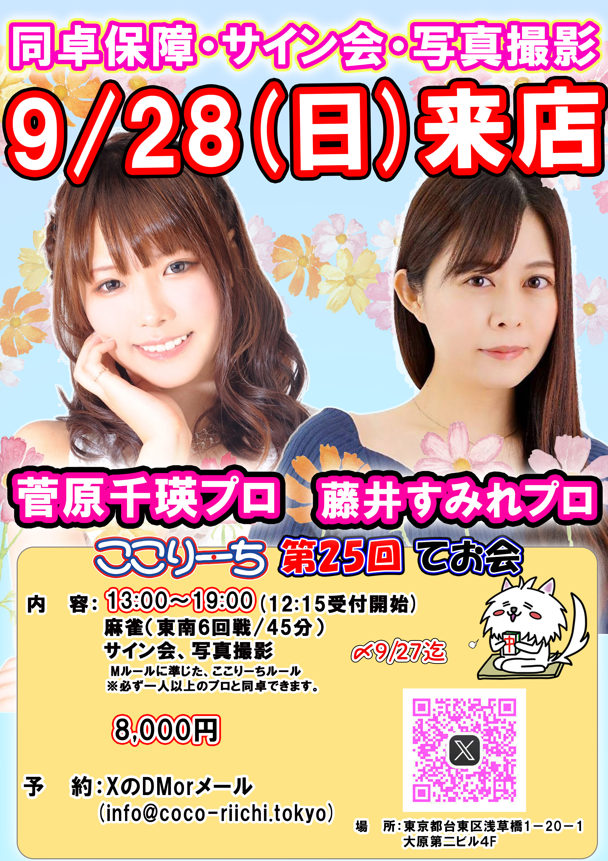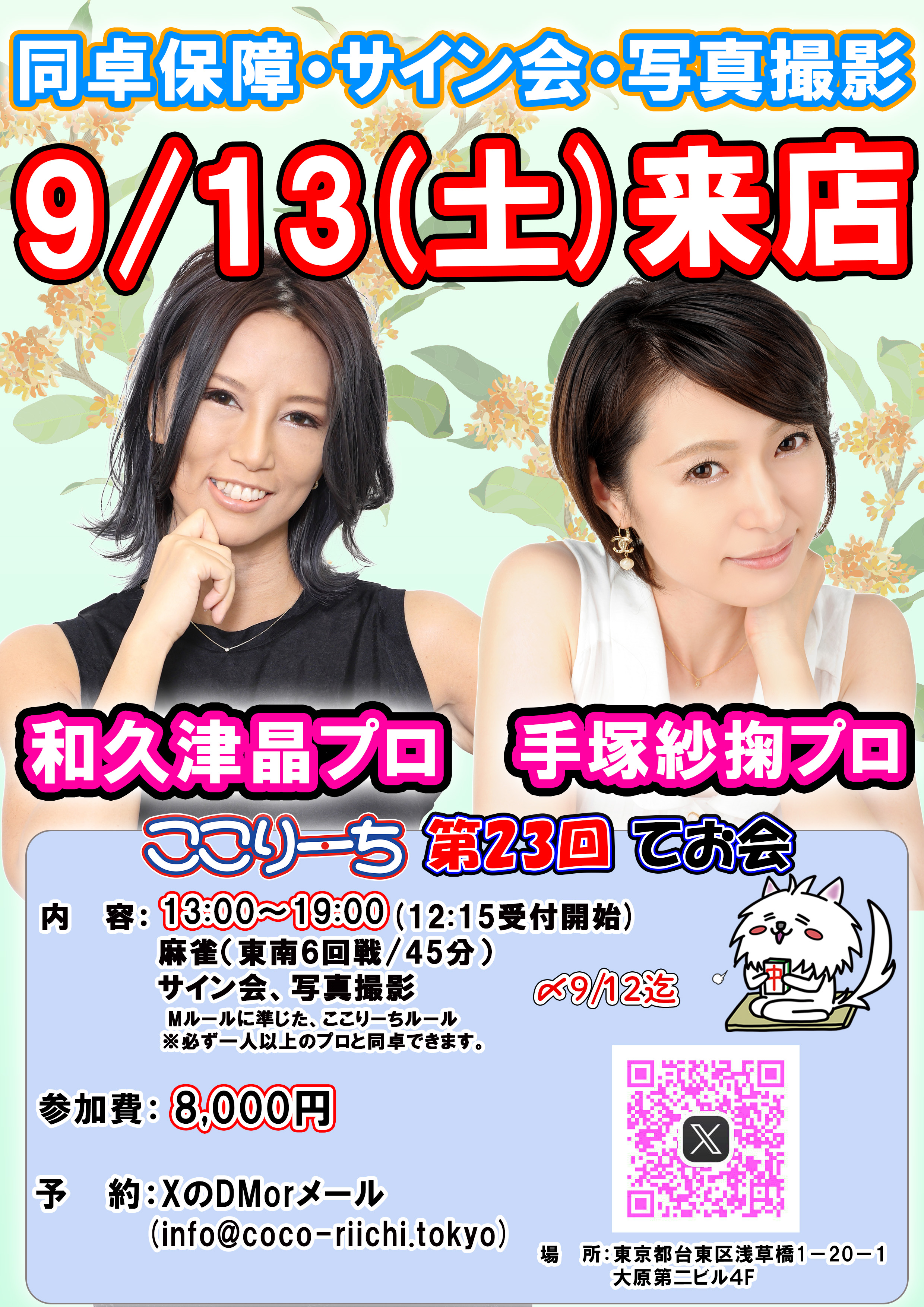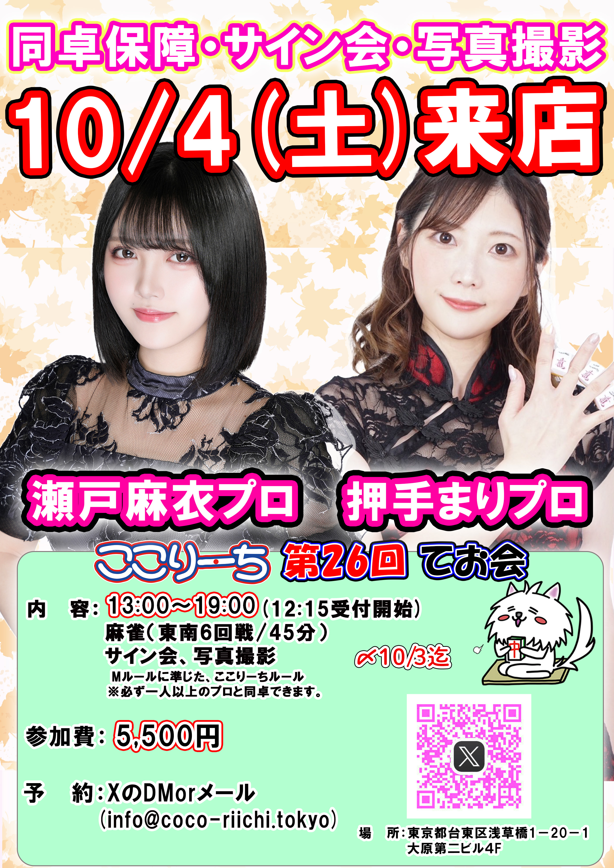 2025.02.01 オープン OPEN麻雀 ここりーち東京都 マージャンココリーチ 東京都 浅草橋駅 徒歩2分 四麻、三麻、ノーレート、セット 電話する03-5829-5419 地図 店舗トップ ルール 写真/動画 イベント 求人 クーポン プロ イチオシ ランキング クチコミ イベント詳細 イベント ✨✨第30回てお会/ゲスト「 新井啓文プロ&浅井裕介プロ」です!✨✨ 日時 : 2025年10月25日(土)~2025年10月25日(土) ⭐第30回てお会を開催いたします⭐ ゲストは「新井啓文プロ&浅井裕介プロ」です! ここりーちのイベントは和気あいあいとした和やかなイベントです! 点数計算できなくて不安な方や、イベント参加が初めてで雰囲気分からない方! ここりーちなら大丈夫👍 初心者🔰に優しいお店です! ご安心してご参加ください😊 ご予約はX(旧Twitter)のここりーちアカウント @cocoriichi2024 へDMでご連絡ください! よろしくお願いいたします! イベント ✨✨第29回てお会/ゲスト「日吉辰哉プロ&さくら 美緒プロ」です!✨✨ 日時 : 2025年10月19日(日)~2025年10月19日(日) ⭐第29回てお会を開催いたします⭐ ゲストは「日吉辰哉プロ&さくら美緒プロ」です! ここりーちのイベントは和気あいあいとした和やかなイベントです! 点数計算できなくて不安な方や、イベント参加が初めてで雰囲気分からない方! ここりーちなら大丈夫👍 初心者🔰に優しいお店です! ご安心してご参加ください😊 ご予約はX(旧Twitter)のここりーちアカウント @cocoriichi2024 へDMでご連絡ください! よろしくお願いいたします! イベント ✨✨第28回てお会/ゲスト「 内川幸太郎プロ」です!✨✨ 日時 : 2025年10月14日(火)~2025年10月14日(火) ⭐第27回てお会を開催いたします⭐ ゲストは「内川幸太郎プロ」です! ここりーちのイベントは和気あいあいとした和やかなイベントです! 点数計算できなくて不安な方や、イベント参加が初めてで雰囲気分からない方! ここりーちなら大丈夫👍 初心者🔰に優しいお店です! ご安心してご参加ください😊 ご予約はX(旧Twitter)のここりーちアカウント @cocoriichi2024 へDMでご連絡ください! よろしくお願いいたします! イベント ✨✨第27回てお会/ゲスト「中川美優プロ&山脇千文美プロ」です!✨✨ 日時 日時 : 2025年10月5日(日)~2025年10月5日(日) ⭐第27回てお会を開催いたします⭐ ゲストは「中川美優プロ&山脇千文美プロ」です! ここりーちのイベントは和気あいあいとした和やかなイベントです! 点数計算できなくて不安な方や、イベント参加が初めてで雰囲気分からない方! ここりーちなら大丈夫👍 初心者🔰に優しいお店です! ご安心してご参加ください😊 ご予約はX(旧Twitter)のここりーちアカウント @cocoriichi2024 へDMでご連絡ください! よろしくお願いいたします! イベント ✨✨第26回てお会/ゲスト「 瀬戸麻衣プロ&押手まりプロ」です!✨✨ 日時 : 2025年10月4日(土)~2025年10月4日(土) ⭐第26回てお会を開催いたします⭐ ゲストは「瀬戸麻衣プロ&押手まりプロ」です! ここりーちのイベントは和気あいあいとした和やかなイベントです! 点数計算できなくて不安な方や、イベント参加が初めてで雰囲気分からない方! ここりーちなら大丈夫👍 初心者🔰に優しいお店です! ご安心してご参加ください😊 ご予約はX(旧Twitter)のここりーちアカウント @cocoriichi2024 へDMでご連絡ください! よろしくお願いいたします! さらに読み込む... 次の6件〜10件/全34件の検索 お店のコトを友達に教える Facebook X(旧Twitter) Line Mail お店を評価する 閉店・休業・移転・情報違い報告 クチコミ投稿 報告内容詳細※必須 閉店 休業 移転 情報違い 送信する