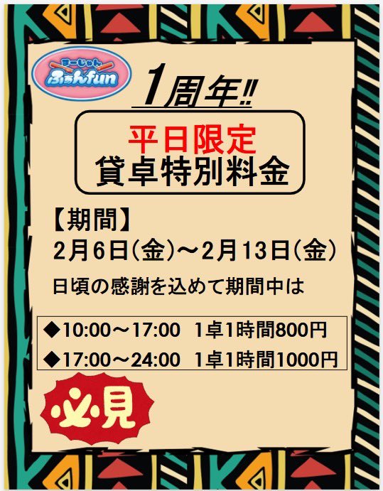 2025.02.07 オープン OPEN麻雀 ふぁんfun愛知県 マージャンファンファン 愛知県 伏見駅 徒歩3分 三麻、セット、フリー 電話する052-746-9739 地図 店舗トップ ルール 写真/動画 イベント 求人 クーポン プロ イチオシ ランキング クチコミ イベント詳細 スポットライトイベント イベント 土日祝日も使える昼割パック4000円! 日時 : 2025年2月1日(土)~2025年12月31日(水) 平日、土日祝日関係なく10時~17時は昼割パックで打ち切り1卓4000円! 終日打たれる方も自動で終日パック10000円に切り替わるのでめちゃ安! イベント ☆1周年イベント開催☆ 日時 : 2026年2月6日(金)~2026年2月15日(日) 1周年の感謝を込めて期間中はセット平日17時以降も1時間1000円!! もちろんフリーのほうも”色々”やっております!! 詳細はご来店して店内で確認を! 2年目も全力営業していきますのでよろしくお願いします!!! イベント 貸卓セットの終日パックが大変お得です! 日時 : 2026年1月5日(月)~2028年12月31日(日) 平日なら何時間打っても1卓8000円 土日祝日でも終日10000円と他店様の追随を許さない激安パック料金あります! 長く麻雀打つ方は是非ふぁんfunの貸卓パックをどうぞ! イベント 土日祝日フリー早割!最大半額! 日時 : 2025年2月1日(土)~2026年12月31日(木) 土日祝日に11時までに来店するとゲーム代が半額になるチャンス! ご遊戯G数が1~10本の方は50%で 11~20本の方は66%で 21~30本の方は83%で 31本以上の方は100%ゲーム代半額! (例)12本ご遊戯のお客様がいた場合 66%で成功のチャレンジ→成功した場合12本×G代半額の150円=1800円のキャッシュバック! イベント フリー月替わりイベント(非常に強力!) 日時 : 2026年1月1日(木)~2026年12月30日(水) 地域最高のフリー還元率です! 是非一度店舗に来て内容確認してください♪ さらに読み込む... 次の6件〜6件/全6件の検索 お店のコトを友達に教える Facebook X(旧Twitter) Line Mail お店を評価する 閉店・休業・移転・情報違い報告 クチコミ投稿 報告内容詳細※必須 閉店 休業 移転 情報違い 送信する