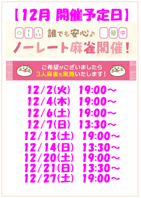 2025.06.28 オープン OPEN麻雀KAGURA三重県 マージャンカグラ 三重県 近鉄四日市駅 徒歩2分 四麻、三麻、ノーレート、麻雀教室、セット、フリー 電話する059-340-3424 地図 店舗トップ ルール 写真/動画 イベント 求人 クーポン プロ イチオシ ランキング クチコミ イベント詳細 ピックアップイベント イベント お年玉イベント開催! 日時 : 2026年1月3日(土)~2026年1月31日(土) なんと100ゲーム分の無料ゲーム券を配布します! 1/3〜1/31の期間の限定イベントとなります! ※通常ルールのみ対象となります スポットライトイベント イベント ノーレート麻雀開催! 固定イベント Mリーグルールのノーレート麻雀を開催しています! (ご希望ありましたら3人麻雀も実施します) 当店女性スタッフも参戦します! 開催日はXまたはインスタをご確認下さい!! イベント 倍ポッチイベント開催! 固定イベント クリスマス期間の12/24〜12/25と年明けの1/3〜1/4に開催します! 今後、定期的に開催予定です! イベント 初心者向け麻雀教室 固定イベント 初心者向けの麻雀教室を毎週日曜日開催しています! みんなで楽しく麻雀覚えましょー! セット無料券その他サービス券配布します! イベント ご新規様無料ゲーム券配布中! 固定イベント フリーご新規様向け無料ゲーム券配布中です! セットご新規様向け無料ゲーム券配布中です! さらに読み込む... 次の6件〜7件/全7件の検索 お店のコトを友達に教える Facebook X(旧Twitter) Line Mail お店を評価する 閉店・休業・移転・情報違い報告 クチコミ投稿 報告内容詳細※必須 閉店 休業 移転 情報違い 送信する