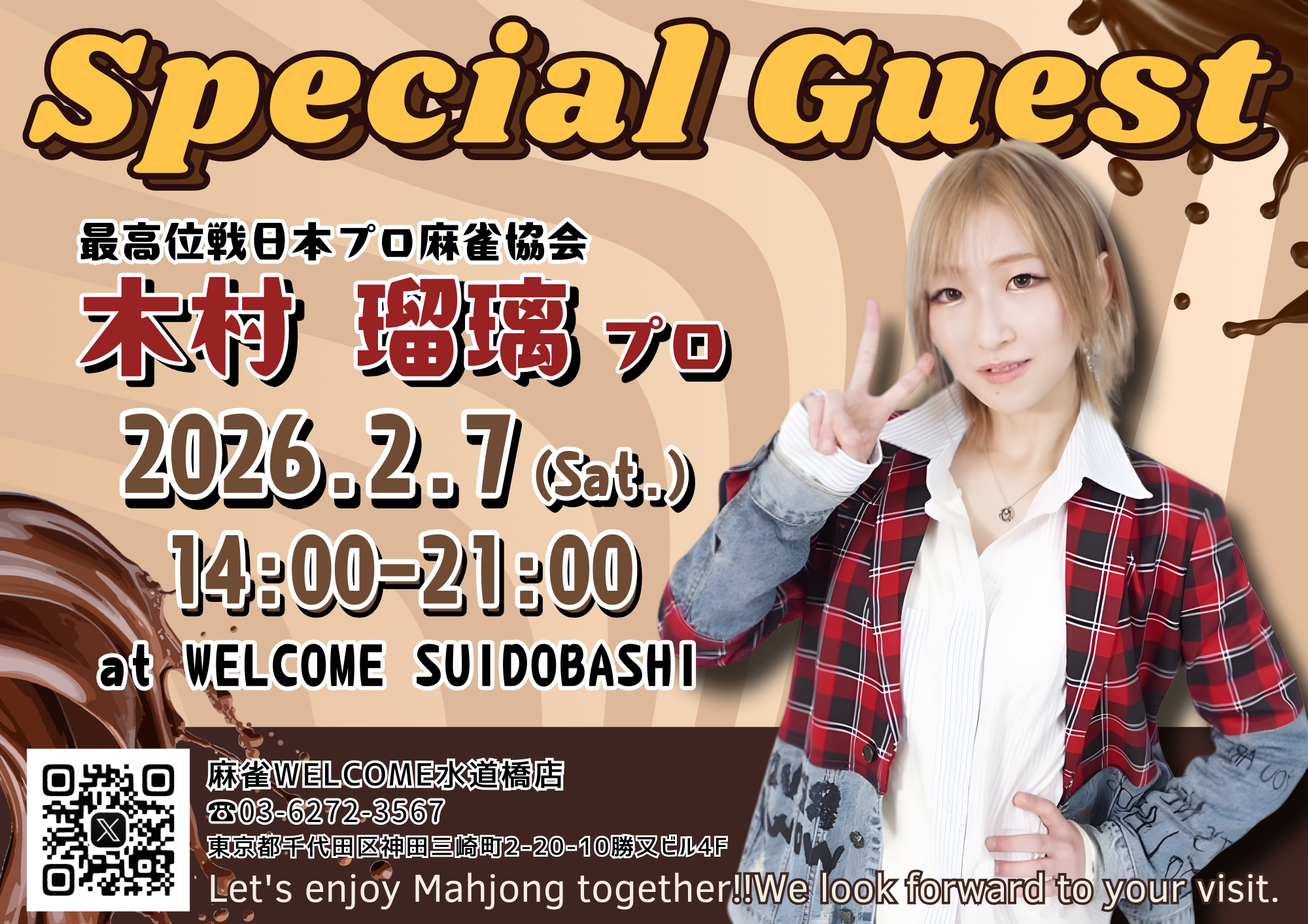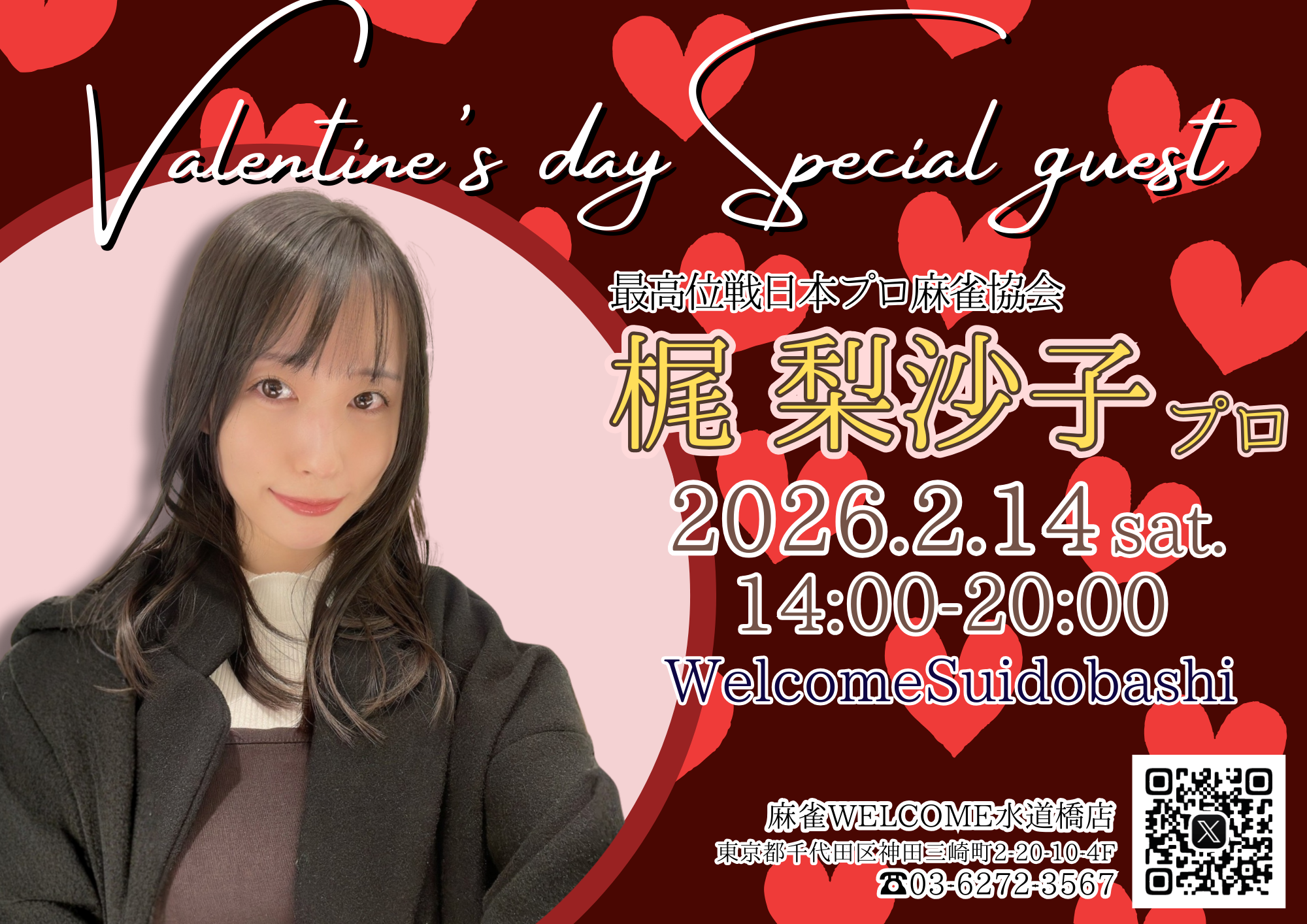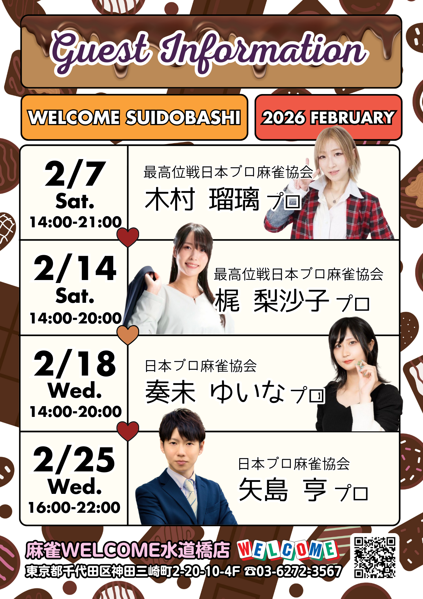 ウェルカム 水道橋店東京都 ウェルカム スイドウバシテン 東京都 水道橋駅 徒歩20秒 四麻、フリー、セット、ノーレート 電話する03-6272-3567 地図 店舗トップ ルール 写真/動画 イベント 求人 クーポン プロ イチオシ ランキング クチコミ イベント詳細 ピックアップイベント イベント ★☆★2026年2月・ゲスト来店スケジュール★☆★ 日時 : 2026年2月1日(日)~2026年2月28日(土) \2026年2月のゲスト来店スケジュール公開!!/ ◆2/7(土)14:00-21:00 木村 瑠璃 プロ【最高位戦日本プロ麻雀協会】 ◇2/14(土)14:00-20:00 梶 梨沙子 プロ【最高位戦日本プロ麻雀協会】 ◆2/18(水)14:00-20:00 奏未 ゆいな プロ【日本プロ麻雀協会】 ◇2/25(水)16:00-22:00 矢島 亨 プロ【日本プロ麻雀協会】 同卓等の詳細につきましては店舗までお問い合わせください。 ご来店心よりお待ちしております♪ イベント ご新規様【10ゲーム半額券】進呈! 固定イベント 新しく生まれ変わったウェルカム水道橋店のノーレートフリー麻雀に初めて遊びに来て下さったお客様に10ゲーム半額券を差し上げます。 有効期限はありませんので、2回目のご来店からいつでもご利用いただけます。 リニューアルしたウェルカム水道橋店のフリー麻雀をまずはお得にお楽しみ下さい♪ イベント 【ゲスト来店】木村瑠璃プロ(最高位戦日本プロ麻雀協会)来店! 日時 : 2026年2月7日(土)~2026年2月7日(土) 最高位戦日本プロ麻雀協会の木村瑠璃プロがゲスト来店します♪ ★☆★2/7(土)14時から21時★☆★ 皆様のご来店心よりお待ちしております! 詳細は店舗までお問い合わせください。 イベント 【ゲスト来店】梶梨沙子プロ(最高位戦日本プロ麻雀協会)来店! 日時 : 2026年2月14日(土)~2026年2月14日(土) 最高位戦日本プロ麻雀協会の梶梨沙子プロがゲスト来店します♪ ★☆★2/14(土)14時から20時★☆★ 皆様のご来店心よりお待ちしております! 詳細は店舗までお問い合わせください。 イベント 【ゲスト来店】奏未ゆいなプロ(日本プロ麻雀協会)来店! 日時 : 2026年2月18日(水)~2026年2月18日(水) 日本プロ麻雀協会の奏未ゆいなプロがゲスト来店します♪ ★☆★2/18(水)14時から20時★☆★ 皆様のご来店心よりお待ちしております! 詳細は店舗までお問い合わせください。 さらに読み込む... 次の6件〜6件/全6件の検索 お店のコトを友達に教える Facebook X(旧Twitter) Line Mail お店を評価する 閉店・休業・移転・情報違い報告 クチコミ投稿 報告内容詳細※必須 閉店 休業 移転 情報違い 送信する