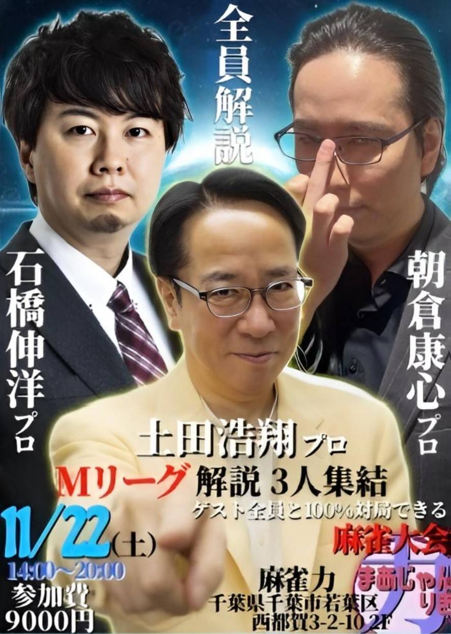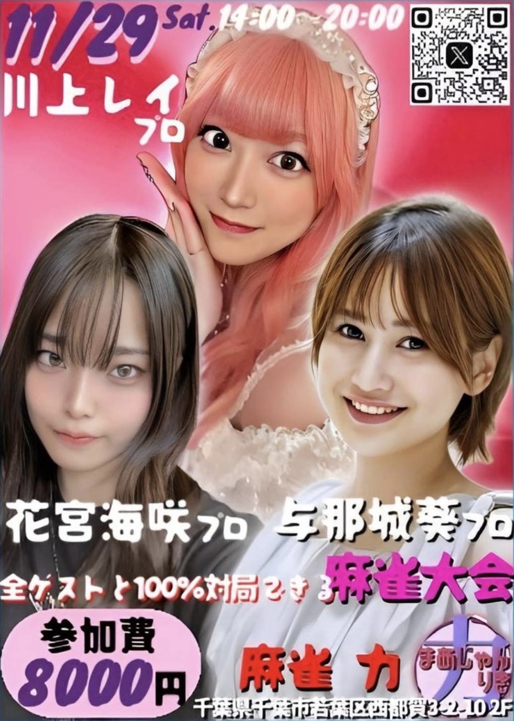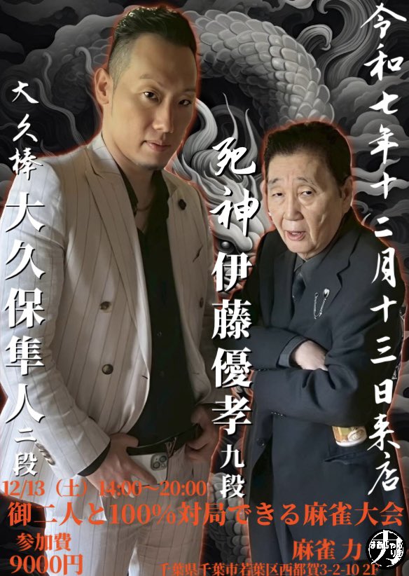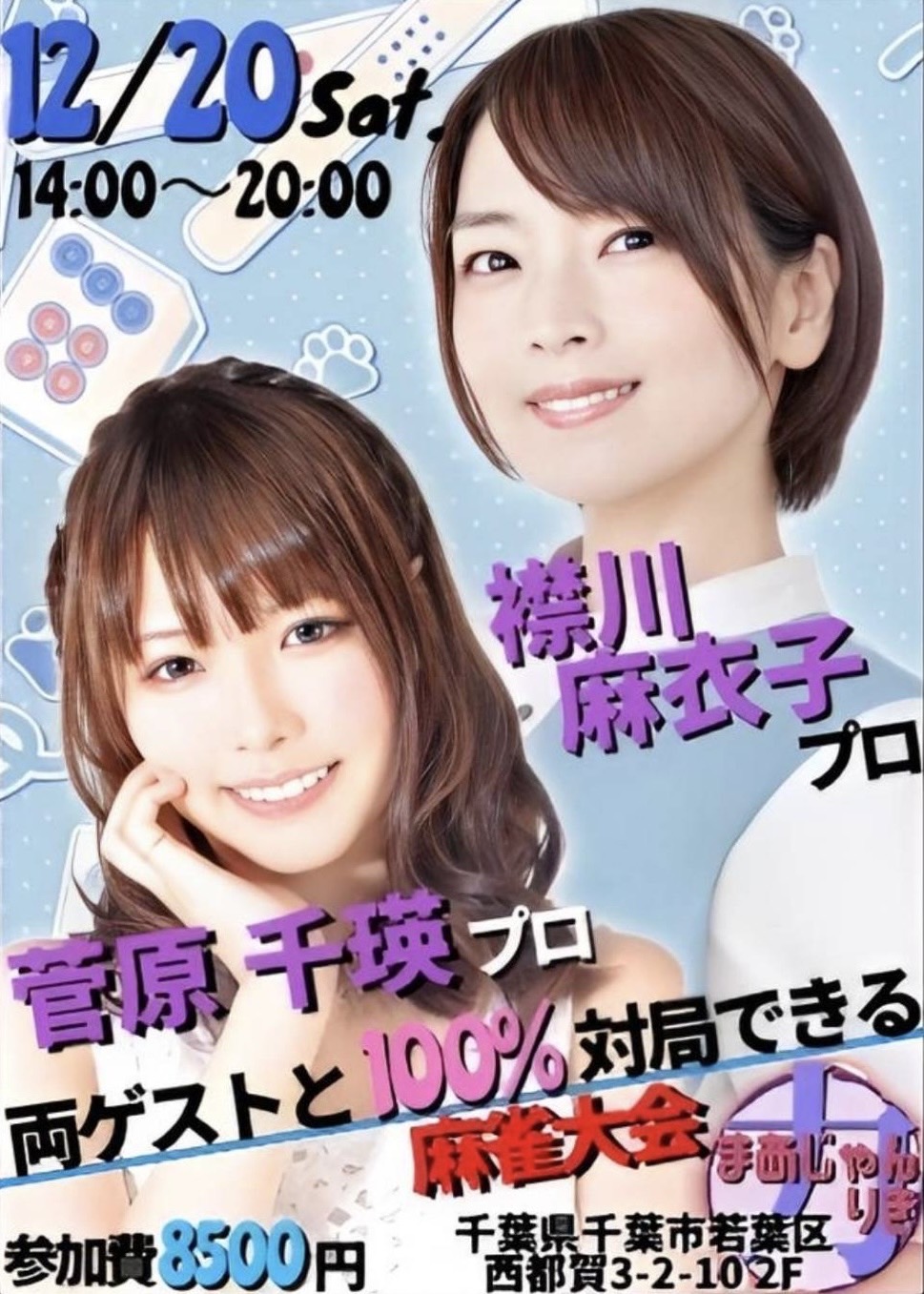 麻雀 力(りき)千葉県 マージャン リキ 千葉県 都賀駅 西口から徒歩30秒 ノーレート、フリー、セット、麻雀教室 電話する043-287-9944 地図 店舗トップ ルール 写真/動画 イベント 求人 クーポン プロ イチオシ ランキング クチコミ イベント詳細 イベント 菅原千瑛プロ&襟川麻衣子プロと100%対局できる麻雀大会🀄 日時 : 2025年12月20日(土)~2025年12月20日(土) 日本プロ麻雀連盟より 菅原千瑛プロ & 襟川麻衣子プロ がご来店! お二人と必ず同卓できます。 こちらのイベントは完売となっております。 イベント 死神&大久棒と100%打てる麻雀大会🀄 日時 : 2025年12月13日(土)~2025年12月13日(土) 日本プロ麻雀連盟より 伊藤優孝プロ & 大久保隼人プロ がご来店! お二人と必ず同卓できます! イベント ライブ付き♬.*゚女流プロ&DJ&ヒップホッパーと打てる🀄飲める🍾✴︎ .。 日時 : 2025年12月6日(土)~2025年12月6日(土) 12月の親睦会付き麻雀大会🥂 最高位戦日本プロ麻雀協会より 神田美咲プロ 日本プロ麻雀協会より 矢野恵プロ 音楽業界より 渡辺壮亮さん(嘘とカメレオン Gt.) DJ MASAKAZさん ZAK THE RUGERさん RAW-Tさん がご来店! 麻雀大会のみ、親睦会のみの参加もOK! ミニライブも開催します🎤🎼 イベント レイチェル&はなみー&よなちゃんと100%打てる麻雀大会🀄 日時 : 2025年11月29日(土)~2025年11月29日(土) 日本プロ麻雀連盟より 川上レイ プロ & 花宮海咲 プロ 日本プロ麻雀協会より 与那城葵 プロ がご来店! 御三方と必ず同卓できます。 イベント 3人の解説者と100%対局できる麻雀大会🀄 日時 : 2025年11月22日(土)~2025年11月22日(土) 最高位戦日本プロ麻雀協会より Mリーグ解説 土田浩翔プロ & 石橋伸洋プロ & 朝倉康心プロ がご来店! 御三方と必ず同卓できます。 決勝戦は実況解説付き! さらに読み込む... 次の6件〜5件/全5件の検索 お店のコトを友達に教える Facebook X(旧Twitter) Line Mail お店を評価する 閉店・休業・移転・情報違い報告 クチコミ投稿 報告内容詳細※必須 閉店 休業 移転 情報違い 送信する