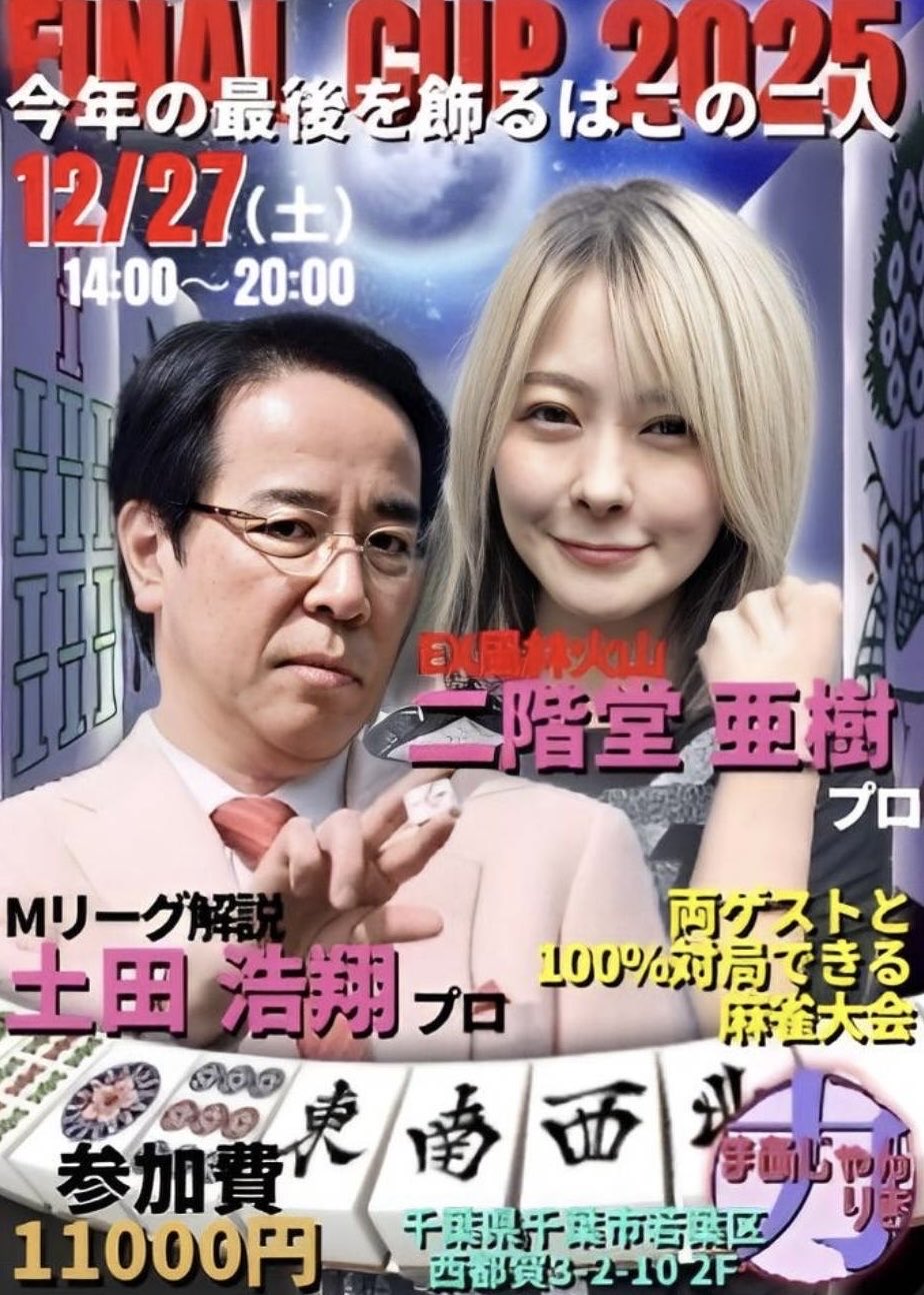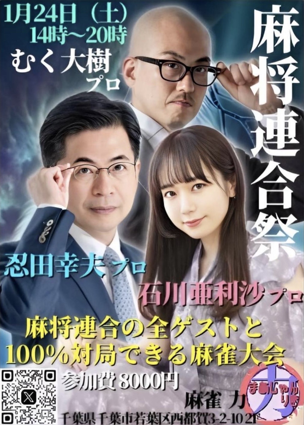 麻雀 力(りき)千葉県 マージャン リキ 千葉県 都賀駅 西口から徒歩30秒 ノーレート、フリー、セット、麻雀教室 電話する043-287-9944 地図 店舗トップ ルール 写真/動画 イベント 求人 クーポン プロ イチオシ ランキング クチコミ イベント詳細 イベント 麻将連合の御三方と100%対局できる麻雀大会🀄️ 日時 : 2026年1月24日(土)~2026年1月24日(土) 麻将連合より 忍田幸夫 プロ むく大樹 プロ 石川亜利沙 プロ がご来店! 御三方と必ず同卓できます。 イベント こうちゃん&松嶋桃pと100%対局できるクイズ出題付き麻雀大会🀄️ 日時 : 2025年1月17日(金)~2025年1月17日(金) 日本プロ麻雀連盟より こうちゃん プロ & 日本プロ麻雀協会より 松嶋桃 プロ がご来店! クイズに正解してポイントGET! 麻雀の調子がイマイチでもクイズで大逆転?! お二人と必ず同卓できます。 イベント 新津代表&かたちん&ことことと打てる🀄️&🎍新年会🎍 日時 : 2026年1月10日(土)~2026年1月10日(土) 🎍2026年新年会🎍 最高位戦日本プロ麻雀協会より 新津潔 代表 園部琴子 プロ 梶田琴理 プロ & 漫画家 片山まさゆき 先生 がご来店! ゲストと打てる🀄️&飲める🍻新年会付き麻雀大会🥳 麻雀大会のみ、新年会のみの参加もOK! イベント 二階堂亜樹プロ&土田浩翔プロと100%対局できる麻雀大会🀄️ 日時 : 2025年12月27日(土)~2025年12月27日(土) 日本プロ麻雀連盟より 二階堂亜樹プロ & 最高位戦日本プロ麻雀協会より 土田浩翔プロ がご来店! お二人と必ず同卓できます。 こちらのイベントは完売となっております。 イベント グランプリ観戦&親睦会付き麻雀大会🚤 日時 : 2025年12月21日(日)~2025年12月21日(日) 最高位戦日本プロ麻雀協会より 茅森早香プロ & 日本プロ麻雀協会より 齊藤しょあプロ & 森川茉莉プロ がご来店! 飲み放題&食事付き親睦会と ボートレース🚤グランプリ観戦も📺 さらに読み込む... 次の6件〜6件/全6件の検索 お店のコトを友達に教える Facebook X(旧Twitter) Line Mail お店を評価する 閉店・休業・移転・情報違い報告 クチコミ投稿 報告内容詳細※必須 閉店 休業 移転 情報違い 送信する
