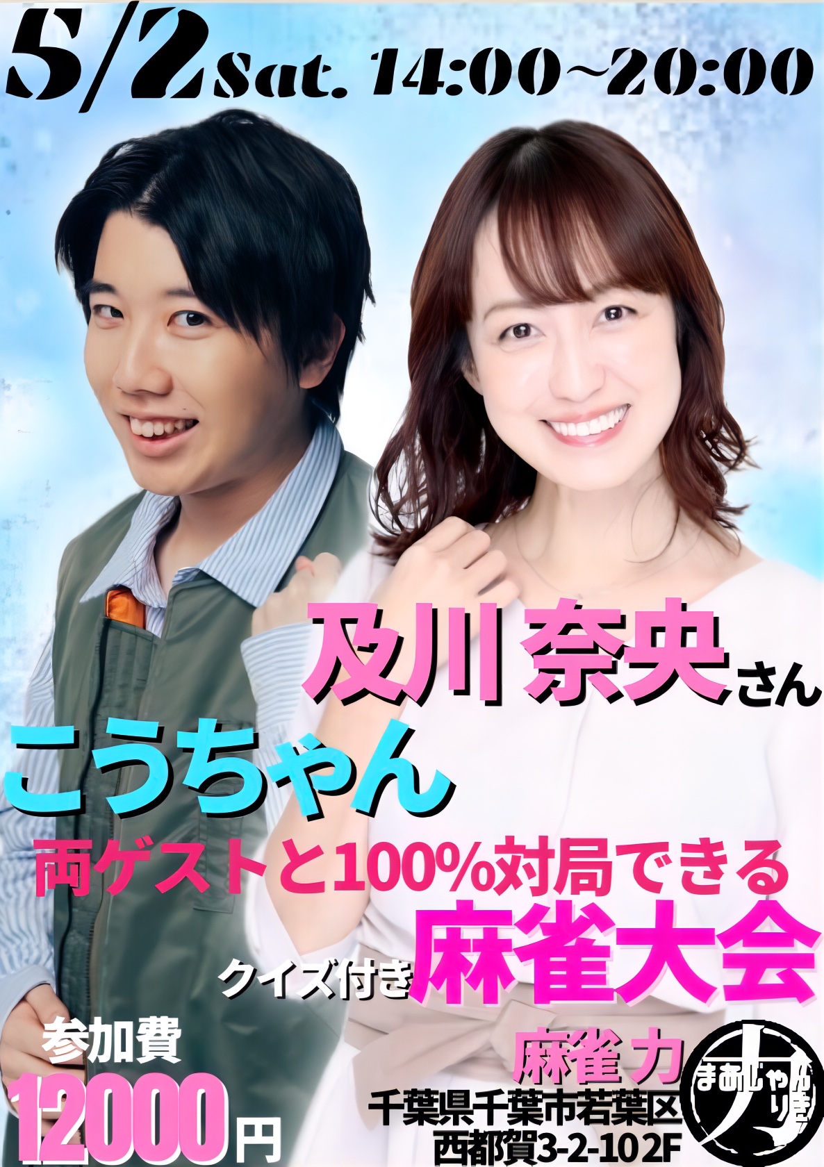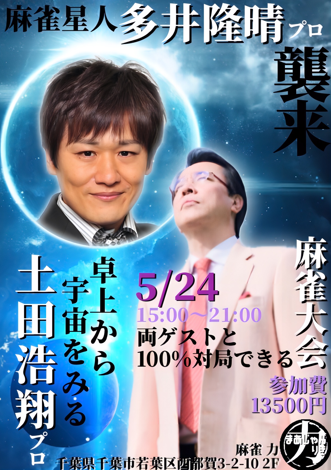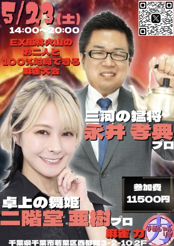 麻雀 力(りき)千葉県 マージャン リキ 千葉県 都賀駅 西口から徒歩30秒 ノーレート、フリー、セット、麻雀教室 電話する043-287-9944 地図 店舗トップ ルール 写真/動画 イベント 求人 クーポン プロ イチオシ ランキング クチコミ イベント詳細 イベント 多井隆晴プロ&土田浩翔プロと100%対局できる麻雀大会🀄 日時 : 2026年5月24日(日)~2026年5月24日(日) 渋谷ABEMAS所属 多井隆晴プロ & Mリーグ解説 土田浩翔プロ がご来店! お二人と必ず同卓できます。 こちらのイベントは完売となっております。 イベント EX風林火山の亜樹監督&永井プロと100%対局できる麻雀大会🀄️ 日時 : 2026年5月23日(土)~2026年5月23日(土) EX風林火山 二階堂亜樹プロ 永井孝典プロ がご来店! お二人と必ず同卓できます。 こちらのイベントは完売となっております。 イベント セガサミーフェニックスのお二人と100%対局できる麻雀大会🀄️ 日時 : 2026年5月16日(土)~2026年5月16日(土) セガサミーフェニックス所属 醍醐大 プロ & 浅井堂岐 プロ がご来店! お二人と必ず同卓できます! イベント こうちゃん&及川奈央さんとクイズ付き麻雀大会🀄️ 日時 : 2026年5月2日(土)~2026年5月2日(土) 日本プロ麻雀連盟より こうちゃん プロ & 女優 及川奈央さん がご来店! クイズに正解してクイズポイントGET‼️ お二人と必ず同卓できます! イベント 協会のトリプルゲストと打てる🀄️飲める🍾親睦会付き麻雀大会🥳 日時 : 2026年4月29日(水)~2026年4月29日(水) 4月の親睦会付き麻雀大会は2回あります🥳 日本プロ麻雀協会より 矢島亨 プロ 逢坂なつみ プロ 関口舞 プロ がご来店! 麻雀大会のみ、親睦会のみの参加もOK🙆♀️ さらに読み込む... 次の6件〜9件/全9件の検索 お店のコトを友達に教える Facebook X(旧Twitter) Line Mail お店を評価する 閉店・休業・移転・情報違い報告 クチコミ投稿 報告内容詳細※必須 閉店 休業 移転 情報違い 送信する