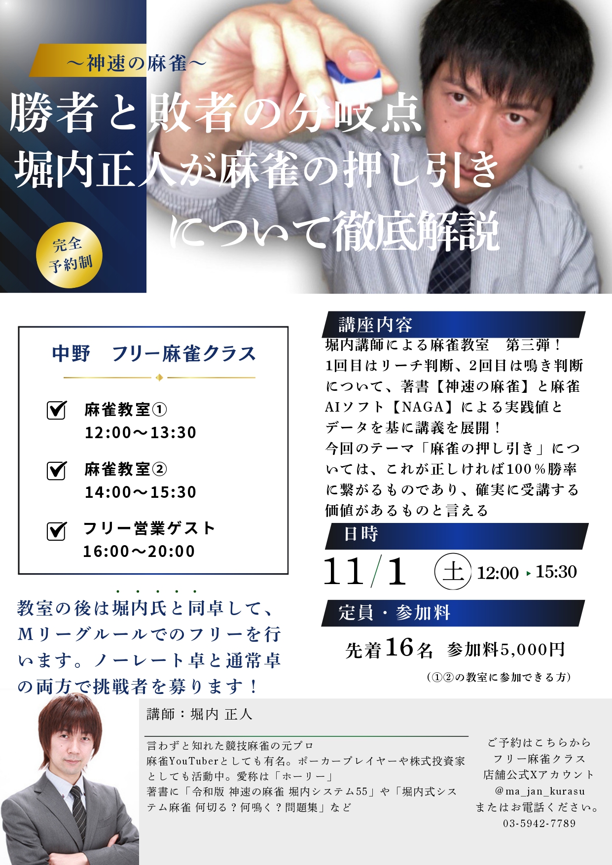 麻雀教室(フリーマージャンクラス)東京都 フリーマージャンクラス 東京都 中野駅 徒歩3分 四麻、麻雀教室、セット、フリー 電話する03-5942-7789 地図 店舗トップ ルール 写真/動画 イベント 求人 クーポン プロ イチオシ ランキング クチコミ 写真一覧 動画一覧 https://youtu.be/21glrS35Zp4?si=tPQ4gUZMrp55PlkW お店のコトを友達に教える Facebook X(旧Twitter) Line Mail お店を評価する 閉店・休業・移転・情報違い報告 クチコミ投稿 報告内容詳細※必須 閉店 休業 移転 情報違い 送信する