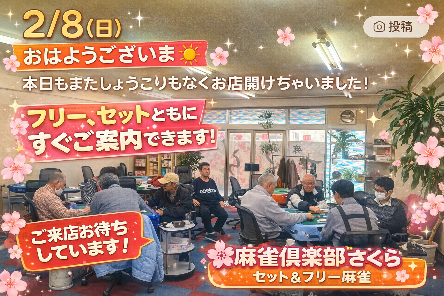 麻雀倶楽部さくら福島県 マージャンクラブサクラ 四麻、セット、フリー 電話する080-6060-1086 地図 店舗トップ ルール 写真/動画 イベント 求人 クーポン プロ イチオシ ランキング クチコミ 写真一覧 動画一覧 お店のコトを友達に教える Facebook X(旧Twitter) Line Mail お店を評価する 閉店・休業・移転・情報違い報告 クチコミ投稿 報告内容詳細※必須 閉店 休業 移転 情報違い 送信する