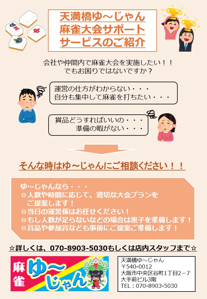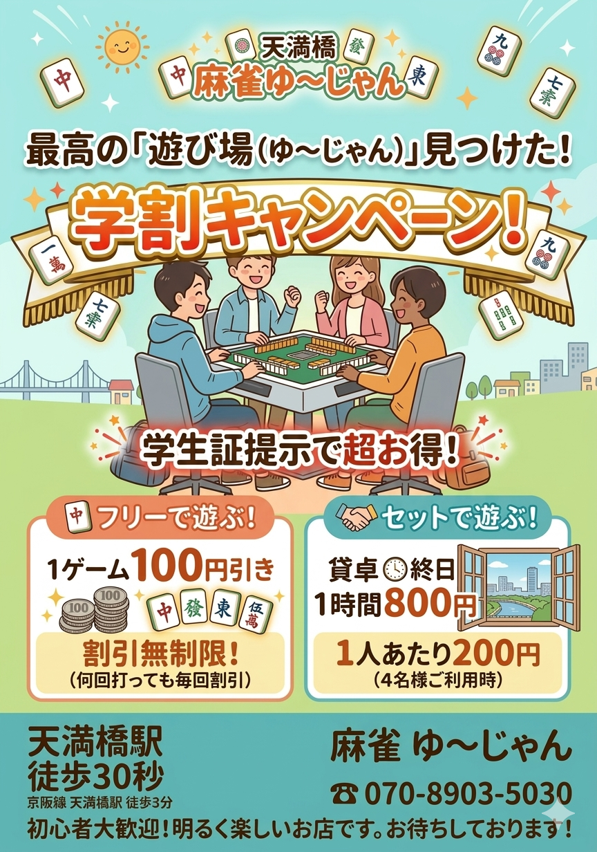 2025.10.01 オープン NEWOPEN麻雀 ゆ~じゃん大阪府 マージャンユージャン 大阪府 天満橋駅 3番出口から徒歩1分 三麻、セット、フリー 電話する070-8903-5030 地図 店舗トップ ルール 写真/動画 イベント 求人 クーポン プロ イチオシ ランキング クチコミ 写真一覧 動画一覧 お店のコトを友達に教える Facebook X(旧Twitter) Line Mail お店を評価する 閉店・休業・移転・情報違い報告 クチコミ投稿 報告内容詳細※必須 閉店 休業 移転 情報違い 送信する