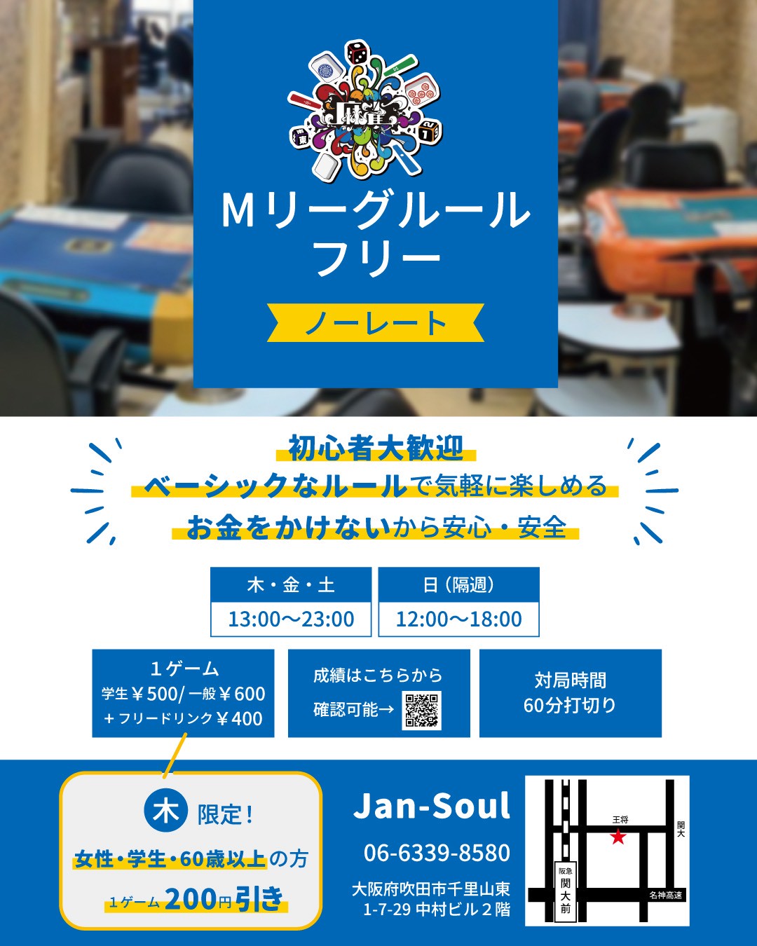 Jan-Soul (ジャンソウル)大阪府 ジャンソウル 大阪府 関大前駅 徒歩5分 セット、健康麻雀、麻雀教室、ノーレート、三麻、フリー、四麻 電話する06-6339-8580 地図 店舗トップ ルール 写真/動画 イベント 求人 クーポン プロ イチオシ ランキング クチコミ 写真一覧 動画一覧 お店のコトを友達に教える Facebook X(旧Twitter) Line Mail お店を評価する 閉店・休業・移転・情報違い報告 クチコミ投稿 報告内容詳細※必須 閉店 休業 移転 情報違い 送信する