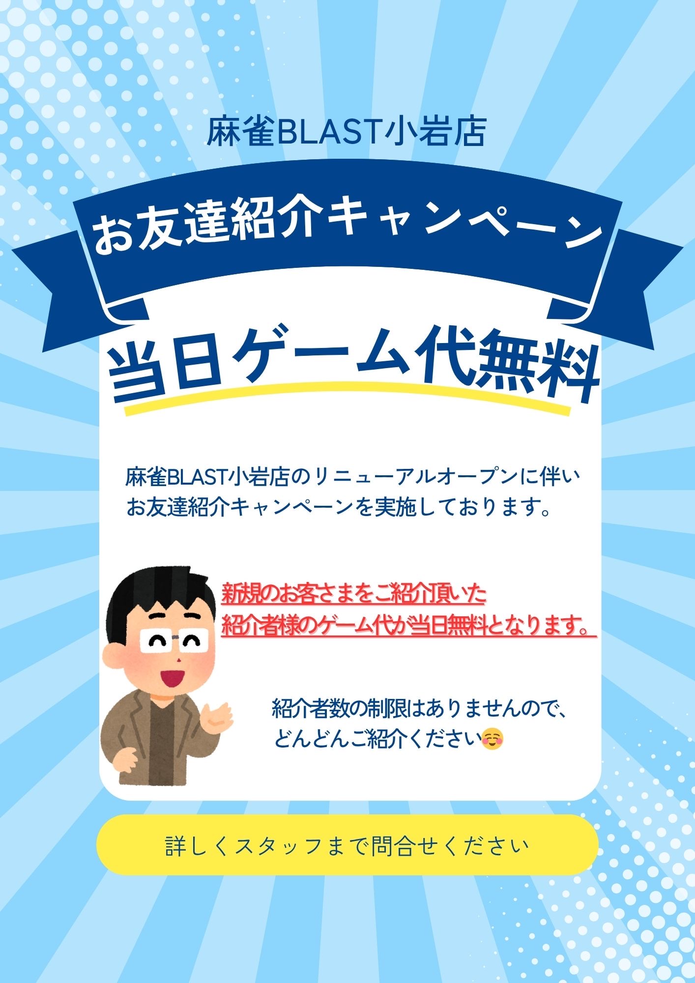 麻雀BLAST 小岩店東京都 マージャンブラストコイワテン 東京都 小岩駅 南口徒歩3分 三麻、フリー、セット、その他 電話する03-6657-8188 地図 店舗トップ ルール 写真/動画 イベント 求人 クーポン プロ イチオシ ランキング クチコミ イチオシ詳細 イチオシ 1 2025年11月リニューアルオープン🀄 関東サンマフリー店として生まれ変わりました🐟 イチオシ 2 新規ご来店サービス実施中✨ 新規のお客様をご紹介いただくと、ご紹介社様のゲーム代がなんと当日無料に?! 御新規のお客様については、 2回めのご来店→1,000円キャッシュバック 3回めのご来店→2,000円キャッシュバックのサービス♪ イチオシ 3 小岩駅南口から徒歩3分の好立地🚉 小岩駅南口から徒歩3分の好立地🚉 お店のコトを友達に教える Facebook X(旧Twitter) Line Mail お店を評価する 閉店・休業・移転・情報違い報告 クチコミ投稿 報告内容詳細※必須 閉店 休業 移転 情報違い 送信する