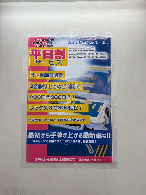 麻雀 ファミリー(セット専門店)東京都 マージャン ファミリー ミタカキタグチテン 東京都 三鷹駅 三鷹駅・北口徒歩1分 四麻、セット、健康麻雀、三麻 電話する0422-37-0670 地図 店舗トップ ルール 写真/動画 イベント 求人 クーポン プロ イチオシ ランキング クチコミ イチオシ詳細 イチオシ 1 超お得平日割 月~金限定 4名様の場合400円が300円に! レックス3も300円 ※要予約 ※お一人様/1時間 イチオシ 3 うどんそば無料サービス! 来店2時間以上でうどんそばを無料サービス中♪ お店のコトを友達に教える Facebook X(旧Twitter) Line Mail お店を評価する 閉店・休業・移転・情報違い報告 クチコミ投稿 報告内容詳細※必須 閉店 休業 移転 情報違い 送信する