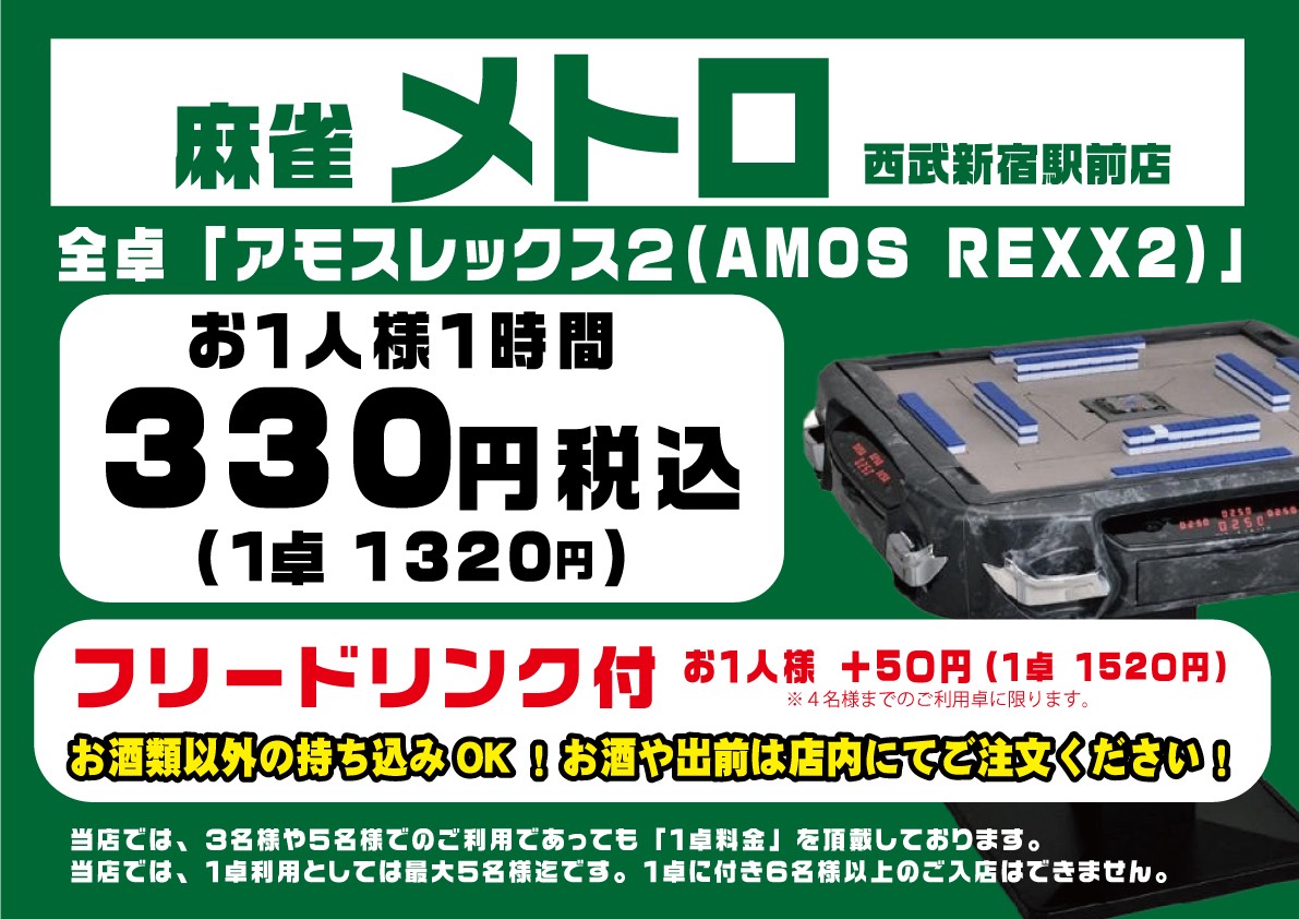 麻雀メトロ 西武新宿駅前店東京都 マージャンメトロ セイブシンジュクエキマエテン 東京都 西武新宿駅 徒歩30秒 四麻、三麻、セット 電話する03-6457-3211 地図 店舗トップ ルール 写真/動画 イベント 求人 クーポン プロ イチオシ ランキング クチコミ 総合 麻雀メトロ 西武新宿駅前店 3.0 5 1 ? 点数について 1件 詳細 雀荘クチコミの点数概要 クチコミの点数は、総合点数を中心に、全部で11項目あります。 12項目は「雀荘の営業形態についての項目」と「その他の環境についての項目」の2つにわかれます。 総合スコア (計11項目) 営業形態点数 (6項目) 雀荘の営業形態についての点数 フリー セット 健康麻雀 麻雀教室 ノーレート 三麻 その他の環境点数 (5項目) 雀荘の設備、その他の環境についての点数 設備 接客 居心地 CP(コストパフォーマンス)・清潔感 ※麻雀王国雀荘検索のクチコミの点数は、当社独自の基準に基づく評価であり、雀荘の価値を何ら保証するものではあ りません。あくまでの一つの参考としてご活用ください。 雀荘クチコミ点数の算出方法要 クチコミの点数は、「ユーザー評価」に独自のアルゴリズムで掛け合わせて算出しております。 麻雀王国では、日々信頼性の高い点数を追及し、微調整を行っております。 ユーザー評価 個人が付けた点数 (雰囲気、感性、感覚、状況、主観など) フリー- セット3.0 健康麻雀- 麻雀教室- ノーレート- 三麻3.0 設備 3.0 | 接客 3.0 | 居心地 3.0 | CP(コストパフォーマンス) 3.0 | 清潔感 3.0 セット ¥330/般 メトログループ 長期契約安心店舗 全国* 東京都* 🀄セット専門店🀄 お1人様 ¥330(1卓1時間¥1,320)フリードリンク無し お1人様 ¥380(1卓1時間¥1,520)フリードリンク付 ※土日祝料金・特別料金等は頂いておりません。 平日の8時~14時までは1時間1卓4名様¥1,000でご利用できます。 (30分¥500) 特別営業の為、クレジット決済または電子マネー決済のみのご利用となります。 ※現金でのご利用は出来ません。 ※各種サービスはございません。 ※他の割引サービスとの併用は出来ません。(新規半額のご利用は出来ません。) ゲーム代半額キャンペーン中!『1卓1時間660円』 □┓ 麻雀メトロ 西武新宿駅前店・市川店イベント ┗┛━…‥‥…━…‥‥…━…‥‥… ★━┳━┳━┳━┳━┓ ┃新┃規┃限┃定┃☆┃ ┣━┻━┻━┻━┻━★ 《月~木限定》※祝前日・金土日祝日は除く 【キャンペーン価格】 配牌卓1卓1時間660円!(通常1,320円) ご利用時間の制限無し! この機会にぜひ麻雀メトロをお試しください。 スタッフ一同皆様のご来店をお待ちしております。 【ご利用にあたって】 1.店舗を始めてご利用の際に限ります。 2.下記に記載の合言葉をご来店時にスタッフお伝えください。 3.お名前とお電話番号を控えさせていただきます。 4.お名前を確認できる身分証等を確認させていただきます。 5.他の割引サービス等との併用は不可とさせていただきます。 6.来店時に必ずもう一度スタッフに新規割とお伝えください。 ※上記1~6項目を行わなかった場合、新規割引は適用されません。 合言葉は「王国」です♪ ※予告無く内容が変更又は終了となる場合がございますので、詳しくはスタッフ又はお電話にてお問い合わせくださいますようお願いいたします。 御予約は受付ておりませんので、当日スタッフにお知らせくださいますようお願いいたします。 強力換気で営業しております!! クレジット・交通系IC決算を導入いたしました。 メトロプラザ6ビルの建物内にエレベーター完備! ウォシュレット、大型テレビ2台完備。 ひざ掛け、携帯充電ケーブルのご用意ございます。 ※平日のお問合せは14時以降でお願いいたします。 全日フリードリンク付きで、 1時間¥380(1卓¥1,520)でご利用頂けます!! ※クレジット決済・電子マネー決済可(出前は不可) 《フリードリンクメニュー》 COLD:コカ・コーラ/スプライト/アイスコーヒー アイスティー/烏龍茶/ジャスミン茶 HOT:コーヒー/レモンティー/ココア/緑茶 ※飲み物はお席までお持ち致します。 《有料ソフトドリンク》 コカ・コーラ各種¥250 ミルクココア・ブルーベリー・充実野菜 各種¥150 レッドブル ¥300 《アルコール》各種¥500 瓶ビール(¥600)ハイボール、レモンサワー ウーロンハイ、ウイスキー(ロック、水、ソーダ) 黒霧島・いいちこ(ロック、水、ソーダ) 持ち込み有(※アルコール類は除く)で安心! ただいま会員募集中です! 続きを見る 閉じる お店のイチオシポイント イチオシ 1 +50円でフリードリンク付き!駅を降りて目の前のビルです! 【飲み放題メニュー】コカ・コーラ スプライト/アイスコーヒー アイスティー/ホットコーヒー 烏龍茶/ジャスミン茶/ホットレモンティー ホットココア/温かい緑茶 アルコール類以外の持ち込み可!! イチオシ 2 お得な会員カード発行中 来店時に1ポイント50円、10ポイント貯めて500円の割引サービスをいたします。 ※1ポイントからのご利用も可能です。 イチオシ 3 10時間やったで賞!はじめました! 10時間以上のご利用で 次回1時間