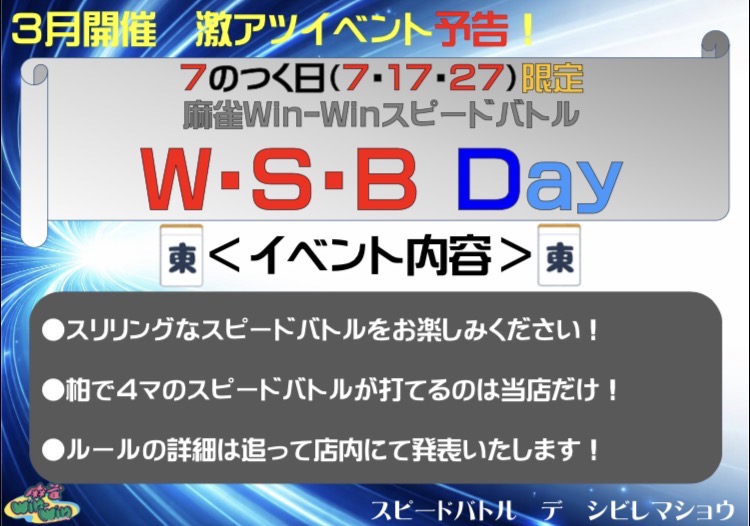 麻雀 win-win千葉県 マージャン ウィンウィン 千葉県 柏駅 徒歩3分 電話する0471-89-7766 地図 店舗トップ ルール 写真/動画 イベント 求人 クーポン プロ イチオシ ランキング クチコミ 総合 麻雀 win-win 3.0 5 2 ? 点数について 2件 詳細 雀荘クチコミの点数概要 クチコミの点数は、総合点数を中心に、全部で11項目あります。 12項目は「雀荘の営業形態についての項目」と「その他の環境についての項目」の2つにわかれます。 総合スコア (計11項目) 営業形態点数 (6項目) 雀荘の営業形態についての点数 フリー セット 健康麻雀 麻雀教室 ノーレート 三麻 その他の環境点数 (5項目) 雀荘の設備、その他の環境についての点数 設備 接客 居心地 CP(コストパフォーマンス)・清潔感 ※麻雀王国雀荘検索のクチコミの点数は、当社独自の基準に基づく評価であり、雀荘の価値を何ら保証するものではあ りません。あくまでの一つの参考としてご活用ください。 雀荘クチコミ点数の算出方法要 クチコミの点数は、「ユーザー評価」に独自のアルゴリズムで掛け合わせて算出しております。 麻雀王国では、日々信頼性の高い点数を追及し、微調整を行っております。 ユーザー評価 個人が付けた点数 (雰囲気、感性、感覚、状況、主観など) フリー3.0 セット- 健康麻雀- 麻雀教室- ノーレート- 三麻- 設備 3.0 | 接客 3.0 | 居心地 3.0 | CP(コストパフォーマンス) 3.0 | 清潔感 3.0 フリー ¥600/般 セット ¥300/般 長期契約安心店舗 全国* 千葉県16位 【千葉県柏市・柏駅】麻雀 win-winは、フリー・セットが楽しめる雀荘です。 【✨柏駅徒歩3分・2025年9月5日4周年を迎えます✨】 ・麻雀を通して社交場の提供致します✨ ・綺麗な店内で楽しくご遊技いただけます!☆ ・フリー4人麻雀&セットのお店です♪ ・カジュアルで明るく、女性、学生、ご新規様大歓迎❗️ ・フリーデビューの方も安心してご来店ください😊 ・マナー地域No.1‼️(を、目指しております) ・フリードリンク&フード無料🤩 ・友人紹介キャンペーン実施中✨ 新規様だけでなく紹介して頂いた方にも特典があります‼️ ・一緒に働いてくれる方大募集‼️ メンバーはゲーム代フルバックの好待遇‼️ 詳しくは求人ページ、もしくは店舗に直接問い合わせしてください✨️ 驚異の還元率!!! ✨ご新規様には3000G以上の特典プレゼント ✨人気女流プロ・YouTuberも続々来店‼️ ✨火曜日女流プロ、他男性プロ1名常勤 セット様も大歓迎!! フリードリンク付き1卓1h1200円です☆フリードリンク 更にお一人様1食フードサービス アルコールの持ち込み不可 店内Wi-Fiアリ、マスク、消毒液、体温計アリ。 続きを見る 閉じる お店のイチオシポイント イチオシ 1 7の付く日限定イベント 柏で唯一楽しめるスピードバトル開催🔥 普段と違った麻雀が楽しめる1日となっております✨ イチオシ 2 2026年3月ゲスト来店✨ 2026年3月13日(金)15〜21時 RMU所属 『彩世来夏』プロゲスト来店✨ イチオシ 3 麻雀スクール 2月よりネット麻雀のみ、麻雀に興味はあるけどリアル麻雀に触れたことがない人や、フリー初心者などを対象に麻雀講座を実施致します♪ お店のコトを友達に教える Facebook X(旧Twitter) Line Mail お店を評価する 閉店・休業・移転・情報違い報告 クチコミ投稿 報告内容詳細※必須 閉店 休業 移転 情報違い 送信する 最新情報 2026年3月9日(月) イベント ✨✨win-win イベント情報②✨✨ 7の付く日限定イベント‼️ スピードバトル開催🔥 普段とは違った麻雀が楽しめる✨ 「ネット予約」&「チェックイン」で 来店人数×100Gもらえる! ログイン ご予約情報入力 来店日※ 2013年12月31日(火) 卓数※ 12345678910卓 予定開始※ 1:00 2:00 3:00 4:00 5:00 6:00 7:00 8:00 9:00 10:00 11:00 12:00 13:00 14:00 15:00 16:00 17:00 18:00 19:00 20:00 21:00 22:00 23:00 24:00 予定終了※ 1:00 2:00 3:00 4:00 5:00 6:00 7:00 8:00 9:00 10:00 11:00 12:00 13:00 14:00 15:00 16:00 17:00 18:00 19:00 20:00 21:00 22:00 23:00 24:00 お名前※ 携帯TEL※ メール※ ルール※ 四麻 三麻 点数※ 25000点 30000点 赤枚数※ 赤5マン01234 赤5ピン01234 赤5ソー01234 その他 チップ 焼鳥 備考 予約する クチコミ 投稿する 麻雀 win-win 千葉県 柏駅 トイレが綺麗で、店員さんも愛想良し、マナー良しでした^^ 2021/11/24 (2021/11訪問) ゲスト さんのクチコミ 総合 5.0 麻雀 win-win 千葉県 柏駅 柏では珍しい、とても清潔でマナーの良い店 2021/10/23 (2021/10訪問) ゲスト さんのクチコミ 総合 5.0 お店独自のHP・ソーシャル X (旧twitter) お店の情報詳細 店名 麻雀 win-win 住所 〒277-0852 [地図] 千葉県柏市旭町1-4-15 前沢ビル2階 電話 0471-89-7766 交通手段 JR常磐線(上野~取手) 柏駅 徒歩3分 東武アーバンパークライン 柏駅 徒歩3分 柏駅西口旭通りをまっすぐ進んでいただくと右手にあります。(麺屋こうじが1階のビルの2階です。) 営業時間 8:00~24:00 定休日 年中無休 営業内容 ゲーム代(フリー) ¥600/般 [東南戦] ゲーム代(セット) ¥300/般 ゲーム代(健康麻雀) ゲーム代(麻雀教室) その他の料金 オープン日 2021年9月5日 初投稿者 ゲスト お店のサービス・システム・設備 総卓数 5卓 卓種 点数表示付全自