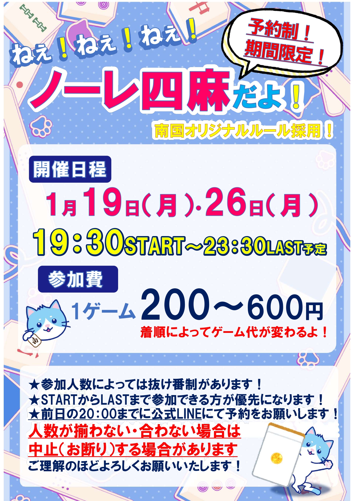 まーじゃん 南国山口県 マージャンナンゴク 山口県 湯田温泉駅 徒歩5分 三麻、ノーレート、麻雀教室、セット、フリー 電話する080-6161-7059 地図 店舗トップ ルール 写真/動画 イベント 求人 クーポン プロ イチオシ ランキング クチコミ 総合 まーじゃん 南国 3.0 5 2 ? 点数について 2件 詳細 雀荘クチコミの点数概要 クチコミの点数は、総合点数を中心に、全部で11項目あります。 12項目は「雀荘の営業形態についての項目」と「その他の環境についての項目」の2つにわかれます。 総合スコア (計11項目) 営業形態点数 (6項目) 雀荘の営業形態についての点数 フリー セット 健康麻雀 麻雀教室 ノーレート 三麻 その他の環境点数 (5項目) 雀荘の設備、その他の環境についての点数 設備 接客 居心地 CP(コストパフォーマンス)・清潔感 ※麻雀王国雀荘検索のクチコミの点数は、当社独自の基準に基づく評価であり、雀荘の価値を何ら保証するものではあ りません。あくまでの一つの参考としてご活用ください。 雀荘クチコミ点数の算出方法要 クチコミの点数は、「ユーザー評価」に独自のアルゴリズムで掛け合わせて算出しております。 麻雀王国では、日々信頼性の高い点数を追及し、微調整を行っております。 ユーザー評価 個人が付けた点数 (雰囲気、感性、感覚、状況、主観など) フリー3.0 セット3.0 健康麻雀- 麻雀教室- ノーレート- 三麻3.0 設備 3.0 | 接客 3.0 | 居心地 3.0 | CP(コストパフォーマンス) 3.0 | 清潔感 3.0 フリー ¥300/般 全国* 山口県1位 【山口県山口市・湯田温泉駅】まーじゃん 南国は、三麻・ノーレート・麻雀教室・セット・フリーが楽しめる雀荘です。 🌟お知らせ🌟 お待たせしました! 11月22日移転オープンです! ありがとうございます(嬉´Д`嬉) おかげさまで、2023年7月1日でまーじゃん南国は10周年を迎えることができました! 3人打ちフリーお一人様大歓迎! 毎週水曜日19:00~ノーレートフリー開催中! 学生さんからお年寄りまで年齢層は幅広く遊びに来れるアットホームなお店です(*´ω`*) 全卓Mリーグでお馴染みの『AMOS REXX III』導入!!! 最新卓でご遊戯いただけます♪ 貸卓は個室完備でゆっくりまったり! 持ち込みもOK 充実したセルフコーナーもあります! 待ち時間は漫画コーナーでおくつろぎください! 無料駐車場25台完備!!! お車でのご来店もお待ちしておりますヽ(・ω・)/ ・貸卓のお客様の午前中のご予約OK ・全卓AMOS REXX III ・個室あり ・空気清浄機設置 ・Wi-Fi完備 ・スマホ、携帯の充電可 続きを見る 閉じる お店のイチオシポイント イチオシ 1 スタンプカードやってます✨ フリー&ノーレートフリー&貸卓のお客様 スタンプをためて特典をGETしよう!! 特典の内容は店頭にてお尋ねください! 皆様のご来店をお待ちしております✨ イチオシ 2 充実した漫画&セルフコーナー☆ 当店には充実した漫画コーナーとセルフコーナーがございます★ ぜひ、ご利用ください(*^^*) イチオシ 3 個室完備!快適な空間で麻雀をお楽しみください☆ 最新卓!『AMOS REXX III』導入済です☆ 広々した完全個室スペースがございます★ 気の合うご友人様との快適なお時間をお過ごしください(*´ω`*) お店のコトを友達に教える Facebook X(旧Twitter) Line Mail お店を評価する 閉店・休業・移転・情報違い報告 クチコミ投稿 報告内容詳細※必須 閉店 休業 移転 情報違い 送信する 最新情報 2025年7月1日(火) イベント ノーレートフリー打ち放題プラン!! ノーレートフリー打ち放題プラン始まりました!! 入場料も込みのお得なプランです! ぜひ、遊びに来てください(^_-)-☆ 「ネット予約」&「チェックイン」で 来店人数×100Gもらえる! ログイン ご予約情報入力 来店日※ 2013年12月31日(火) 卓数※ 12345678910卓 予定開始※ 1:00 2:00 3:00 4:00 5:00 6:00 7:00 8:00 9:00 10:00 11:00 12:00 13:00 14:00 15:00 16:00 17:00 18:00 19:00 20:00 21:00 22:00 23:00 24:00 予定終了※ 1:00 2:00 3:00 4:00 5:00 6:00 7:00 8:00 9:00 10:00 11:00 12:00 13:00 14:00 15:00 16:00 17:00 18:00 19:00 20:00 21:00 22:00 23:00 24:00 お名前※ 携帯TEL※ メール※ ルール※ 四麻 三麻 点数※ 25000点 30000点 赤枚数※ 赤5マン01234 赤5ピン01234 赤5ソー01234 その他 チップ 焼鳥 備考 予約する クチコミ 投稿する まーじゃん 南国 山口県 湯田温泉駅 貸卓利用。個室なのに料金が安い。居心地が良い。 2024/03/17 (2024/03訪問) ゲスト さんのクチコミ 総合 5.0 まーじゃん 南国 山口県 湯田温泉駅 セットで利用。個室広くて安いし大満足。また山口帰省時はよろしくお願いします! 2023/08/18 (2023/08訪問) ゲスト さんのクチコミ 総合 5.0 お店独自のHP・ソーシャル X (旧twitter) Instagram お店の情報詳細 店名 まーじゃん 南国 住所 〒753-0055 [地図] 山口県山口市今井町1-3 電話 080-6161-7059 交通手段 JR山口線 湯田温泉駅 徒歩5分 JR山口線湯田温泉駅の改札出て300m🌟 営業時間 12:00~24:00 [★貸卓のお客様の午前中からのご利用OK! 前日までのご予約お願いいたします☆ ★お気軽にお電話くださいませ☎] 定休日 年中無休 営業内容 三麻、ノーレート、麻雀教室、セット、フリー ゲーム代(フリー) ¥300/般 [三人麻雀/1回] 