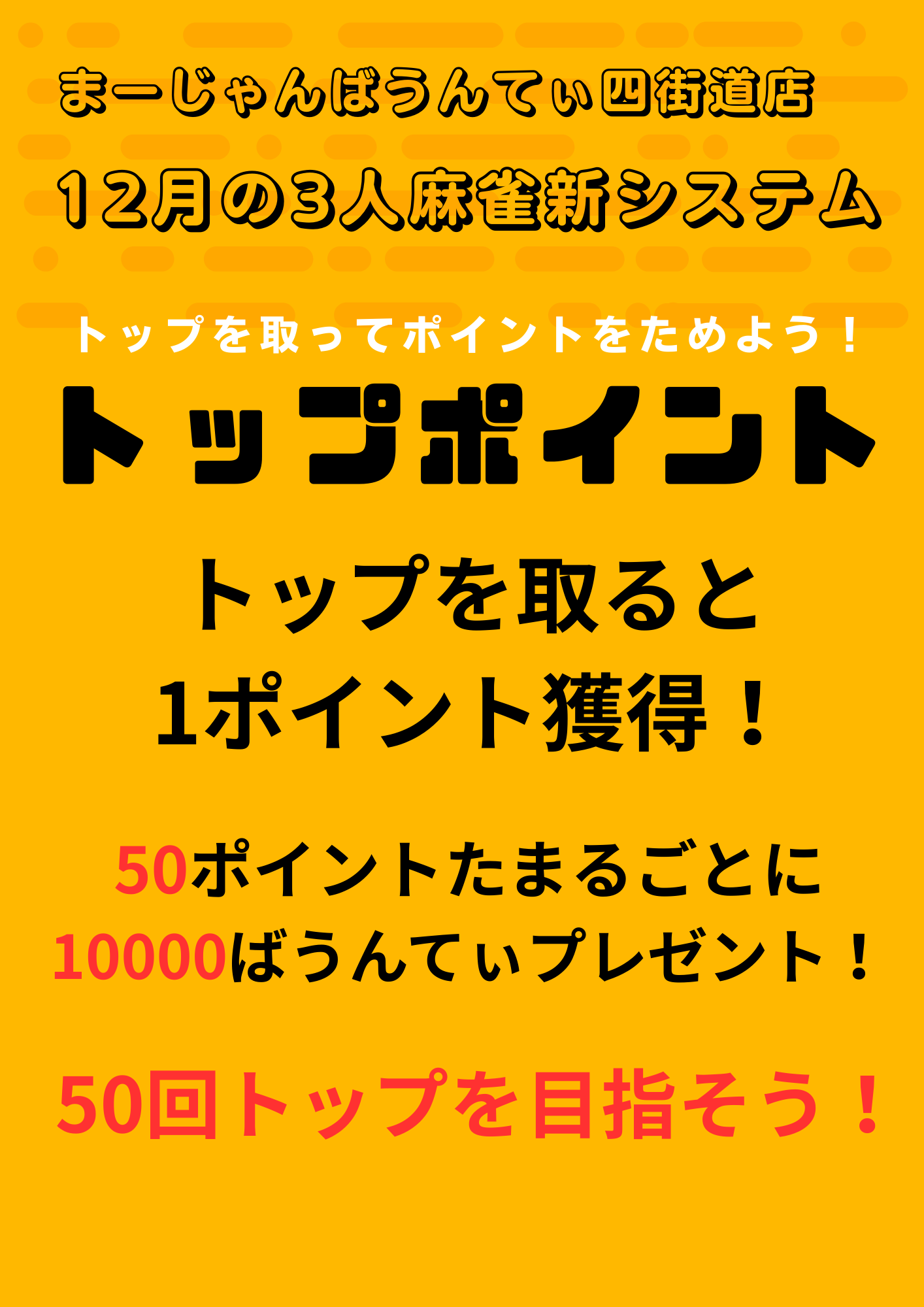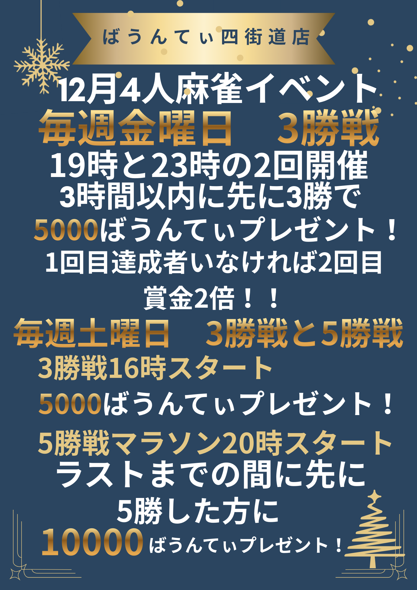 まーじゃんばうんてぃ四街道店千葉県 マージャンバウンティ 千葉県 四街道駅 徒歩30秒 四麻、三麻、セット、フリー 電話する043-309-8477 地図 店舗トップ ルール 写真/動画 イベント 求人 クーポン プロ イチオシ ランキング クチコミ 総合 まーじゃんばうんてぃ四街道店 - 5 0 ? 点数について 0件 詳細 雀荘クチコミの点数概要 クチコミの点数は、総合点数を中心に、全部で11項目あります。 12項目は「雀荘の営業形態についての項目」と「その他の環境についての項目」の2つにわかれます。 総合スコア (計11項目) 営業形態点数 (6項目) 雀荘の営業形態についての点数 フリー セット 健康麻雀 麻雀教室 ノーレート 三麻 その他の環境点数 (5項目) 雀荘の設備、その他の環境についての点数 設備 接客 居心地 CP(コストパフォーマンス)・清潔感 ※麻雀王国雀荘検索のクチコミの点数は、当社独自の基準に基づく評価であり、雀荘の価値を何ら保証するものではあ りません。あくまでの一つの参考としてご活用ください。 雀荘クチコミ点数の算出方法要 クチコミの点数は、「ユーザー評価」に独自のアルゴリズムで掛け合わせて算出しております。 麻雀王国では、日々信頼性の高い点数を追及し、微調整を行っております。 ユーザー評価 個人が付けた点数 (雰囲気、感性、感覚、状況、主観など) フリー- セット- 健康麻雀- 麻雀教室- ノーレート- 三麻- 設備 - | 接客 - | 居心地 - | CP(コストパフォーマンス) - | 清潔感 - フリー ¥600/般 セット ¥200/般 全国* 千葉県26位 ✨✨2023年12月22日OPEN✨✨ 四街道駅徒歩30秒の好立地!! 北口マクドナルドの入っているビルの5Fです! (電話受付は17時からとなっております Tel 0433098477まで) 【楽しく・真剣にフリーが打てる&激安セットのお店】 《赤6枚(各5二枚)》 ◆◇THEオーソドックスルール◆◇ ※フリーは年中無休の17時からの営業となります! 又、週末は15時からの営業となっております! ※オールマイティ牌はございません。ばうんてぃでは麻雀はみんなで楽しく和気あいあいと行うゲームだと考えております。他人のミス等を指摘しあうゲームではないと考えております。ですので基本的にチョンボは不採用としております!!麻雀初心者の方やフリー雀荘デビューの方でも安心して麻雀ができる環境となっております!ぜひ初めての方もご来店ください(^^) ⭐︎毎日3麻開催⭐︎ 平日も週末も三麻開催するようになりました!(卓状況により早い時間帯はご案内出来ないこともあります。) 赤3金1のオーソドックスルール^ ^ ばうんてぃ3麻宜しくお願いします^ ^ 8月より携帯で確認できる麻雀ばうんてぃホームページ&ポイントシステム始動致します🔥 【全店舗共通】のホームページ&ポイントシステムです♪ めちゃくちゃ見やすく自身のデータが丸わかりとなっております‼ 各種イベント @新規4麻フリーの方、初回ご来店時に次回ご利用可能の「ゲーム数×500ばうんてぃ券」をプレゼント‼ 2回目ご来店時に次回ご利用可能の「ゲーム数×300ばうんてぃ券」をプレゼント‼ 3麻フリーの方、初回ご来店時に次回ご利用可能の「ゲーム数×300ばうんてぃ券」をプレゼント‼ 2回目ご来店時に次回ご利用可能の「ゲーム数×100ばうんてぃ券」をプレゼント‼ ※なお、各券は前回来店時のゲーム数となります。 ✨✨12月イベント情報✨✨ 4人麻雀イベント! 毎週金曜日 3勝戦!! 19時~と23時~の2回開催!3時間以内に先に3勝した方に5000ばうんてぃプレゼント!! 毎週土曜日 3勝戦と5勝戦!! 3勝戦16時スタート!3時間以内に先に3勝した方に5000ばうんてぃプレゼント!! 5勝戦20時スタート!!ラストまでの間に先に5勝した方に10000ばうんてぃプレゼント! どなたでも参加可能です♪ 3人麻雀イベント! トップポイントシステム!! トップを取ると1ポイント獲得! 50ポイントたまると10000ばうんてぃプレゼント!! 至ってシンプルです ※月ごとにイベントが変更することがございます 皆様ぜひご参加下さいませ! 【格安セット地域最安値!?】 ★☆セットご料金★☆ ~~全卓アルティマでご案内~~ ★☆激熱キャンペーン開始★☆ セット様キャンペーン始めました!5回セットでご利用頂くごとに次回のご遊技代が全額無料となります!! しかも1度だけでなく5回ご利用頂くごとにサービスさせて頂きます! セット様には特殊牌もご準備しております!!ご予約時もしくはご来店時にお申し付けくださいませ! いつもと違うルールで熱く闘牌しませんか?? 2025年11月1日からセット価格改定させていただきます。 4人麻雀 1人225円/1卓900円 3人麻雀 1人233円/1卓700円 17時までは1卓¥600でのご案内となります。※完全セルフサービス&事前予約制となります。 17時以降~ラスト ※043-309-8477) 皆様のご来店お待ちしております。 ・フリードリンク ・大型TV ・Wi-Fi完備 ・空気清浄機 ・スマホ、携帯充電可 続きを見る 閉じる お店のイチオシポイント イチオシ 1 🀄女流プロ在籍🀄 日本プロ麻雀協会所属 獅子丸ちあきプロ在籍!!! イチオシ 2 ☆ゆったり空間☆ ゆったり空間で快適にご遊戯頂けます。 