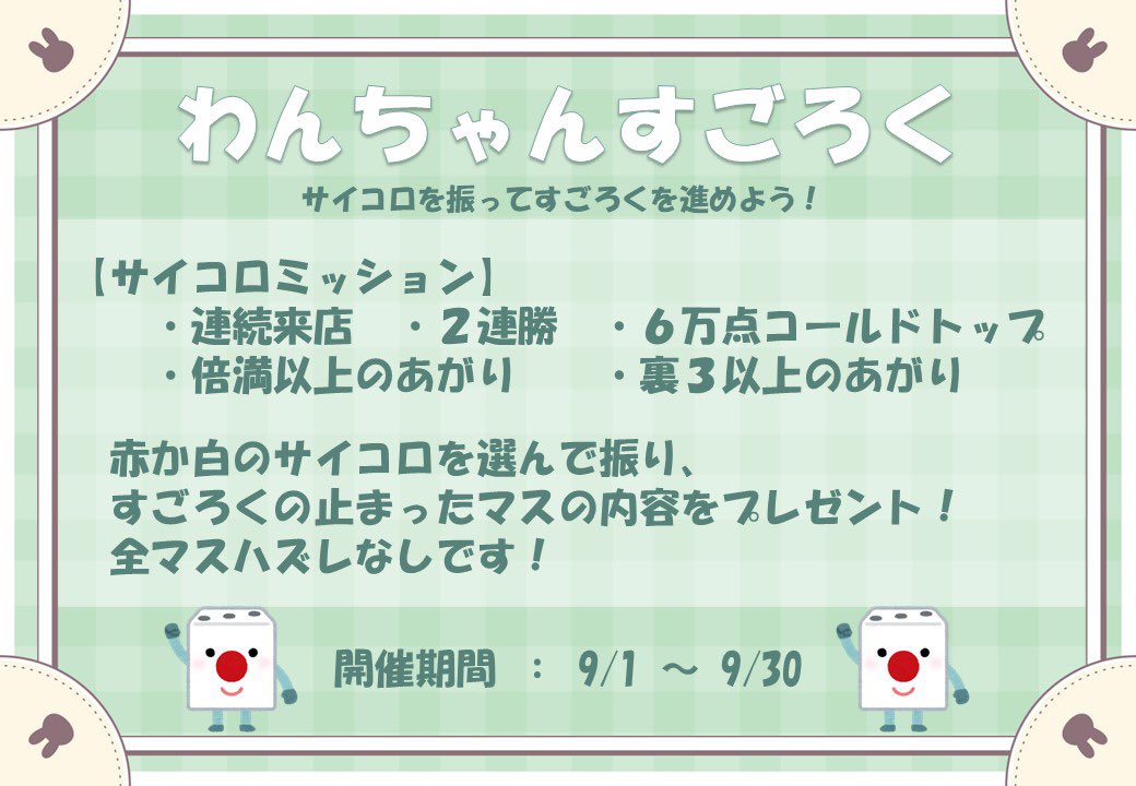 2025.05.27 オープン OPEN麻雀🌸VILLAGE わんちゃんす北海道 マージャンヴィレッジ ワンチャンス 北海道 北24条駅 徒歩1分 四麻、ノーレート、麻雀教室、セット、フリー 電話する011-600-0752 地図 店舗トップ ルール 写真/動画 イベント 求人 クーポン プロ イチオシ ランキング クチコミ 総合 麻雀🌸VILLAGE わんちゃんす - 5 0 ? 点数について 0件 詳細 雀荘クチコミの点数概要 クチコミの点数は、総合点数を中心に、全部で11項目あります。 12項目は「雀荘の営業形態についての項目」と「その他の環境についての項目」の2つにわかれます。 総合スコア (計11項目) 営業形態点数 (6項目) 雀荘の営業形態についての点数 フリー セット 健康麻雀 麻雀教室 ノーレート 三麻 その他の環境点数 (5項目) 雀荘の設備、その他の環境についての点数 設備 接客 居心地 CP(コストパフォーマンス)・清潔感 ※麻雀王国雀荘検索のクチコミの点数は、当社独自の基準に基づく評価であり、雀荘の価値を何ら保証するものではあ りません。あくまでの一つの参考としてご活用ください。 雀荘クチコミ点数の算出方法要 クチコミの点数は、「ユーザー評価」に独自のアルゴリズムで掛け合わせて算出しております。 麻雀王国では、日々信頼性の高い点数を追及し、微調整を行っております。 ユーザー評価 個人が付けた点数 (雰囲気、感性、感覚、状況、主観など) フリー- セット- 健康麻雀- 麻雀教室- ノーレート- 三麻- 設備 - | 接客 - | 居心地 - | CP(コストパフォーマンス) - | 清潔感 - フリー ¥600/般 ¥500/学 セット ¥375/般 ¥250/学 全国* 北海道5位 ✨✨✨2025年5月27日オープン✨✨✨ 札幌市北区北24条駅から徒歩1分🚉 安心・安全のノーレートのお店です🀄 雀荘に行くのが初めての方、麻雀を始めたばかりの方大歓迎です(*´ω`*) 麻雀プロが多数在籍しておりますので、優しくご対応させていただきます♪ セットのお客様も大歓迎(^^)/ お得な学割もございます☺ 麻雀教室も開催しております📚 麻雀がもっと上手くなりたい方は、ぜひ参加してみてください✍ ※要予約となっておりますm(_ _)m 雀荘デビューは『麻雀🌸VILLAGE わんちゃんす』へ(*‘ω‘ *) 皆様のご来店をお待ちしております! ✨スタッフ募集中✨ ■時給:1,100円~ ■週1日~OK(応相談) 初心者の方からプロ志望の方まで、ぜひ、ご連絡をお待ちしております! ・フリードリンク🥤 ・電子タバコのみOK🚬 ・Wi-Fi完備 ・駐車場サービスあり🚗 ・スマホ、携帯充電可能📱 続きを見る 閉じる お店のイチオシポイント イチオシ 1 安心・安全のノーレートフリー🀄 雀荘に行くのが初めての方、麻雀を始めたばかりの方、大歓迎です(*´ω`*) 雀荘デビューにぜひ、ご来店ください(^^)/ イチオシ 2 麻雀プロ多数在籍✨ 麻雀プロが多数在籍しておりますので、丁寧にご対応させていただきます♪ イチオシ 3 初心者向け麻雀教室開催中📚 毎週金曜日、18時~麻雀教室を開催しております🀄 詳細はスタッフまで、お気軽にお問合せください☺ お店のコトを友達に教える Facebook X(旧Twitter) Line Mail お店を評価する 閉店・休業・移転・情報違い報告 クチコミ投稿 報告内容詳細※必須 閉店 休業 移転 情報違い 送信する 最新情報 2025年9月2日(火) イベント 2025年9月イベント情報✨ わんちゃんすごろく開催中⚀ ミッションを達成して、サイコロを振ってすごろくを進めよう! 「ネット予約」&「チェックイン」で 来店人数×100Gもらえる! ログイン ご予約情報入力 来店日※ 2013年12月31日(火) 卓数※ 12345678910卓 予定開始※ 1:00 2:00 3:00 4:00 5:00 6:00 7:00 8:00 9:00 10:00 11:00 12:00 13:00 14:00 15:00 16:00 17:00 18:00 19:00 20:00 21:00 22:00 23:00 24:00 予定終了※ 1:00 2:00 3:00 4:00 5:00 6:00 7:00 8:00 9:00 10:00 11:00 12:00 13:00 14:00 15:00 16:00 17:00 18:00 19:00 20:00 21:00 22:00 23:00 24:00 お名前※ 携帯TEL※ メール※ ルール※ 四麻 三麻 点数※ 25000点 30000点 赤枚数※ 赤5マン01234 赤5ピン01234 赤5ソー01234 その他 チップ 焼鳥 備考 予約する クチコミ 投稿する お店独自のHP・ソーシャル X (旧twitter) お店の情報詳細 店名 麻雀🌸VILLAGE わんちゃんす 住所 〒001-0023 [地図] 北海道札幌市北区北二十三条西4丁目1-22 秋山ビル1階 電話 011-600-0752 交通手段 札幌市営地下鉄南北線 北24条駅 徒歩1分 札幌市営地下鉄南北線 北18条駅 883m 北24条駅の4番出口が最寄りになります🚉 営業時間 10:00~24:00 定休日 年中無休 営業内容 四麻、ノーレート、麻雀教室、セット、フリー ゲーム代(フリー) ¥600/般 ¥500/学 [東南戦/1回] [※学割は学生証のご提示をお願いします] ゲーム代(セット) ¥375/般 ¥250/学 [※1卓1,500円/1時間 ※学割:1卓1,000円/1時間] ゲーム代(健康麻雀) ゲーム代(麻雀教室) [※要予約] その他の料金 オープン日 2025年5月27日 お店のサービス・システム・設備 総卓数 5卓 卓種 全自動配牌卓×5 サービス 学割、女性スタッフ、自動配牌卓、フリードリンク、ノーレート システム・設備 空気清浄機、ウォシュレット、大型TV、ネット環境 備考 関連エリア・路線 北海道の雀荘ランキング 北24条駅の雀荘ランキング 北18条駅の雀荘ラ