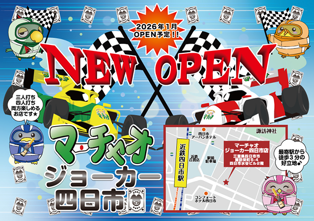 NEWマーチャオ ジョーカー 四日市店三重県 マーチャオジョーカーヨッカイチテン 三重県 近鉄四日市駅 徒歩3分 四麻、三麻、セット、フリー 電話する000-0000-0000 地図 店舗トップ ルール 写真/動画 イベント 求人 クーポン プロ イチオシ ランキング クチコミ 総合 マーチャオ ジョーカー 四日市店 - 5 0 ? 点数について 0件 詳細 雀荘クチコミの点数概要 クチコミの点数は、総合点数を中心に、全部で11項目あります。 12項目は「雀荘の営業形態についての項目」と「その他の環境についての項目」の2つにわかれます。 総合スコア (計11項目) 営業形態点数 (6項目) 雀荘の営業形態についての点数 フリー セット 健康麻雀 麻雀教室 ノーレート 三麻 その他の環境点数 (5項目) 雀荘の設備、その他の環境についての点数 設備 接客 居心地 CP(コストパフォーマンス)・清潔感 ※麻雀王国雀荘検索のクチコミの点数は、当社独自の基準に基づく評価であり、雀荘の価値を何ら保証するものではあ りません。あくまでの一つの参考としてご活用ください。 雀荘クチコミ点数の算出方法要 クチコミの点数は、「ユーザー評価」に独自のアルゴリズムで掛け合わせて算出しております。 麻雀王国では、日々信頼性の高い点数を追及し、微調整を行っております。 ユーザー評価 個人が付けた点数 (雰囲気、感性、感覚、状況、主観など) フリー- セット- 健康麻雀- 麻雀教室- ノーレート- 三麻- 設備 - | 接客 - | 居心地 - | CP(コストパフォーマンス) - | 清潔感 - 全国* 三重県6位 ✨✨✨2026年1月オープン予定✨✨✨ マーチャオが三重県に初上陸!!! ジョーカーは四人打ち、三人打ちどちらも楽しめます🀄 麻雀初めての方も大歓迎(^^)/ 皆様のご来店を心よりお待ちしております!! 続きを見る 閉じる お店のコトを友達に教える Facebook X(旧Twitter) Line Mail お店を評価する 閉店・休業・移転・情報違い報告 クチコミ投稿 報告内容詳細※必須 閉店 休業 移転 情報違い 送信する 「ネット予約」&「チェックイン」で 来店人数×100Gもらえる! ログイン ご予約情報入力 来店日※ 2013年12月31日(火) 卓数※ 12345678910卓 予定開始※ 1:00 2:00 3:00 4:00 5:00 6:00 7:00 8:00 9:00 10:00 11:00 12:00 13:00 14:00 15:00 16:00 17:00 18:00 19:00 20:00 21:00 22:00 23:00 24:00 予定終了※ 1:00 2:00 3:00 4:00 5:00 6:00 7:00 8:00 9:00 10:00 11:00 12:00 13:00 14:00 15:00 16:00 17:00 18:00 19:00 20:00 21:00 22:00 23:00 24:00 お名前※ 携帯TEL※ メール※ ルール※ 四麻 三麻 点数※ 25000点 30000点 赤枚数※ 赤5マン01234 赤5ピン01234 赤5ソー01234 その他 チップ 焼鳥 備考 予約する クチコミ 投稿する お店の情報詳細 店名 マーチャオ ジョーカー 四日市店 住所 〒510-8642 [地図] 三重県四日市市諏訪栄町5-4 四日市水谷ビル2階 電話 000-0000-0000 交通手段 近鉄内部線 近鉄四日市駅 徒歩3分 営業時間 オープン~ラスト 定休日 年中無休 営業内容 四麻、三麻、セット、フリー ゲーム代(フリー) ゲーム代(セット) ゲーム代(健康麻雀) ゲーム代(麻雀教室) その他の料金 オープン日 お店のサービス・システム・設備 総卓数 14卓 卓種 全自動配牌卓×14 サービス 自動配牌卓、フリードリンク システム・設備 備考 関連エリア・路線 三重県の雀荘ランキング 近鉄四日市駅の雀荘ランキング 三重県の雀荘特集 三重県四日市市の雀荘特集 近鉄四日市駅の雀荘特集 お店を利用する 電話する000-0000-0000 地図三重県四日市市諏訪栄町5-4四日市水谷ビル2階 店舗トップ ルール 写真/動画 イベント 求人 クーポン プロ イチオシ ランキング ソーシャル [ 管理者ページ ]