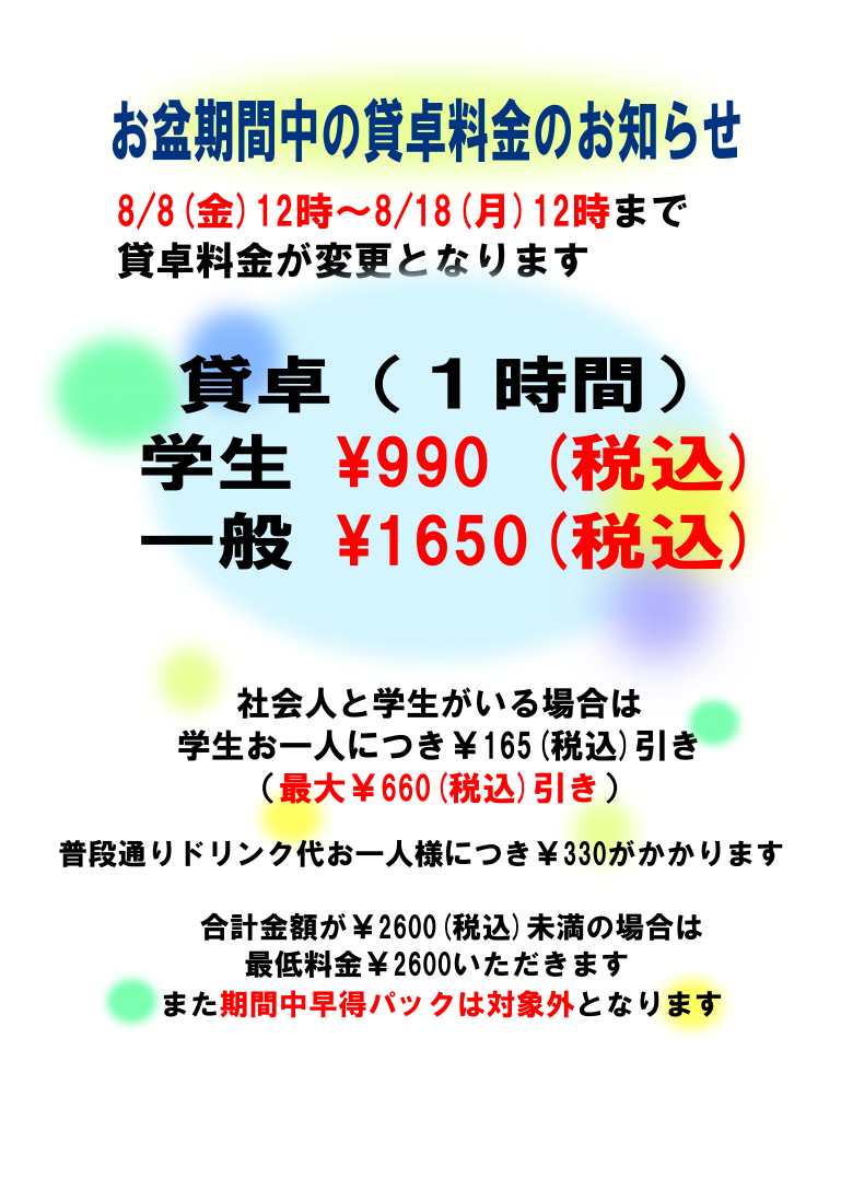 ミラージュ 池田店大阪府 ミラージュ イケダテン 大阪府 石橋駅 徒歩3分 四麻、フリー、セット、三麻 電話する072-763-1808 地図 店舗トップ ルール 写真/動画 イベント 求人 クーポン プロ イチオシ ランキング クチコミ 総合 ミラージュ 池田店 3.0 5 1 ? 点数について 1件 詳細 雀荘クチコミの点数概要 クチコミの点数は、総合点数を中心に、全部で11項目あります。 12項目は「雀荘の営業形態についての項目」と「その他の環境についての項目」の2つにわかれます。 総合スコア (計11項目) 営業形態点数 (6項目) 雀荘の営業形態についての点数 フリー セット 健康麻雀 麻雀教室 ノーレート 三麻 その他の環境点数 (5項目) 雀荘の設備、その他の環境についての点数 設備 接客 居心地 CP(コストパフォーマンス)・清潔感 ※麻雀王国雀荘検索のクチコミの点数は、当社独自の基準に基づく評価であり、雀荘の価値を何ら保証するものではあ りません。あくまでの一つの参考としてご活用ください。 雀荘クチコミ点数の算出方法要 クチコミの点数は、「ユーザー評価」に独自のアルゴリズムで掛け合わせて算出しております。 麻雀王国では、日々信頼性の高い点数を追及し、微調整を行っております。 ユーザー評価 個人が付けた点数 (雰囲気、感性、感覚、状況、主観など) フリー3.0 セット- 健康麻雀- 麻雀教室- ノーレート- 三麻- 設備 3.0 | 接客 3.0 | 居心地 3.0 | CP(コストパフォーマンス) 3.0 | 清潔感 3.0 フリー ¥400/般 セット ¥303/般 ¥193/学 長期契約安心店舗 フリーの詳細情報 2010年6月オープン!!大阪大学から激近の四人打ちフリー雀荘! 阪急宝塚線の石橋阪大前駅から徒歩3分と便利 学生の方が多数利用しています! バイト募集も随時募集中です! スタッフの9割が阪大生 !! プロ雀士も在籍 !! 四人打ちは成績完全管理なので自分の実力・弱点が分かる !! ミラージュで打てば強くなれるかも !? 広々とした綺麗な店内には自信アリ! オーソドックスなルールなのでフリーデビューに最適です。 またバイト募集も行っております! 興味がある方は是非ご来店くださいませ! 続きを見る 閉じる お店のイチオシポイント イチオシ 1 総額16000円キャッシュバック! フリーご新規様には お得なキャッシュバックがあります! 四人打ちで総額10000円 三人打ちで総額6000円 最大で総額16000円のキャッシュバック! 詳しくは「イベント」をご覧ください イチオシ 2 貸卓お得パック 貸卓ご利用のお客様には 平日は昼の13時まで 土日祝日は朝の11時までの来店で 早得パック適用 6時間 学割¥3500 一般¥5500 9時間 学割¥5000 一般¥7400 ドリンク代・消費税が別途必要です お店のコトを友達に教える Facebook X(旧Twitter) Line Mail お店を評価する 閉店・休業・移転・情報違い報告 クチコミ投稿 報告内容詳細※必須 閉店 休業 移転 情報違い 送信する 最新情報 2025年7月21日(月) イベント お盆期間中の貸卓価格について 8/9(金)12時から19日(月)12時までの期間 貸卓料金が変わります。 またフリー・貸卓の営業時間につきましては 暦通りの営業とさせていただきます。 皆様のご来店お待ちしております。 「ネット予約」&「チェックイン」で 来店人数×100Gもらえる! ログイン ご予約情報入力 来店日※ 2013年12月31日(火) 卓数※ 12345678910卓 予定開始※ 1:00 2:00 3:00 4:00 5:00 6:00 7:00 8:00 9:00 10:00 11:00 12:00 13:00 14:00 15:00 16:00 17:00 18:00 19:00 20:00 21:00 22:00 23:00 24:00 予定終了※ 1:00 2:00 3:00 4:00 5:00 6:00 7:00 8:00 9:00 10:00 11:00 12:00 13:00 14:00 15:00 16:00 17:00 18:00 19:00 20:00 21:00 22:00 23:00 24:00 お名前※ 携帯TEL※ メール※ ルール※ 四麻 三麻 点数※ 25000点 30000点 赤枚数※ 赤5マン01234 赤5ピン01234 赤5ソー01234 その他 チップ 焼鳥 備考 予約する クチコミ 投稿する ミラージュ 池田店 大阪府 石橋駅 メンバーさんもお客さんも若い方が多く、安心できるお店でした 2017/03/22 (2017/03訪問) ゲスト さんのクチコミ 総合 5.0 お店独自のHP・ソーシャル X (旧twitter) 自社HP お店の情報詳細 店名 ミラージュ 池田店 住所 〒563-0032 [地図] 大阪府池田市石橋2-16-12 プリモビル2F 電話 072-763-1808 交通手段 阪急宝塚本線 石橋駅 徒歩3分 阪急箕面線 石橋駅 徒歩3分 大阪大学豊中キャンパスから徒歩3分!! 石橋阪大下交差点にあります。 阪急石橋阪大前駅からも徒歩3分!!美容室「リセット」さんの上にあります。 営業時間 12:00~24:00 [平日(フリーは13:00~)] 10:00~24:00 [土日祝日(フリーは12:00~)] 定休日 年中無休 営業内容 四麻、フリー、セット、三麻 ゲーム代(フリー) ¥400/般 [東南戦/1回] [女性の方はゲーム代半額] ¥200/般 [三人麻雀/1回] [女性の方はゲーム代半額] ゲーム代(セット) ¥303/般 ¥193/学 [一般 1100円/1時間(1卓) 学割 700円/1時間(1卓) 混合の場合は学生1名につき100円引き ドリンク代1名につき300円、消費税を別途いただきます] ゲーム代(健康麻雀) ゲーム代(麻雀教室) その他の料金 <貸卓フリータイム> OPENから平日は昼の13時まで、土日は朝の11時時までの来店で 6時間パック 学割・3500円 一般・5500円 9時間パック 学割・5000円 一般・7400円 ドリンク代、消費税を別途