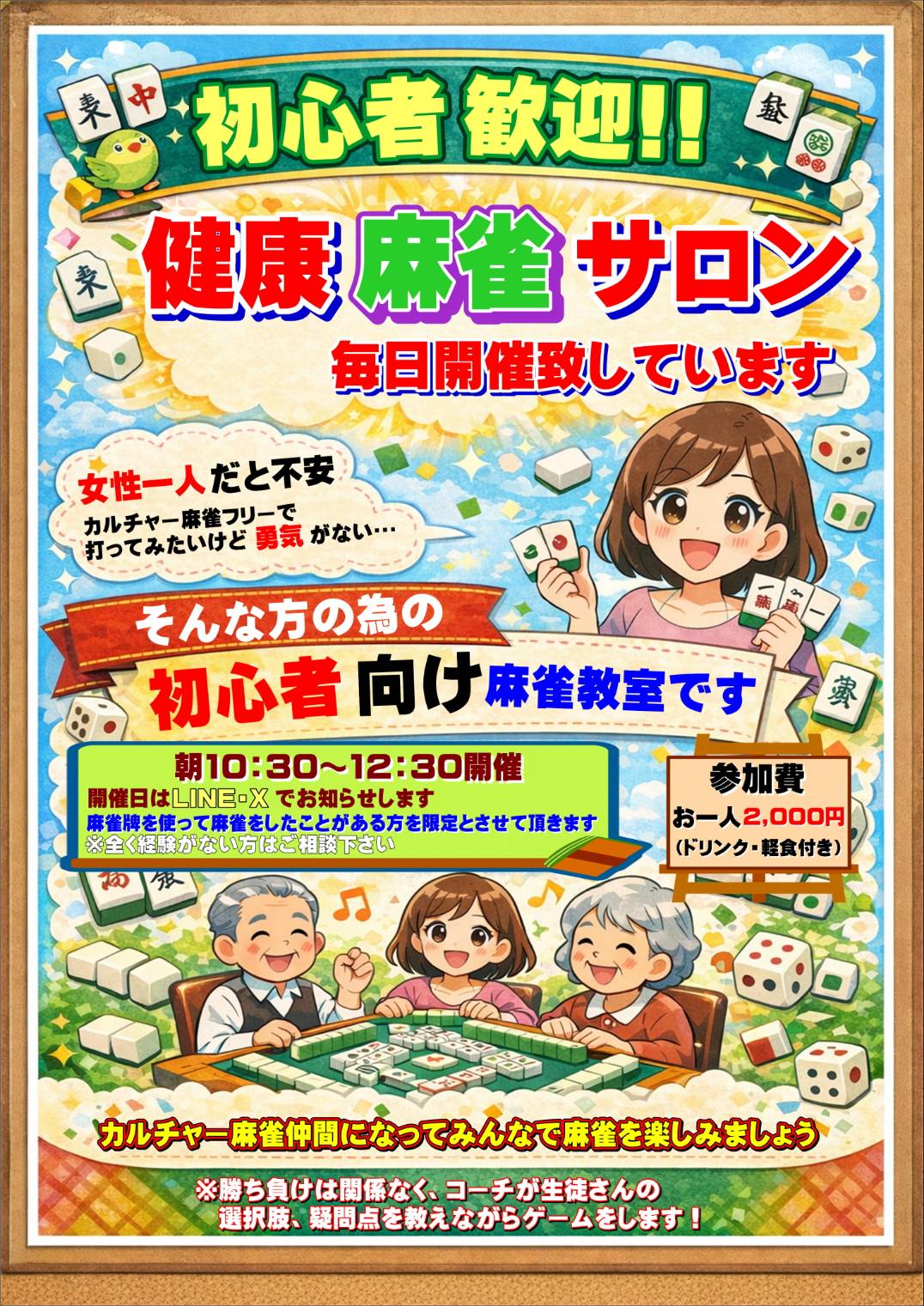 一般社団法人日本健康麻将協会のカリキュラムに沿って初心者に適したレッスンを開催します。