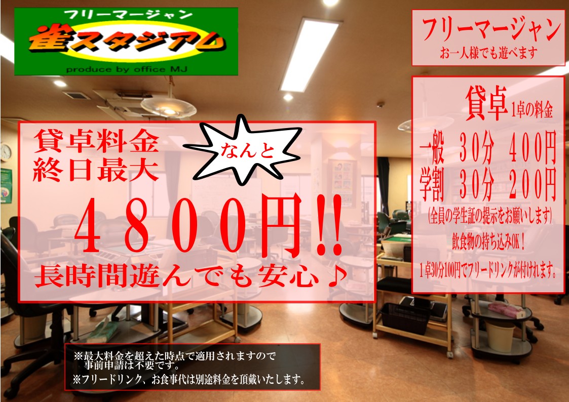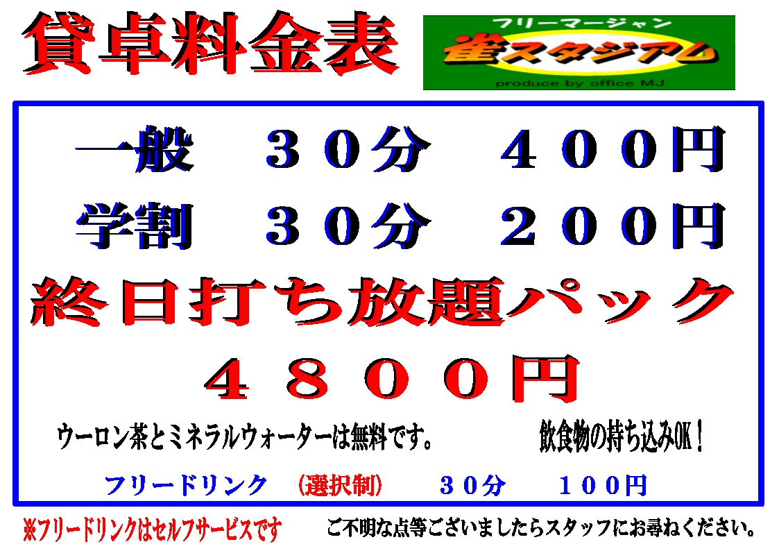 雀スタジアム愛媛県 ジャンスタジアム 愛媛県 大街道駅 徒歩2分 フリー、三麻、セット 電話する089-933-1004 地図 店舗トップ ルール 写真/動画 イベント 求人 クーポン プロ イチオシ ランキング クチコミ 総合 雀スタジアム - 5 0 ? 点数について 0件 詳細 雀荘クチコミの点数概要 クチコミの点数は、総合点数を中心に、全部で11項目あります。 12項目は「雀荘の営業形態についての項目」と「その他の環境についての項目」の2つにわかれます。 総合スコア (計11項目) 営業形態点数 (6項目) 雀荘の営業形態についての点数 フリー セット 健康麻雀 麻雀教室 ノーレート 三麻 その他の環境点数 (5項目) 雀荘の設備、その他の環境についての点数 設備 接客 居心地 CP(コストパフォーマンス)・清潔感 ※麻雀王国雀荘検索のクチコミの点数は、当社独自の基準に基づく評価であり、雀荘の価値を何ら保証するものではあ りません。あくまでの一つの参考としてご活用ください。 雀荘クチコミ点数の算出方法要 クチコミの点数は、「ユーザー評価」に独自のアルゴリズムで掛け合わせて算出しております。 麻雀王国では、日々信頼性の高い点数を追及し、微調整を行っております。 ユーザー評価 個人が付けた点数 (雰囲気、感性、感覚、状況、主観など) フリー- セット- 健康麻雀- 麻雀教室- ノーレート- 三麻- 設備 - | 接客 - | 居心地 - | CP(コストパフォーマンス) - | 清潔感 - フリー ¥300/般 セット ¥200/般 ¥100/学 長期契約安心店舗 全国* 愛媛県2位 今までの雀荘にはなかったくつろぎのデザイナーズ空間を持つフリー雀荘です 長時間のご遊戯も安心の地域最安値を実現しております 貸卓料金 終日最大¥4800‼ 30分 一般¥400 学割¥200 コスパ最強‼ 市内中心部にある明るく綺麗な空間のフリー雀荘です!! 3人打ちの自動配牌の全自動卓完備店です。 学生さんにはサービスがあり 幅広い方々に楽しんで頂いております。 続きを見る 閉じる お店のコトを友達に教える Facebook X(旧Twitter) Line Mail お店を評価する 閉店・休業・移転・情報違い報告 クチコミ投稿 報告内容詳細※必須 閉店 休業 移転 情報違い 送信する 最新情報 2025年11月26日(水) イベント 地域最安値‼ 貸卓料金 終日最大4800円‼ 「ネット予約」&「チェックイン」で 来店人数×100Gもらえる! ログイン ご予約情報入力 来店日※ 2013年12月31日(火) 卓数※ 12345678910卓 予定開始※ 1:00 2:00 3:00 4:00 5:00 6:00 7:00 8:00 9:00 10:00 11:00 12:00 13:00 14:00 15:00 16:00 17:00 18:00 19:00 20:00 21:00 22:00 23:00 24:00 予定終了※ 1:00 2:00 3:00 4:00 5:00 6:00 7:00 8:00 9:00 10:00 11:00 12:00 13:00 14:00 15:00 16:00 17:00 18:00 19:00 20:00 21:00 22:00 23:00 24:00 お名前※ 携帯TEL※ メール※ ルール※ 四麻 三麻 点数※ 25000点 30000点 赤枚数※ 赤5マン01234 赤5ピン01234 赤5ソー01234 その他 チップ 焼鳥 備考 予約する クチコミ 投稿する お店独自のHP・ソーシャル 自社HP お店の情報詳細 店名 雀スタジアム 住所 〒790-0002 [地図] 愛媛県松山市二番町3丁目10-1 チャイム二番町ビル4F 電話 089-933-1004 交通手段 伊予鉄道環状線 大街道駅 徒歩2分 伊予鉄道環状線 県庁前駅 徒歩3分 伊予鉄道横河原線 松山市駅 徒歩10分 市内中心部、二番町通り沿いの三越隣の1Fにファミリーマートが入っているビルの4Fが当店です!! 営業時間 7:00~ラスト 定休日 年中無休 営業内容 フリー、三麻、セット ゲーム代(フリー) ¥300/般 [三人麻雀/1回] ¥500/般 [三人麻雀/1回] ゲーム代(セット) ¥200/般 ¥100/学 [一般 800円/1時間(1卓。30分400円) 学割 400円/1時間(1卓。30分200円※全員の学生証提示が必要です。)] ゲーム代(健康麻雀) ゲーム代(麻雀教室) その他の料金 終日打ち放題!最大4800円‼ オープン日 お店のサービス・システム・設備 総卓数 8卓 卓種 点数表示付全自動卓×8全自動配牌卓×4 サービス 学割、フリードリンク、自動配牌卓 システム・設備 備考 関連エリア・路線 愛媛県の雀荘ランキング 大街道駅の雀荘ランキング 県庁前駅の雀荘ランキング 松山市駅の雀荘ランキング 愛媛県の雀荘特集 愛媛県松山市の雀荘特集 大街道駅の雀荘特集 県庁前駅の雀荘特集 松山市駅の雀荘特集 お店を利用する 電話する089-933-1004 地図愛媛県松山市二番町3丁目10-1 チャイム二番町ビル4F 店舗トップ ルール 写真/動画 イベント 求人 クーポン プロ イチオシ ランキング ソーシャル [ 管理者ページ ]