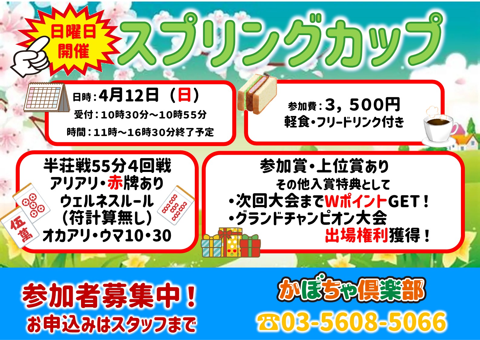 かぼちゃ倶楽部東京都 カボチャクラブ 東京都 両国駅 駅から徒歩1分 セット、健康麻雀、麻雀教室、ノーレート 電話する03-5608-5066 地図 店舗トップ ルール 写真/動画 イベント 求人 クーポン プロ イチオシ ランキング クチコミ 総合 かぼちゃ倶楽部 3.0 5 2 ? 点数について 2件 詳細 雀荘クチコミの点数概要 クチコミの点数は、総合点数を中心に、全部で11項目あります。 12項目は「雀荘の営業形態についての項目」と「その他の環境についての項目」の2つにわかれます。 総合スコア (計11項目) 営業形態点数 (6項目) 雀荘の営業形態についての点数 フリー セット 健康麻雀 麻雀教室 ノーレート 三麻 その他の環境点数 (5項目) 雀荘の設備、その他の環境についての点数 設備 接客 居心地 CP(コストパフォーマンス)・清潔感 ※麻雀王国雀荘検索のクチコミの点数は、当社独自の基準に基づく評価であり、雀荘の価値を何ら保証するものではあ りません。あくまでの一つの参考としてご活用ください。 雀荘クチコミ点数の算出方法要 クチコミの点数は、「ユーザー評価」に独自のアルゴリズムで掛け合わせて算出しております。 麻雀王国では、日々信頼性の高い点数を追及し、微調整を行っております。 ユーザー評価 個人が付けた点数 (雰囲気、感性、感覚、状況、主観など) フリー3.0 セット- 健康麻雀3.0 麻雀教室3.0 ノーレート3.0 三麻- 設備 3.0 | 接客 3.0 | 居心地 3.0 | CP(コストパフォーマンス) 3.0 | 清潔感 3.0 セット ¥300/般 ¥250/学 長期契約安心店舗 全国* 東京都* 【東京都墨田区・両国駅】かぼちゃ倶楽部は、セット・健康麻雀・麻雀教室・ノーレートが楽しめる雀荘です。 ◆◇◆◇◆◇◆◇◆◇◆◇◆◇◆◇◆◇◆◇◆◇◆◇◆◇◆◇◆◇◆◇◆◇◆◇ セット(卓貸し)ご予約受付中! 1時間1卓1,200円でご利用可能です!(土日・祝日は1卓1日10,000円) ご予約はお早めにどうぞ! ※自動配牌卓ではありません。予めご了承ください。 ◆◇◆◇◆◇◆◇◆◇◆◇◆◇◆◇◆◇◆◇◆◇◆◇◆◇◆◇◆◇◆◇◆◇◆◇ 20代~80代、初心者~上級者まで様々の方にご利用いただいております! 明るく楽しく和やかに! お好きなお時間に来店し、お好きな時間にお帰りいただけます♪ JR両国駅から徒歩1分! 在籍スタッフのほとんどが麻雀プロ! ドリンク100円で飲み放題! 広々スペース!持ち込み可 是非お待ちしております!!!!! 【経験者コース】10時~19時(毎日開催) *10時~19時(2,400円)※月~金曜日は200円割引 *10時~15時(1,900円) *14時~19時(1,900円) ドリンク飲み放題 (+100円) 【個人レッスン】1時間1,500円(事前予約制) ※人数に応じて割引あり ◆かぼちゃ倶楽部ではお客様のマスク着用につきましては「推奨」とさせていただきます。 初心者の方大歓迎です! 久しぶりのマージャンでもすぐに楽しめる・・・ それが、健康マージャン教室のウェルネスマージャンルールです。 マージャンのルールを良い部分は残し、複雑な部分は簡略化して 誰にでも楽しみやすく、親しみやすいようにしたマージャンをお楽しみいただけます♪ 続きを見る 閉じる お店のイチオシポイント イチオシ 1 も・ち・ろ・ん!賭けない・飲まない・吸わない♪ 当店は賭けない、飲まない、吸わないを前提としたマージャン教室・健康マージャンのお店です。 健康マージャンには ①健康づくり・仲間づくり・生きがいづくり ②認知症予防対策 ③ねんりんピック(厚生労働省主催) などなどの魅力がございます。 また当店はマージャンのルールを良い部分はのこし、複雑な部分は簡略化したウェルネスマージャンルールを採用しております。 誰にでも楽しみやすく、親しみやすいマージャンをぜひ一度お試しください♪♪ イチオシ 2 お好きなコースをお選びいただけます 2025年1月より新料金体系がスタート! 1日遊んでも¥2,400です! 【経験者コース】 *10時~19時(2,400円)月~金200円割引 *10時~15時(1,900円) *14時~19時(1,900円) ドリンク飲み放題 (+100円) 【教室コース】 1時間1,500円(事前予約制) ※人数に応じて割引あり イチオシ 3 両国駅から徒歩1分 当店はJR総武線 両国駅より徒歩1分の好立地で営業をしております。お近くにお住まいの方も遠方の方もぜひ一度お越しください!! お店のコトを友達に教える Facebook X(旧Twitter) Line Mail お店を評価する 閉店・休業・移転・情報違い報告 クチコミ投稿 報告内容詳細※必須 閉店 休業 移転 情報違い 送信する 最新情報 2026年3月8日(日) イベント 日曜イベント「スプリングカップ」開催! 4/12(日)10時30分受付開始、11時スタート。 参加費3,500円軽食付き。 ウェルネスマージャンルール(赤牌有り)。 半荘4回戦。オカ有り・ウマ10-30。 初心者の方や、まだ来店されたことのない方の参加も大歓迎です! 「ネット予約」&「チェックイン」で 来店人数×100Gもらえる! ログイン ご予約情報入力 来店日※ 2013年12月31日(火) 卓数※ 12345678910卓 予定開始※ 1:00 2:00 3:00 4:00 5:00 6:00 7:00 8:00 9:00 10:00 11:00 12:00 13:00 14:00 15:00 16:00 17:00 18:00 19:00 20:00 21:00 22:00 23:00 24:00 予定終了※ 1:00 2:00 3:00 4:00 5:00 6:00 7:00 8:00 9:00 1