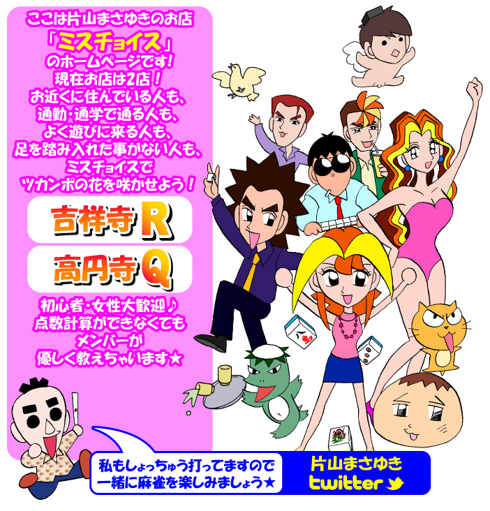Tokushuses Chain Tempo:ミスチョイスグループ 「吉祥寺」と「高円寺」にある片山まさゆき先生のお店です。 両店舗ではただいまスタッフを大募集してますのでお気軽にご連絡ください。 都道府県で検索 東京都(1) 東京都 麻雀 ミスチョイスQ 高円寺店 フリー ¥400/般 セット ¥300/般 その他の特集 一覧 スリーベットグループ 麻雀 アカギとカイヂグループ エースグループ 北斗の雀 OWLグループ ひまわりグループ まーすた JAMグループ カボグループ ALL☆STARグループ ブルードラゴングループ 文化サークルグループ ザビエールグループ じゃんきー・牌の実グループ SEEDグループ Bucksグループ 楽雀グループ ゴースタグループ セブングループ Cafe Panda グループ ヒャクジャン グループ めろんの樹 グループ ゴールドラッシュ グループ ま~じゃん パーク グループ たぬグループ かめきたざわグループ 夢道場グループ スリーファイブグループ さかえグループ 番地グループ STAGE7グループ Jボーイグループ 麻雀カフェグループ 花チェーン e'sグループ ウェルカムグループ Questionグループ 柳グループ ぱたーんグループ メトログループ ガラパゴスグループ さんくちゅありグループ MAPグループ マーチャオグループ ZOOグループ