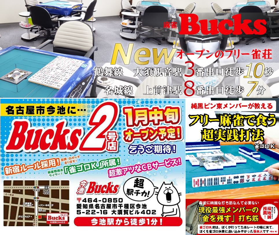 Tokushuses Chain Tempo:Bucksグループ Bucks(バックス)は愛知県名古屋市大須、2号店は今池にNewオープンのフリー雀荘です! 都道府県で検索 福井県(1)愛知県(2) 福井県 福井Bucks JR北陸本線(米原~富山) 福井駅 徒歩12分 愛知県 麻雀Bucks大須店 名古屋市営地下鉄鶴舞線 大須観音駅 3番出口より徒歩10秒 フリー、四麻、セット フリー ¥600/般 セット ¥450/般 麻雀Bucks今池店 三麻、セット、フリー フリー ¥500/般 セット ¥1,100/般 その他の特集 一覧 スリーベットグループ エースグループ 北斗の雀 OWLグループ ひまわりグループ まーすた JAMグループ カボグループ ALL☆STARグループ ブルードラゴングループ ザビエールグループ じゃんきー・牌の実グループ 楽雀グループ セブングループ Cafe Panda グループ ヒャクジャン グループ ゴールドラッシュ グループ ま~じゃん パーク グループ かめきたざわグループ 夢道場グループ スリーファイブグループ さかえグループ 番地グループ STAGE7グループ 麻雀カフェグループ e'sグループ ウェルカムグループ 柳グループ ぱたーんグループ メトログループ ガラパゴスグループ さんくちゅありグループ MAPグループ マーチャオグループ ZOOグループ