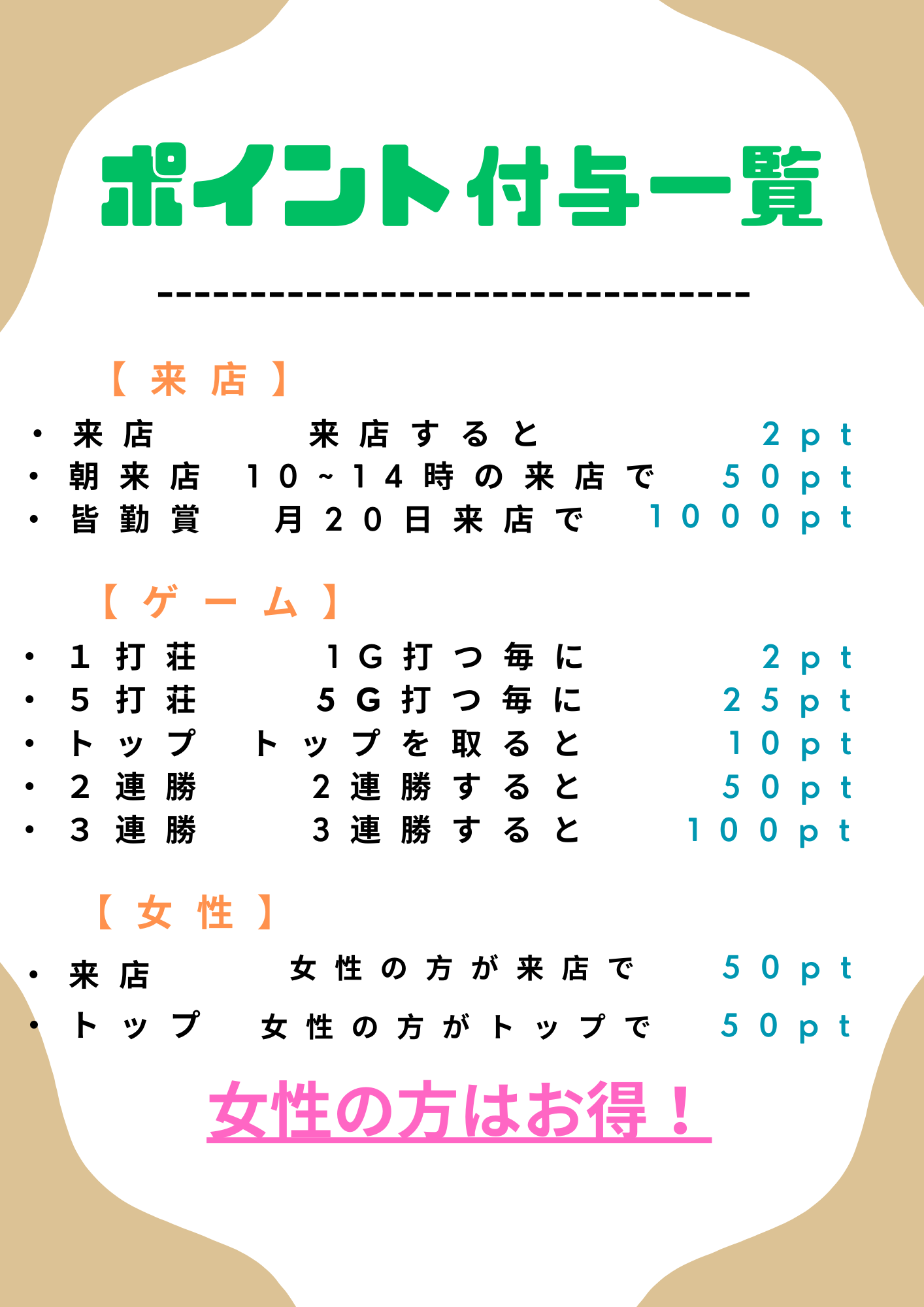 ・来店 女性の方が来店で 50pt