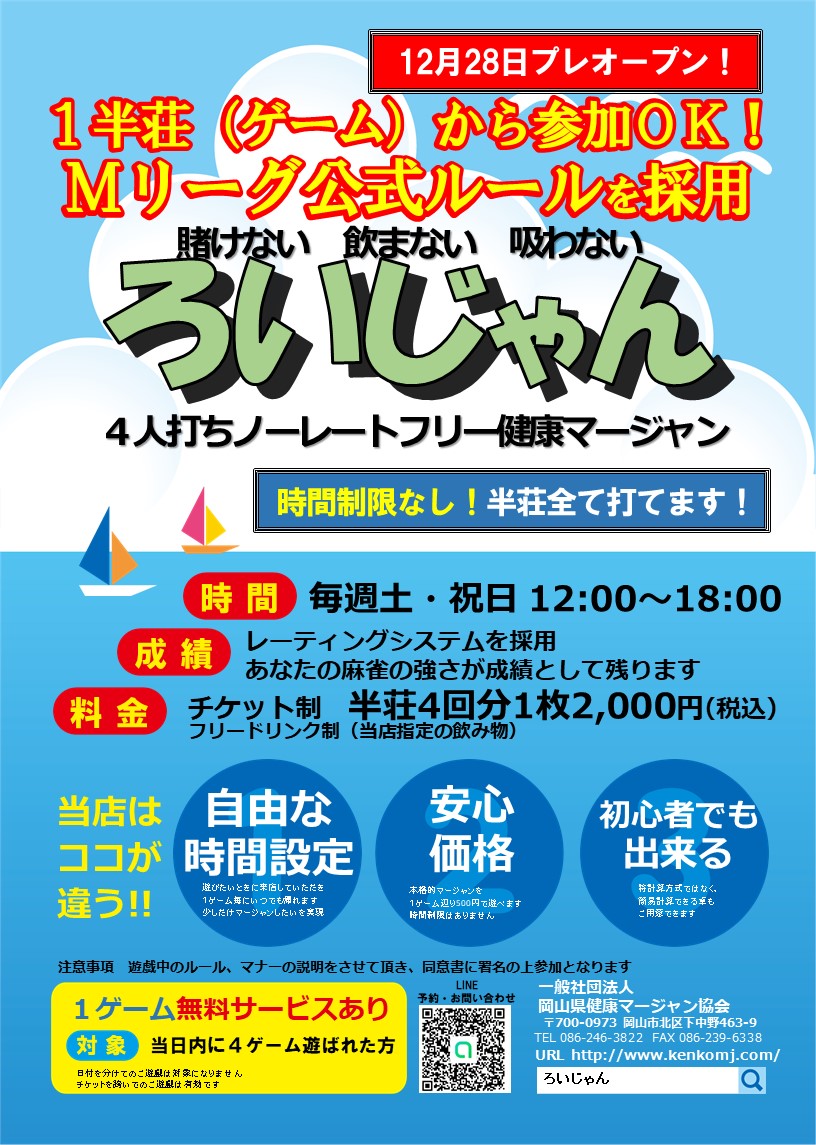 ロイヤルマージャンCL岡山県 ロイヤルマージャンシーエル 岡山県 備前西市駅 徒歩5分 セット、健康麻雀、麻雀教室、ノーレート 電話する086-246-3822 地図 店舗トップ ルール 写真/動画 イベント 求人 クーポン プロ イチオシ ランキング クチコミ イベント詳細 イベント 週間スケジュール 固定イベント 健康麻将、初心者教室、レディース教室、ノーレートフリーの日程です。 イベント 【土曜】4人打ちノーレートフリー健康マージャン ろいじゃん 固定イベント 2020年1月開設 お一人でいつでも参加できる 4人打ちノーレートフリー健康マージャン ろいじゃん 毎週土曜日・祝日 12:00~18:00 1半荘500円(時間無制限) ・フリードリンク ・当会場レーティングシステムを採用 天鳳割(チケット購入時に受付でお申しつけ下さい) ・天鳳初段~六段の方は500円引き ・七段以上は1000円引き 詳しくはホームページをご覧ください さらに読み込む... 次の6件〜2件/全2件の検索 お店のコトを友達に教える Facebook X(旧Twitter) Line Mail お店を評価する 閉店・休業・移転・情報違い報告 クチコミ投稿 報告内容詳細※必須 閉店 休業 移転 情報違い 送信する