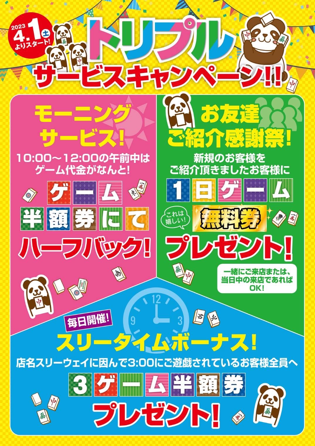 三人麻雀カフェ スリーウェイ宮城県 サンニンマージャンカフェ スリーウェイ 宮城県 仙台駅 徒歩5分 三麻、セット、フリー 電話する022-200-2652 地図 店舗トップ ルール 写真/動画 イベント 求人 クーポン プロ イチオシ ランキング クチコミ イベント詳細 イベント 7月はSNSで割引!! 日時 : 2025年7月1日(火)~2025年7月31日(木) 来店時にSNSでスリーウェイのことをポストするとフォロワー数のぶんだけ割引! SNSを使ってお得にあそぼう! イベント いつでもやってます! トリプルキャンペーン!! 日時 : 2023年1月1日(日)~2023年12月31日(日) ゲーム代還元率はトップクラス!? 開店~12時と3時はアツい! お友達紹介ではなんと一日無料券GET! <ひとーつ!!> 開店時間の朝10時~12時の2時間は打ったゲーム数だけゲーム半額券をプレゼント!! スリーウェイはあさイチがアツい!! <ふたーつ!!> スリーウェイでフリーを遊んだことがないお友達を紹介してくれた方にプレゼント! なんと1日無料で遊べちゃうサービス券をプレゼント!! <みーっつ!!> 「スリー」ウェイにちなんで! 3時時点でご遊戯中のお客様に3ゲーム半額券プレゼント!! さらに読み込む... 次の6件〜2件/全2件の検索 お店のコトを友達に教える Facebook X(旧Twitter) Line Mail お店を評価する 閉店・休業・移転・情報違い報告 クチコミ投稿 報告内容詳細※必須 閉店 休業 移転 情報違い 送信する