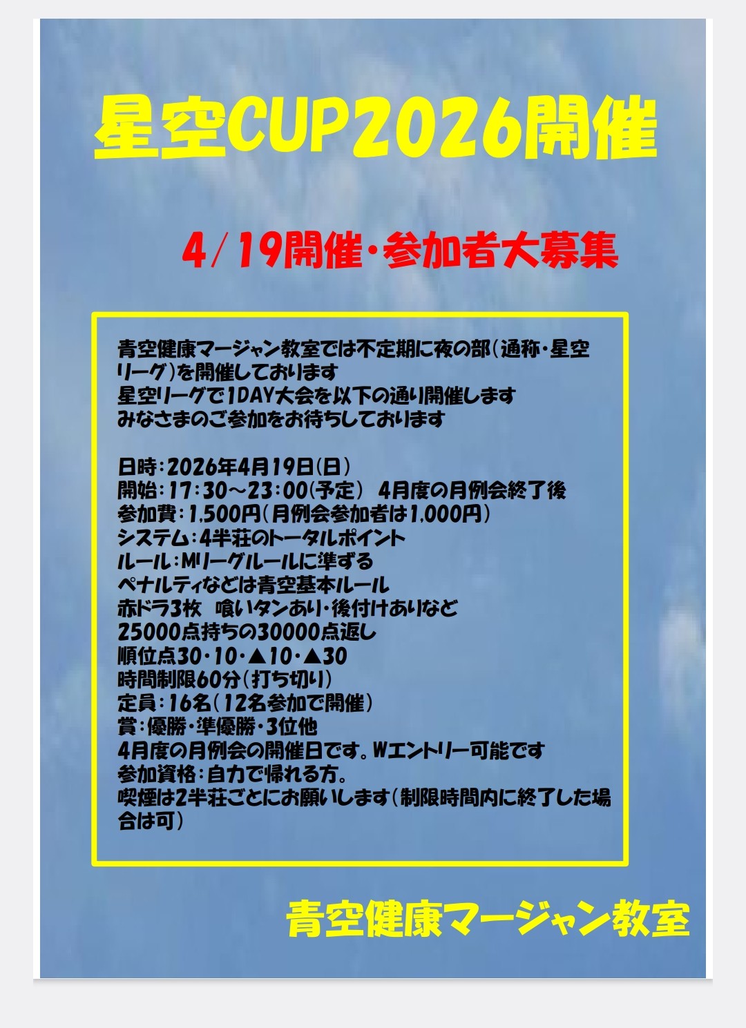 青空健康マージャン教室埼玉県 アオゾラケンコウマージャンキョウシツ 埼玉県 武里駅 徒歩5分 四麻、ノーレート、その他、麻雀教室、健康麻雀、セット、フリー 電話する048-796-8760 地図 店舗トップ ルール 写真/動画 イベント 求人 クーポン プロ イチオシ ランキング クチコミ イベント詳細 イベント 第3回青空健康マージャン教室レディースカップ選手権 日時 : 2026年4月29日(水)~2026年4月29日(水) 日時:4/29(水・祝) 開始:11:00 参加費:2,000円 定員:24名 参加資格:18歳以上女性 概ねルールのわかる方、点数計算ができなくても大丈夫です 4半荘戦 健康麻将全国会の産直大会と同時開催 イベント 星空CUP2026 日時 : 2026年4月19日(日)~2026年4月19日(日) 日時:2026/4/19日曜日 開始:17:30予定 終了:23:00予定 1DAY大会 参加費:1,500円 募集:16名 要予約 システム:総当たり4半荘 4半荘のトータルスコアで順位を決定します 主なルール:アリアリ、赤ドラ3枚、時間制限60分など イベント 第2・第4金曜日限定セット打ち放題 日時 : 2025年7月8日(火)~2025年12月31日(水) 毎月、第2・第4金曜日に限り セット料金通常1時間1,500円を4時間以上ご利用の場合5,000円で時間制限なしの割引を実施いたします 1日2卓限定 要予約 さらに読み込む... 次の6件〜3件/全3件の検索 お店のコトを友達に教える Facebook X(旧Twitter) Line Mail お店を評価する 閉店・休業・移転・情報違い報告 クチコミ投稿 報告内容詳細※必須 閉店 休業 移転 情報違い 送信する