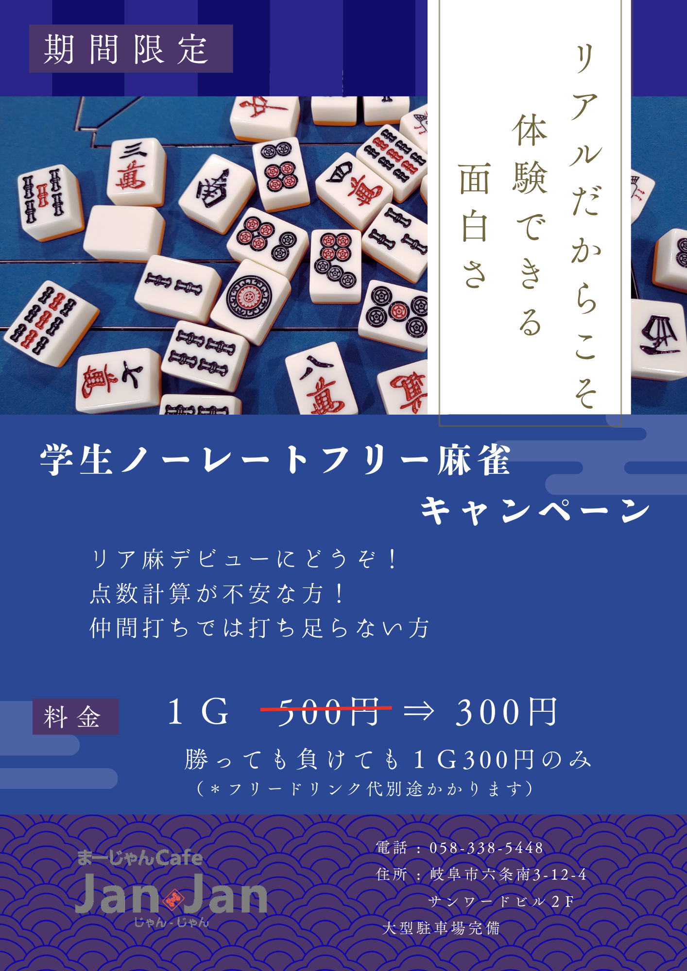まーじゃんcafe JanJan岐阜県 マージャンカフェジャンジャン 岐阜県 岐阜駅 2.48km 四麻、ノーレート、麻雀教室、健康麻雀、セット、フリー 電話する058-338-5448 地図 店舗トップ ルール 写真/動画 イベント 求人 クーポン プロ イチオシ ランキング クチコミ イベント詳細 イベント 第3回JanJanペアマッチ 日時 : 2026年2月1日(日)~2026年2月1日(日) 第3回JanJanペアマッチ開催決定!! 友達、知り合い、家族とペアを組んで優勝目指しましょう! 決勝戦に進んだペアはMリーグさながらの放送対局に出場できます。 1人での参加もOK!当店でペアを組ませていただきます。 申し込みは下記のGoogleフォームでお願いします。 https://forms.gle/czv1H197bJHx7rJt7 イベント 2025JanJan最強戦 日時 : 2025年1月15日(水)~2025年11月9日(日) 初代JanJan最強は誰の手に!! 年4回 3/2・5/25・8/24・11/9に1DAY大会を開催 3回戦(50分打切り)→上位4名で決勝 春・夏・秋・冬 各1名が年間決勝に進出できます。 料金 一般2500円 学生2000円 フリードリンク込み 春・夏・秋・冬の優勝者の方にはJanJanフリー1日券プレゼント!! お申込みお待ちしております! イベント JanJan冬の陣 日時 : 2024年11月1日(金)~2024年12月22日(日) 期間中に獲得したポイント合計上位8名が 決勝進出!! イベント 学生フリー麻雀キャンペーン 固定イベント 学生フリー麻雀キャンペーン!! フリー麻雀初めての方、いつも打っている方もキャンペーンの機会に是非お越しください。 イベント 連盟公式ルール フリー開催 日時 : 2024年9月8日(日)~2024年10月6日(日) 9月8日(日)堤文吾プロ来店 9月29日 犬飼直紀プロ来店 10月6日(日)大橋幸正プロ来店 さらに読み込む... 次の6件〜10件/全17件の検索 お店のコトを友達に教える Facebook X(旧Twitter) Line Mail お店を評価する 閉店・休業・移転・情報違い報告 クチコミ投稿 報告内容詳細※必須 閉店 休業 移転 情報違い 送信する
