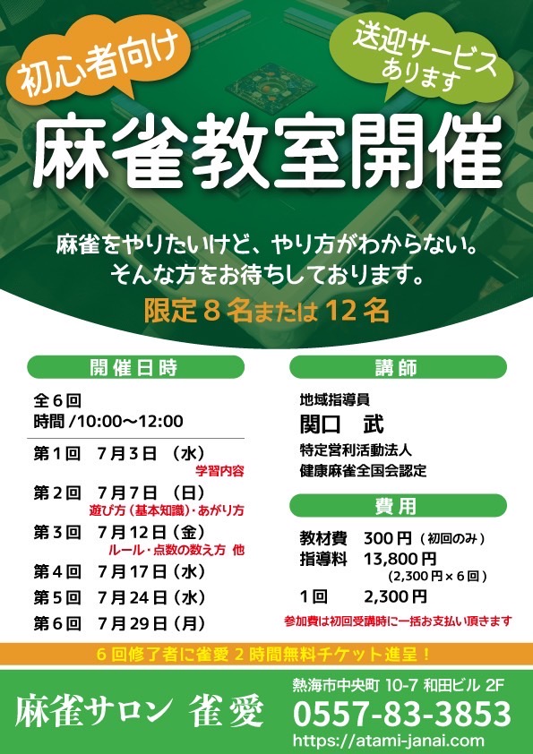 麻雀サロン 雀愛静岡県 マージャンサロン ジャンアイ 静岡県 熱海駅 徒歩15分 四麻、三麻、ノーレート、健康麻雀、セット 電話する0557-83-3853 地図 店舗トップ ルール 写真/動画 イベント 求人 クーポン プロ イチオシ ランキング クチコミ イベント詳細 イベント チェックイン・チェックアウトプラン 固定イベント この度、雀愛では、熱海に宿泊されるお客様に向け、お得で便利なプランをご用意しました。 適応時間 10:00~16:00 遊戯時間 4時間 セット料金 4人打ち 1時間/500円➡400円 3人打ち 1時間/550円➡450円 フード・アルコール類➡ 全500円 完全送迎付き ホテル・旅館~当麻雀サロン 当麻雀サロン~熱海駅 事前予約制です。ぜひ活用ください イベント 麻雀教室開催 日時 : 2024年7月3日(水)~2024年7月29日(月) 麻雀やりたいけど、やり方がわからない。 そんな方をお待ちしております。 限定8名~12名 無料送迎サービス在ります さらに読み込む... 次の6件〜2件/全2件の検索 お店のコトを友達に教える Facebook X(旧Twitter) Line Mail お店を評価する 閉店・休業・移転・情報違い報告 クチコミ投稿 報告内容詳細※必須 閉店 休業 移転 情報違い 送信する