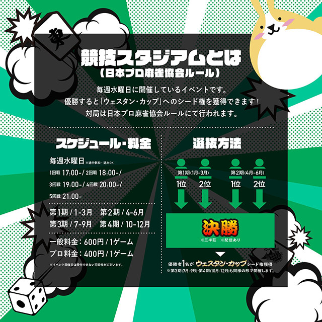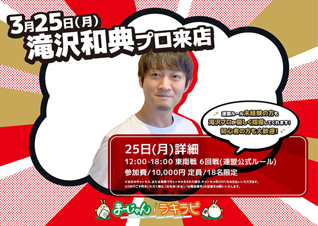 まーじゃん ラキラビ大阪府 マージャンラキラビ 大阪府 本町駅 徒歩3分 四麻、ノーレート、麻雀教室、健康麻雀、セット、フリー 電話する080-3733-1199 地図 店舗トップ ルール 写真/動画 イベント 求人 クーポン プロ イチオシ ランキング クチコミ イベント詳細 イベント 2024年3月25日(月)日本プロ麻雀連盟 滝沢 和典 プロご来店✨️ 日時 : 2024年3月25日(月)~2024年3月25日(月) 2024年3月25日(月)12:00~ 日本プロ麻雀連盟 『滝沢 和典』プロがご来店されます(*´ω`*) 連盟公式ルールを滝沢プロが優しく教えてくださいます♪ 皆様のご参加をお待ちしております! ※ご予約は店舗XのDMにてお願いしますm(_ _)m イベント 初心者麻雀教室開催中✨️ 固定イベント 毎週水・金・土日祝(イベント日を除く)に初心者の方向けの麻雀教室を開催しております! 日本プロ麻雀協会A1リーガーの『角谷 ヨウスケ』プロが優しく教えてくださいます♪ 麻雀初めてみたい!覚えたい!という皆様のご参加をお待ちしております(^^)/ イベント 競技スタジアム✨️ 固定イベント 競技スタジアム開催中!!! 月曜日:日本プロ麻雀連盟公式ルール 水曜日:日本プロ麻雀協会公式ルール 優勝するとプロ団体主催の大会に出れるシード権を獲得できます!!! ぜひチャレンジしてください(^^)/ さらに読み込む... 次の6件〜3件/全3件の検索 お店のコトを友達に教える Facebook X(旧Twitter) Line Mail お店を評価する 閉店・休業・移転・情報違い報告 クチコミ投稿 報告内容詳細※必須 閉店 休業 移転 情報違い 送信する