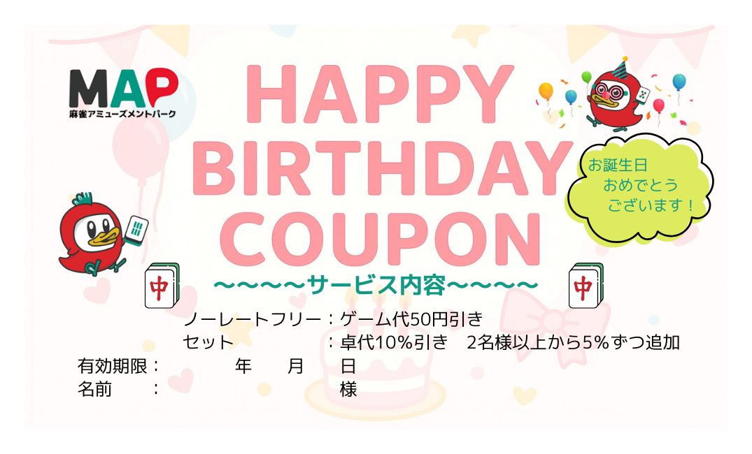 まぁじゃんMAP 熊本下通店熊本県 マージャンマップクマモトシモトオリテン 熊本県 辛島町駅 徒歩5分 フリー、ノーレート、麻雀教室、セット 電話する096-273-7798 地図 店舗トップ ルール 写真/動画 イベント 求人 クーポン プロ イチオシ ランキング クチコミ イベント詳細 スポットライトイベント イベント コミコミ食べ飲み放題プラン 日時 : 2025年12月4日(木)~2025年12月31日(水) 食べて!飲んで!!打って!!! お得に楽しく遊ぼう!! 平日もご利用いただけるようになりました! MAPで遊ぶならこれ一択!! 食べ飲み放題→ご遊戯開始から5時間 ご遊戯時間 →ご遊戯開始から8時間 ※ご利用にあたっての注意点 ・生ビールは1卓4杯まで。 ・原則、食べ切った後・飲み切った後のオーダーでお願いいたします。 (食べ残し料金はいただきませんが、なるべく食べ切れる量のご注文でお願いします!) イベント SNS投稿サービス!! 日時 : 2025年10月24日(金)~2025年10月31日(金) 当店のSNSをメンションや引用リポストして投稿すると遊ポイントプレゼント!! 遊ポイントはMAPメニュー、有料ドリンクでご利用いただけます!! イベント 新登場!!ランクアップ女性割 日時 : 2025年12月4日(木)~2025年12月31日(水) 女性のお客様が更に遊びやすくなりました!! ご来店回数に応じてゲーム代が割引となります。 初回から通常400円のゲーム代が20%OFFの320円!! フリーデビューにも最適!!業界最安値に挑戦中!! イベント ハッピーバースデークーポン!! 日時 : 2025年10月24日(金)~2025年10月31日(金) 誕生月のお客様対象にクーポン配布中! ~~~サービス内容~~~ ノーレートフリー 1か月ゲーム代50円引き セット 卓代10%引き 誕生月の方が2名様以上の場合5%追加 例)誕生月2名様卓代15%引き どちらも来店から1か月間有効です!! イベント 無料提携駐車場完備!! 日時 : 2025年12月4日(木)~2025年12月31日(水) 無料提携駐車場完備!! ご来店の際はパスート24提携駐車場をご利用ください! パスート24銀座プレスが一番近い駐車場です!(徒歩1分) 熊本県で一番遊びやすいお店をめざします!! ※パスート24以外の駐車場は割引対象になりません。ご了承下さい。 さらに読み込む... 次の6件〜10件/全19件の検索 お店のコトを友達に教える Facebook X(旧Twitter) Line Mail お店を評価する 閉店・休業・移転・情報違い報告 クチコミ投稿 報告内容詳細※必須 閉店 休業 移転 情報違い 送信する