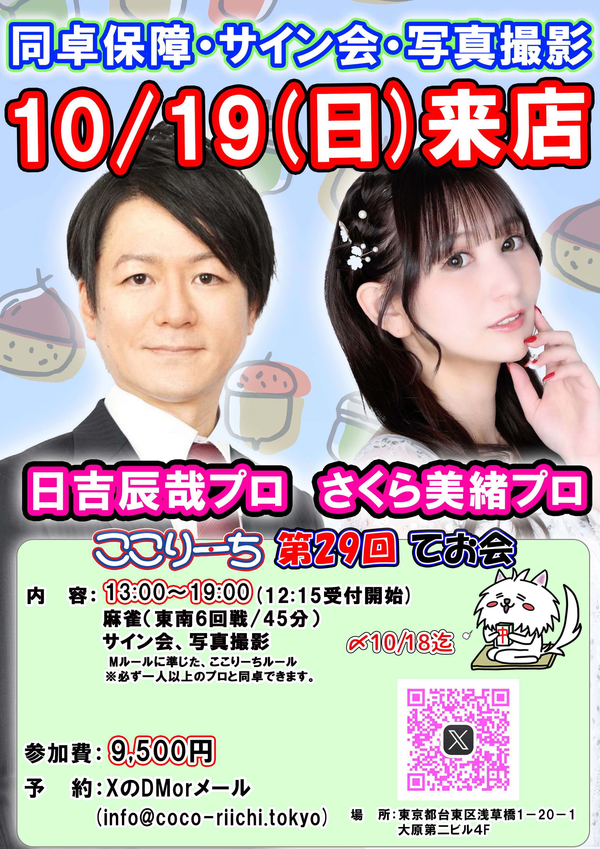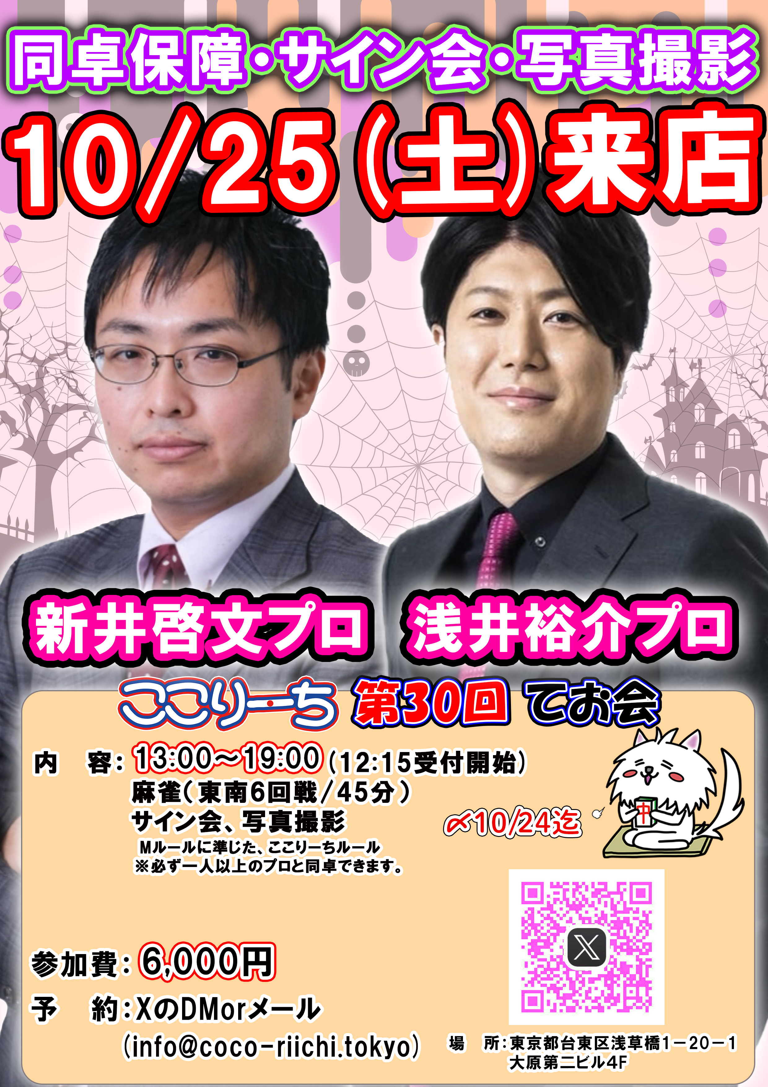 2025.02.01 オープン OPEN麻雀 ここりーち東京都 マージャンココリーチ 東京都 浅草橋駅 徒歩2分 四麻、三麻、ノーレート、セット 電話する03-5829-5419 地図 店舗トップ ルール 写真/動画 イベント 求人 クーポン プロ イチオシ ランキング クチコミ イベント詳細 イベント ✨✨第30回てお会/ゲスト「 新井啓文プロ&浅井裕介プロ」です!✨✨ 日時 : 2025年10月25日(土)~2025年10月25日(土) ⭐第30回てお会を開催いたします⭐ ゲストは「新井啓文プロ&浅井裕介プロ」です! ここりーちのイベントは和気あいあいとした和やかなイベントです! 点数計算できなくて不安な方や、イベント参加が初めてで雰囲気分からない方! ここりーちなら大丈夫👍 初心者🔰に優しいお店です! ご安心してご参加ください😊 ご予約はX(旧Twitter)のここりーちアカウント @cocoriichi2024 へDMでご連絡ください! よろしくお願いいたします! イベント ✨✨第29回てお会/ゲスト「日吉辰哉プロ&さくら 美緒プロ」です!✨✨ 日時 : 2025年10月19日(日)~2025年10月19日(日) ⭐第29回てお会を開催いたします⭐ ゲストは「日吉辰哉プロ&さくら美緒プロ」です! ここりーちのイベントは和気あいあいとした和やかなイベントです! 点数計算できなくて不安な方や、イベント参加が初めてで雰囲気分からない方! ここりーちなら大丈夫👍 初心者🔰に優しいお店です! ご安心してご参加ください😊 ご予約はX(旧Twitter)のここりーちアカウント @cocoriichi2024 へDMでご連絡ください! よろしくお願いいたします! イベント ✨✨第28回てお会/ゲスト「 内川幸太郎プロ」です!✨✨ 日時 : 2025年10月14日(火)~2025年10月14日(火) ⭐第27回てお会を開催いたします⭐ ゲストは「内川幸太郎プロ」です! ここりーちのイベントは和気あいあいとした和やかなイベントです! 点数計算できなくて不安な方や、イベント参加が初めてで雰囲気分からない方! ここりーちなら大丈夫👍 初心者🔰に優しいお店です! ご安心してご参加ください😊 ご予約はX(旧Twitter)のここりーちアカウント @cocoriichi2024 へDMでご連絡ください! よろしくお願いいたします! イベント ✨✨第27回てお会/ゲスト「中川美優プロ&山脇千文美プロ」です!✨✨ 日時 日時 : 2025年10月5日(日)~2025年10月5日(日) ⭐第27回てお会を開催いたします⭐ ゲストは「中川美優プロ&山脇千文美プロ」です! ここりーちのイベントは和気あいあいとした和やかなイベントです! 点数計算できなくて不安な方や、イベント参加が初めてで雰囲気分からない方! ここりーちなら大丈夫👍 初心者🔰に優しいお店です! ご安心してご参加ください😊 ご予約はX(旧Twitter)のここりーちアカウント @cocoriichi2024 へDMでご連絡ください! よろしくお願いいたします! イベント ✨✨第26回てお会/ゲスト「 瀬戸麻衣プロ&押手まりプロ」です!✨✨ 日時 : 2025年10月4日(土)~2025年10月4日(土) ⭐第26回てお会を開催いたします⭐ ゲストは「瀬戸麻衣プロ&押手まりプロ」です! ここりーちのイベントは和気あいあいとした和やかなイベントです! 点数計算できなくて不安な方や、イベント参加が初めてで雰囲気分からない方! ここりーちなら大丈夫👍 初心者🔰に優しいお店です! ご安心してご参加ください😊 ご予約はX(旧Twitter)のここりーちアカウント @cocoriichi2024 へDMでご連絡ください! よろしくお願いいたします! さらに読み込む... 次の6件〜10件/全34件の検索 お店のコトを友達に教える Facebook X(旧Twitter) Line Mail お店を評価する 閉店・休業・移転・情報違い報告 クチコミ投稿 報告内容詳細※必須 閉店 休業 移転 情報違い 送信する