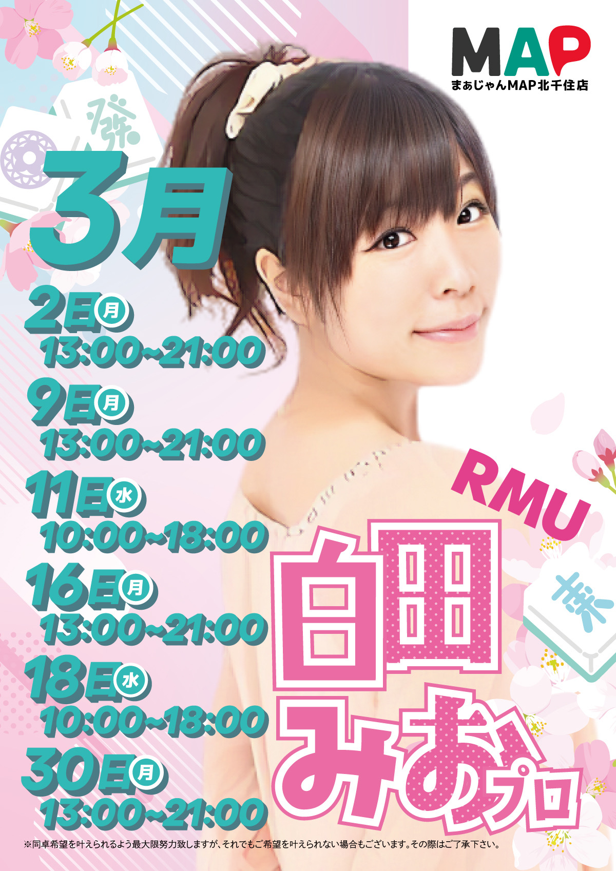 2025.12.11 オープン OPENまぁじゃんMAP 北千住店東京都 マージャンマップキタセンジュテン 東京都 北千住駅 徒歩90秒 四麻、三麻、セット、フリー 電話する03-5284-8470 地図 店舗トップ ルール 写真/動画 イベント 求人 クーポン プロ イチオシ ランキング クチコミ イベント詳細 イベント 新ルールスタート 日時 : 2026年3月24日(火)~2026年12月31日(木) 3月16日17時より新ルールスタート!! 北千住店・川崎店の二店舗で実施します 新ルールご遊技でお食事・ドリンク券プレゼント! 5ゲーム遊戯されますとさらにもう1枚プレゼント!! さらに新ルールで55000点オーバー達成で 麻雀グッズ作家「一条いろは」さんグッズまたは1000遊ポイントのどちらかをプレゼント♪ (一条いろはさんグッズは先着1店舗5名様限定となります) また新ルールと連動したLINEクーポンも配布中!! ルールの詳細はスタッフまでお問い合わせください イベント 3月ゲストスケジュール 日時 : 2026年3月24日(火)~2026年3月30日(月) ザンリーグ所属 涼宮 麻由プロ 10日 16:00~22:00 RMU所属 白田 みおプロ 2日 13:00~21:00 9日 13:00~21:00 11日 10:00~18:00 16日 13:00~21:00 18日 10:00~18:00 30日 13:00~21:00 イベント 快適空間1卓貸し切り完全個室あり!! 固定イベント 【当店の個室について】 当店の個室は ✨1卓貸し切りの完全個室✨です! ・テレビ完備 ・エアコン完備 ・空気清浄機完備 さらにソファ付きなので、 5名様以上でもゆったりご利用可能! 人気のお部屋のため、 👉 事前予約がおすすめです ※キャンセル料は一切かかりません ※土日はご予約推奨です イベント おはよう麻雀 日時 : 2026年3月24日(火)~2026年12月31日(木) 🌞 平日の朝~昼が超おトク! 🌞 ⏰ 15時までのご来店がチャンス♪ 🀄 平日セット麻雀 👉 15時までの来店で 💰 卓代 1時間700円!!! 安すぎ注意⚠️ 💥 とにかく… 平日15時までのご来店がおトクなんです!! さらに読み込む... 次の6件〜4件/全4件の検索 お店のコトを友達に教える Facebook X(旧Twitter) Line Mail お店を評価する 閉店・休業・移転・情報違い報告 クチコミ投稿 報告内容詳細※必須 閉店 休業 移転 情報違い 送信する