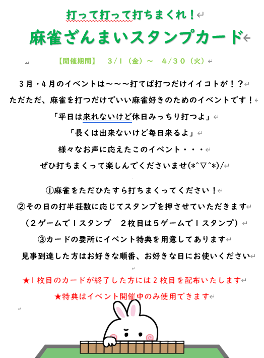 麻雀 エンゼル愛知県 マージャンエンゼル 愛知県 中村公園駅 徒歩10分 三麻、セット、フリー 電話する052-461-8457 地図 店舗トップ ルール 写真/動画 イベント 求人 クーポン プロ イチオシ ランキング クチコミ イベント詳細 スポットライトイベント イベント 【麻雀ざんまい】イベント開催中!! 日時 : 2024年3月1日(金)~2024年4月30日(火) 期間中、通常のフリースタンプカードとは別にイベントスタンプカードを 贈呈☆お得にスタンプを貯めて楽しく麻雀しましょう!! イベント 【フロア内禁煙化のお知らせ】 固定イベント イベント 【GW期間のパック料金について】 日時 : 2024年4月27日(土)~2024年5月6日(月) 日頃お世話になっております。 4月27日~5月6日までのGW期間におきまして、 ネット予約限定パックの平日昼及び夜のフリータイムは 予約不可とさせて頂きます。 週末の昼フリータイム(11:00~17:00)のみ御予約頂けます。 悪しからずご了承下さい。期間中の皆様のご来店を心よりお待ち申し上げます。 イベント ◆お得なスタンプカード◆ 固定イベント 来店につき1個スタンプがたまります☆ 全部で30個スタンプを集めたら、一日ゲーム代無料で遊び放題!! さらに読み込む... 次の6件〜4件/全4件の検索 お店のコトを友達に教える Facebook X(旧Twitter) Line Mail お店を評価する 閉店・休業・移転・情報違い報告 クチコミ投稿 報告内容詳細※必須 閉店 休業 移転 情報違い 送信する