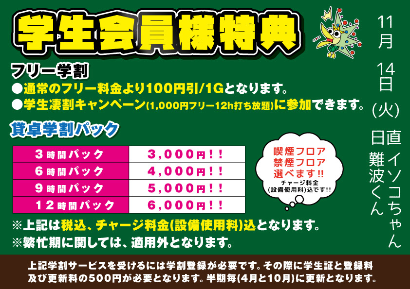 学生凄割(フリ-12h 1,000円打ち放題)に参加できます。