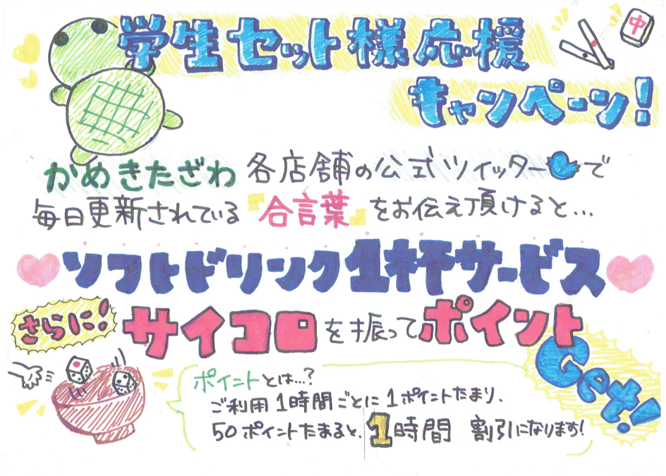 麻雀 かめきたざわ 三軒茶屋店東京都 マージャン カメキタザワ サンケンジャヤテン 東京都 三軒茶屋駅 徒歩2分 セット、三麻、フリー 電話する03-5779-6608 地図 店舗トップ ルール 写真/動画 イベント 求人 クーポン プロ イチオシ ランキング クチコミ イベント詳細 イベント ☆★ツイッター見ました学生応援キャンペーン★☆ 固定イベント ☆★ツイッター見ました学生応援キャンペーン★☆ ◎ARフリーのお客様 サイコロ1個振りポイントゲット! ◎学生セットのお客様 有料ソフトドリンク1杯サービス! &サイコロ1個振りセットポイントゲット! 毎日ツイッターで合言葉を発表します^^ @kamesancha フォローお願いします☆彡 イベント 女性・学生・フリーター(23歳以下の方)フリー1ゲーム350円!! 固定イベント かめきたざわのARGAKUは特典いっぱい! どんどん利用してください! 対象:女性・学生・フリーター(23歳以下の方) サービス内容:1ゲーム 350円 ※ゲーム中は表示通り清算してください。 お帰りの際、半荘数×50円をバックいたします。 さらに読み込む... 次の6件〜2件/全2件の検索 お店のコトを友達に教える Facebook X(旧Twitter) Line Mail お店を評価する 閉店・休業・移転・情報違い報告 クチコミ投稿 報告内容詳細※必須 閉店 休業 移転 情報違い 送信する