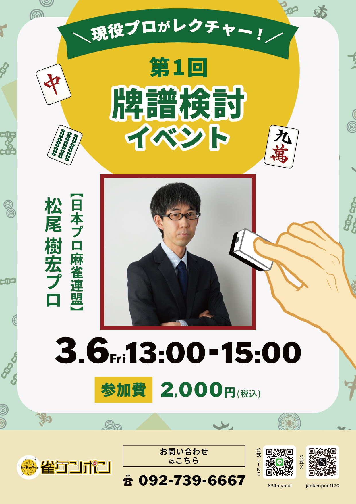 雀ケンポン福岡県 ジャンケンポン 福岡県 赤坂駅 徒歩3分 セット、健康麻雀、麻雀教室、ノーレート、フリー、四麻 電話する092-739-6667 地図 店舗トップ ルール 写真/動画 イベント 求人 クーポン プロ イチオシ ランキング クチコミ イベント詳細 スポットライトイベント イベント 第5回初級者用牌効率講座のお知らせ 日時 : 2026年2月5日(木)~2026年2月5日(木) 好評をいただいております、守備力アップ講座を開催いたします。 2月5日(木)13:00から2時間程度の講座です。 ※開始15分前までにはお越しください ・参加費:2,000円 ・定員:12名 守りたいけど何を捨てれば安全なのかが分からない、という方向けの講座です。 スジとカベが分からない方向けの講座となっております。 ※初級者の方が対象の講義内容となります みなさまのご参加をお待ちしております。 イベント 第6回初級者用牌効率講座のお知らせ 日時 : 2026年3月13日(金)~2026年3月13日(金) 好評をいただいております、守備力アップ講座を開催いたします。 3月13日(金)13:00から2時間程度の講座です。 ※開始15分前までにはお越しください ・参加費:2,000円 ・定員:12名 守りたいけど何を捨てれば安全なのかが分からない、という方向けの講座です。 スジとカベが分からない方向けの講座となっております。 ※初級者の方が対象の講義内容となります みなさまのご参加をお待ちしております。 イベント 3月アガリ役講座のお知らせ 日時 : 2026年3月26日(木)~2026年3月26日(木) 好評をいただいております「アガリ役講座」の開催のお知らせです。 3月26日(木)17:00から1時間程度の講座です。 ※開始15分前までにはお越しください ・参加費:1,000円 ・定員:12名 ゲームの進行は覚えたけど、役をまだしっかり覚えてないのよね〜 って方、是非この機会にチャレンジしましょう! みなさまのご参加をお待ちしております。 イベント 第1回牌譜検討イベントのお知らせ 日時 : 2026年3月6日(金)~2026年3月6日(金) 初回開催となりますイベントのご案内です。 3月6日(金)13:00から2時間程度の講座です。 ※開始15分前までにはお越しください ・参加費:2,000円 ・定員:12名 1半荘打った後、4人で牌譜検討を行います。 中〜上級者向けの内容です。定員先着4名となります。 みなさまのご参加をお待ちしております。 イベント 第8回初級者用守備力アップ講座のお知らせ 日時 : 2026年3月19日(木)~2026年3月19日(木) 好評をいただいております、守備力アップ講座を開催いたします。 3月19日(木)13:00から2時間程度の講座です。 ※開始15分前までにはお越しください ・参加費:2,000円 ・定員:12名 守りたいけど何を捨てれば安全なのかが分からない、という方向けの講座です。 スジとカベが分からない方向けの講座となっております。 ※初級者の方が対象の講義内容となります みなさまのご参加をお待ちしております。 さらに読み込む... 次の6件〜10件/全97件の検索 お店のコトを友達に教える Facebook X(旧Twitter) Line Mail お店を評価する 閉店・休業・移転・情報違い報告 クチコミ投稿 報告内容詳細※必須 閉店 休業 移転 情報違い 送信する