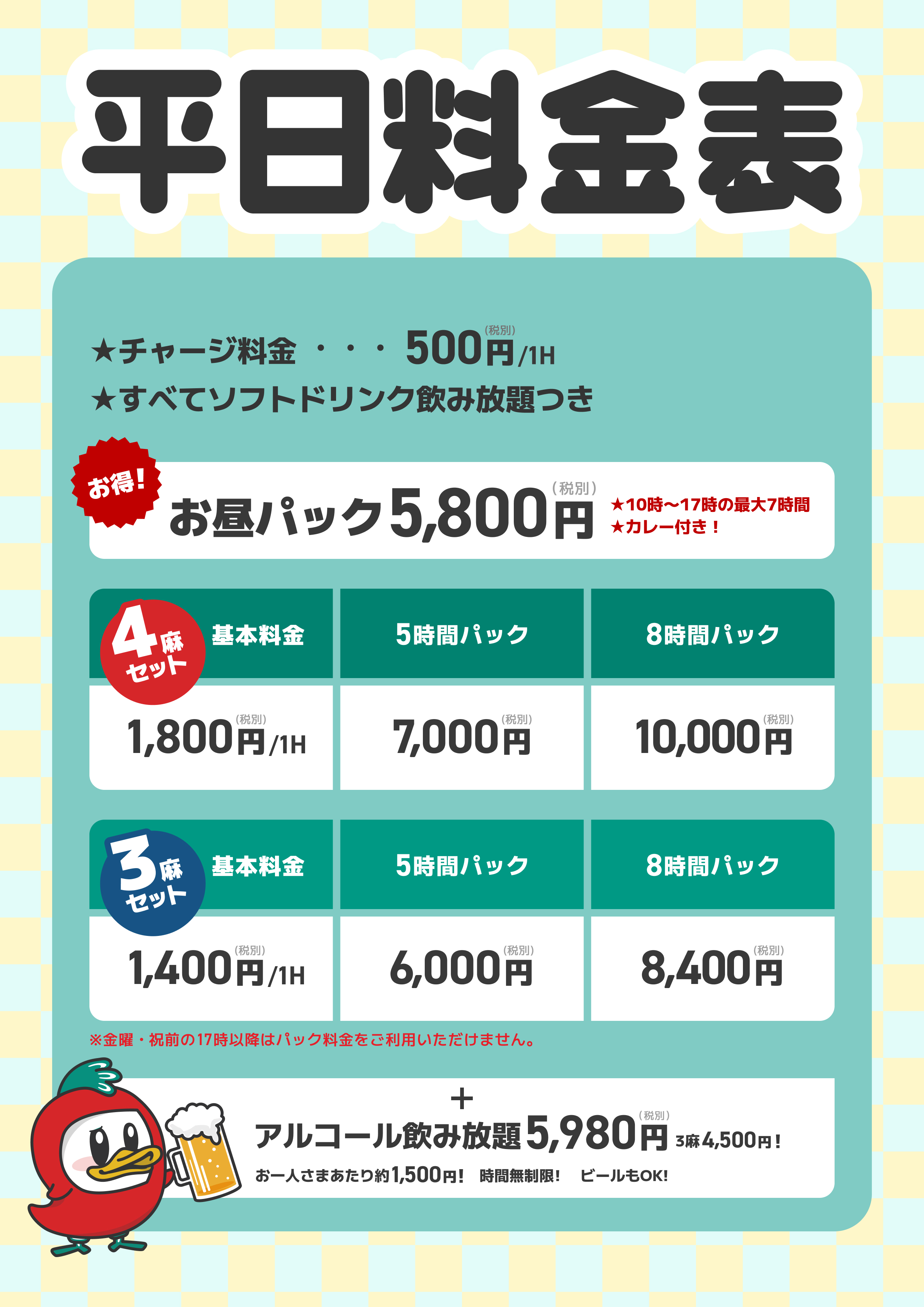 まぁじゃんMAP 新橋店東京都 マァジャンマップ シンバシテン 東京都 新橋駅 徒歩5分 セット 電話する03-6273-3600 地図 店舗トップ ルール 写真/動画 イベント 求人 クーポン プロ イチオシ ランキング クチコミ イベント詳細 イベント 完全個室が増えました❗️ 固定イベント ✨同じビルの6階に“はなれ”がオープン✨ 🎉🎉完全個室(室内1卓)×2、半個室×1の計3卓🎉🎉 3階同様、6階の“はなれ”もよろしくお願い致します☺️ ※個室をご利用の場合には、卓代とは別に「個室料」 5000円(税別)を頂戴いたします イベント 平日料金表 固定イベント 🌈お昼パック🌈 平日のお昼に麻雀するならコレ1択といえるくらい お得なパックですのでぜひご利用ください♪ 🍻アルコール飲み放題🍻 時間無制限! 生ビールもok! それなのにお1人様約1500円! 正直…オススメです✨ イベント 土日祝日料金表 固定イベント 🌈打ち放題パック🌈(土日祝限定) MAX12時間あそぶと 1卓1時間あたりの料金は 驚異の1100円‼ 新橋でもトップクラスのお安さのはずです 🍻アルコール飲み放題🍻 時間無制限! 生ビールもOK! それでお1人様約1500円! 正直…オススメです✨ 🌈打ち飲み放題パック🌈(土日祝限定) ビール以外なら ほぼ全てのアルコールが飲み放題とは 正直やりすぎな気もしますが… ぜひご利用下さい イベント ✨個室完備✨ 固定イベント 完全個室ご予約受付中♪♪ 広くて綺麗な個室がございます! ・タバコが苦手な方 ・接待に利用したい方 ・落ち着いた空間で麻雀したい方 ・大人数でワイワイしたい方 是非ご利用くださいませ! ※個室をご利用の場合には、卓代とは別に「個室料」5000円(税別)を頂戴いたします 1~2卓までご利用可能ですので、ご予約時に利用卓数をお伝えください♪ イベント 💓カレーに新メニューが仲間入り💓 固定イベント 新橋店で根強く人気のあるカレーシリーズに 新しく牛すじカレーが仲間入り🍛 しっかり煮込まれたとろっとろの牛すじがたまらない😍 ぜひお試しあれ〜〜( *`ω´) MAPでは現在4種類のカレーをご用意しています🍛 ・キーマカレー ・バターチキンカレー ・牛すじカレー ・グリーンカレー どれも美味しいので是非コンプリートしてみてください❣️ さらに読み込む... 次の6件〜10件/全11件の検索 お店のコトを友達に教える Facebook X(旧Twitter) Line Mail お店を評価する 閉店・休業・移転・情報違い報告 クチコミ投稿 報告内容詳細※必須 閉店 休業 移転 情報違い 送信する