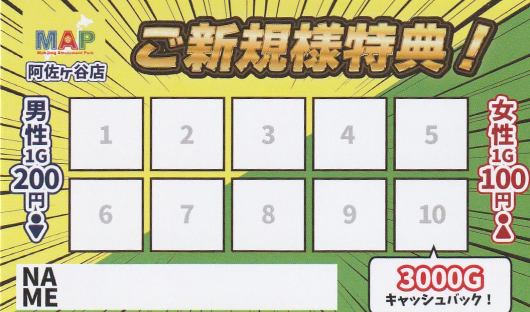 まぁじゃんMAP阿佐ヶ谷店4麻&3麻東京都 マァジャンマップ アサガヤテン 東京都 阿佐ケ谷駅 南口から徒歩29秒! 四麻、フリー、セット、三麻 電話する03-3398-9411 地図 店舗トップ ルール 写真/動画 イベント 求人 クーポン プロ イチオシ ランキング クチコミ イベント詳細 イベント 4人麻雀ご新規様特典! 固定イベント 四麻フリーご新規様大歓迎キャンペーン! 四麻フリーでご来店されたご新規様を対象に、 お得なスタンプカードをプレゼント! 5回目来店時まで、1ゲーム代無料! さらに ステップアップで スタンプカード制覇のお客様には 1ヶ月ゲーム代¥100-引きカード進呈! MAP阿佐ヶ谷店でお得に麻雀を楽しもう! ※注意事項※ このキャンペーンは予告なく終了することがあります イベント 3人麻雀ご新規様特典! 固定イベント M A P 阿佐ヶ谷店では、 初めてご来店して 三麻フリーを ご遊戯して頂いたお客様に!! ご新規様特典で お得なスタンプカードを配布中です♪ ※注意事項※ このキャンペーンは予告なく終了することがあります さらに読み込む... 次の6件〜2件/全2件の検索 お店のコトを友達に教える Facebook X(旧Twitter) Line Mail お店を評価する 閉店・休業・移転・情報違い報告 クチコミ投稿 報告内容詳細※必須 閉店 休業 移転 情報違い 送信する
