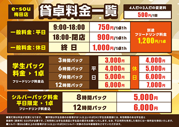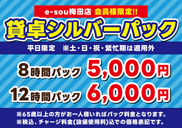 (平日)3h3000円 6h4000円 9h5000円 12h6000円