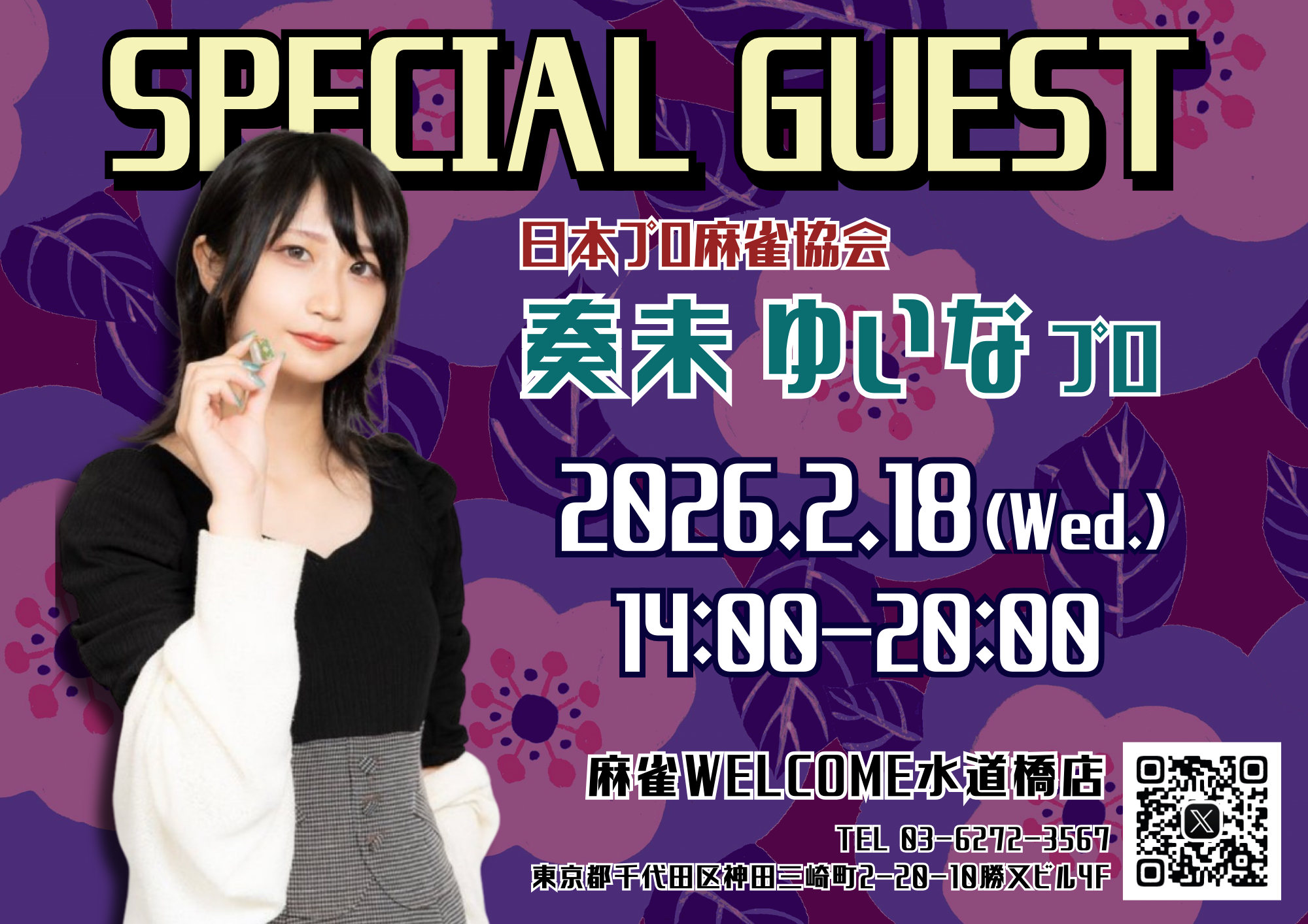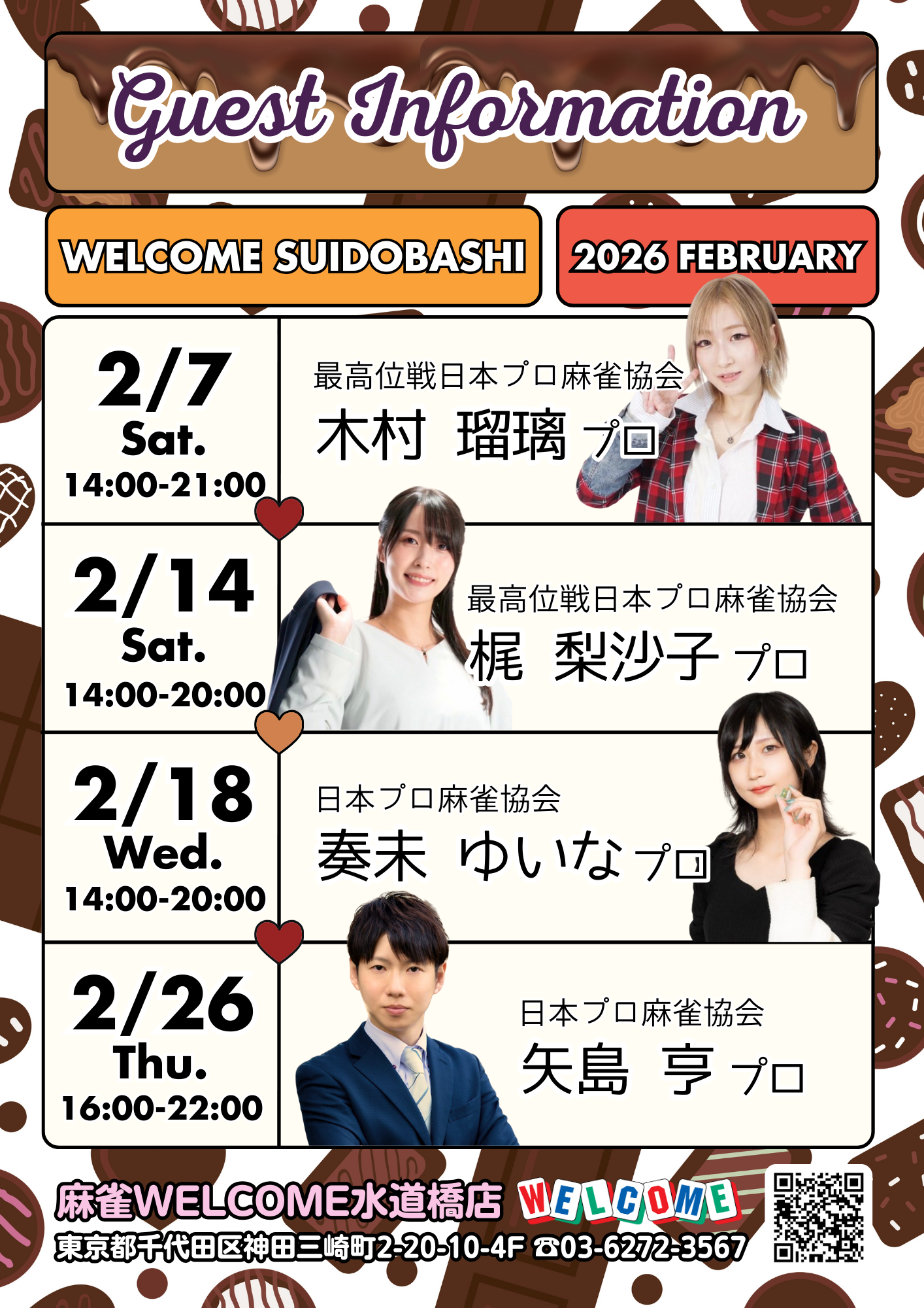 ウェルカム 水道橋店東京都 ウェルカム スイドウバシテン 東京都 水道橋駅 徒歩20秒 四麻、フリー、セット、ノーレート 電話する03-6272-3567 地図 店舗トップ ルール 写真/動画 イベント 求人 クーポン プロ イチオシ ランキング クチコミ イベント詳細 ピックアップイベント イベント ★☆★2026年2月・ゲスト来店スケジュール★☆★ 日時 : 2026年2月1日(日)~2026年2月28日(土) \2026年2月のゲスト来店スケジュール公開!!/ ◆2/7(土)14:00-21:00 木村 瑠璃 プロ【最高位戦日本プロ麻雀協会】 ◇2/14(土)14:00-20:00 梶 梨沙子 プロ【最高位戦日本プロ麻雀協会】 ◆2/18(水)14:00-20:00 奏未 ゆいな プロ【日本プロ麻雀協会】 ◇2/26(木)16:00-22:00 矢島 亨 プロ【日本プロ麻雀協会】 同卓等の詳細につきましては店舗までお問い合わせください。 ご来店心よりお待ちしております♪ イベント ご新規様【10ゲーム半額券】進呈! 固定イベント 新しく生まれ変わったウェルカム水道橋店のノーレートフリー麻雀に初めて遊びに来て下さったお客様に10ゲーム半額券を差し上げます。 有効期限はありませんので、2回目のご来店からいつでもご利用いただけます。 リニューアルしたウェルカム水道橋店のフリー麻雀をまずはお得にお楽しみ下さい♪ イベント 【ゲスト来店】木村瑠璃プロ(最高位戦日本プロ麻雀協会)来店! 日時 : 2026年2月7日(土)~2026年2月7日(土) 最高位戦日本プロ麻雀協会の木村瑠璃プロがゲスト来店します♪ ★☆★2/7(土)14時から21時★☆★ 皆様のご来店心よりお待ちしております! 詳細は店舗までお問い合わせください。 イベント 【ゲスト来店】梶梨沙子プロ(最高位戦日本プロ麻雀協会)来店! 日時 : 2026年2月14日(土)~2026年2月14日(土) 最高位戦日本プロ麻雀協会の梶梨沙子プロがゲスト来店します♪ ★☆★2/14(土)14時から20時★☆★ 皆様のご来店心よりお待ちしております! 詳細は店舗までお問い合わせください。 イベント 【ゲスト来店】奏未ゆいなプロ(日本プロ麻雀協会)来店! 日時 : 2026年2月18日(水)~2026年2月18日(水) 日本プロ麻雀協会の奏未ゆいなプロがゲスト来店します♪ ★☆★2/18(水)14時から20時★☆★ 皆様のご来店心よりお待ちしております! 詳細は店舗までお問い合わせください。 さらに読み込む... 次の6件〜6件/全6件の検索 お店のコトを友達に教える Facebook X(旧Twitter) Line Mail お店を評価する 閉店・休業・移転・情報違い報告 クチコミ投稿 報告内容詳細※必須 閉店 休業 移転 情報違い 送信する