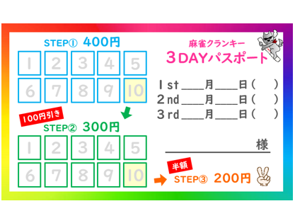 麻雀クランキー 四日市駅前店三重県 マージャンクランキー ヨッカイチエキマエテン 三重県 近鉄四日市駅 徒歩3分 四麻、フリー、セット 電話する059-337-8037 地図 店舗トップ ルール 写真/動画 イベント 求人 クーポン プロ イチオシ ランキング クチコミ イベント詳細 イベント 3DAYパスポートでゲーム代半額!! 固定イベント 3DAYパスポートでゲーム代半額!! 月・火・金・土・日(祝日も含む) の開店~Lastまで打てば打つほどゲーム代がお得になります!! 詳しくはこちらをご覧ください↓ ゲーム代が半額に!?クランキーの最強の料金システム!! イベント お客様無料駐車場のご案内 日時 : 2024年3月1日(金)~2044年3月1日(火) お客様無料駐車場が増大しました‼ 11台まで駐車可能です!! 当店から徒歩2分です!! 詳しくはお問合せ下さい!! TEL:0593378037 イベント 貸卓20%OFFクーポン配布中!! 固定イベント 貸卓をご利用いただいた皆様にプレゼント中!! 次回から使える20%OFFクーポン♬ ※このイベントが終了するまで、繰り返しご利用頂けます!! 個室は10%offになります。 さらに読み込む... 次の6件〜3件/全3件の検索 お店のコトを友達に教える Facebook X(旧Twitter) Line Mail お店を評価する 閉店・休業・移転・情報違い報告 クチコミ投稿 報告内容詳細※必須 閉店 休業 移転 情報違い 送信する