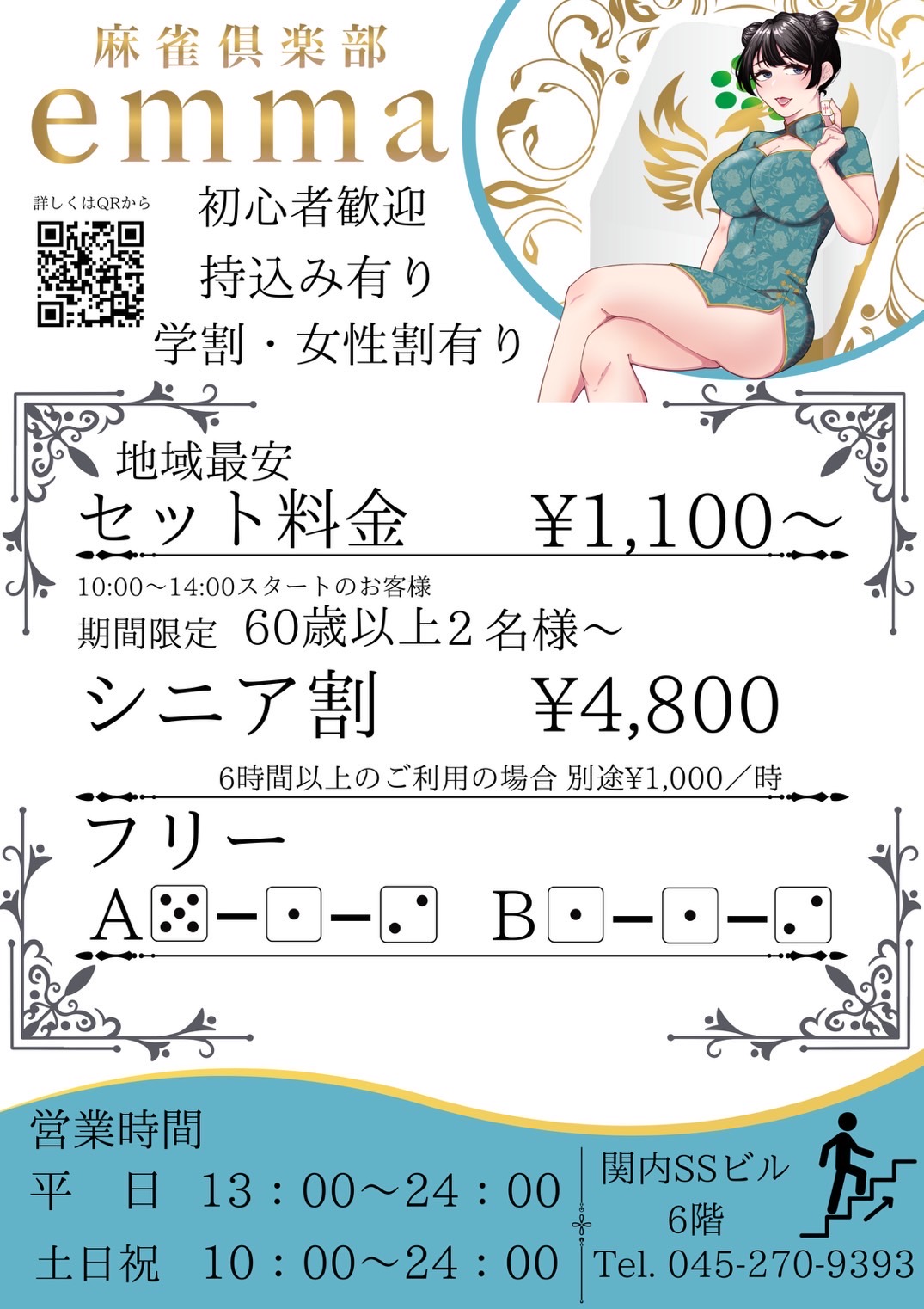 麻雀倶楽部 emma神奈川県 マージャンクラブエマ 神奈川県 関内駅 北口から徒歩3分 四麻、三麻、セット、フリー 電話する045-270-9393 地図 店舗トップ ルール 写真/動画 イベント 求人 クーポン プロ イチオシ ランキング クチコミ 写真一覧 動画一覧 お店のコトを友達に教える Facebook X(旧Twitter) Line Mail お店を評価する 閉店・休業・移転・情報違い報告 クチコミ投稿 報告内容詳細※必須 閉店 休業 移転 情報違い 送信する