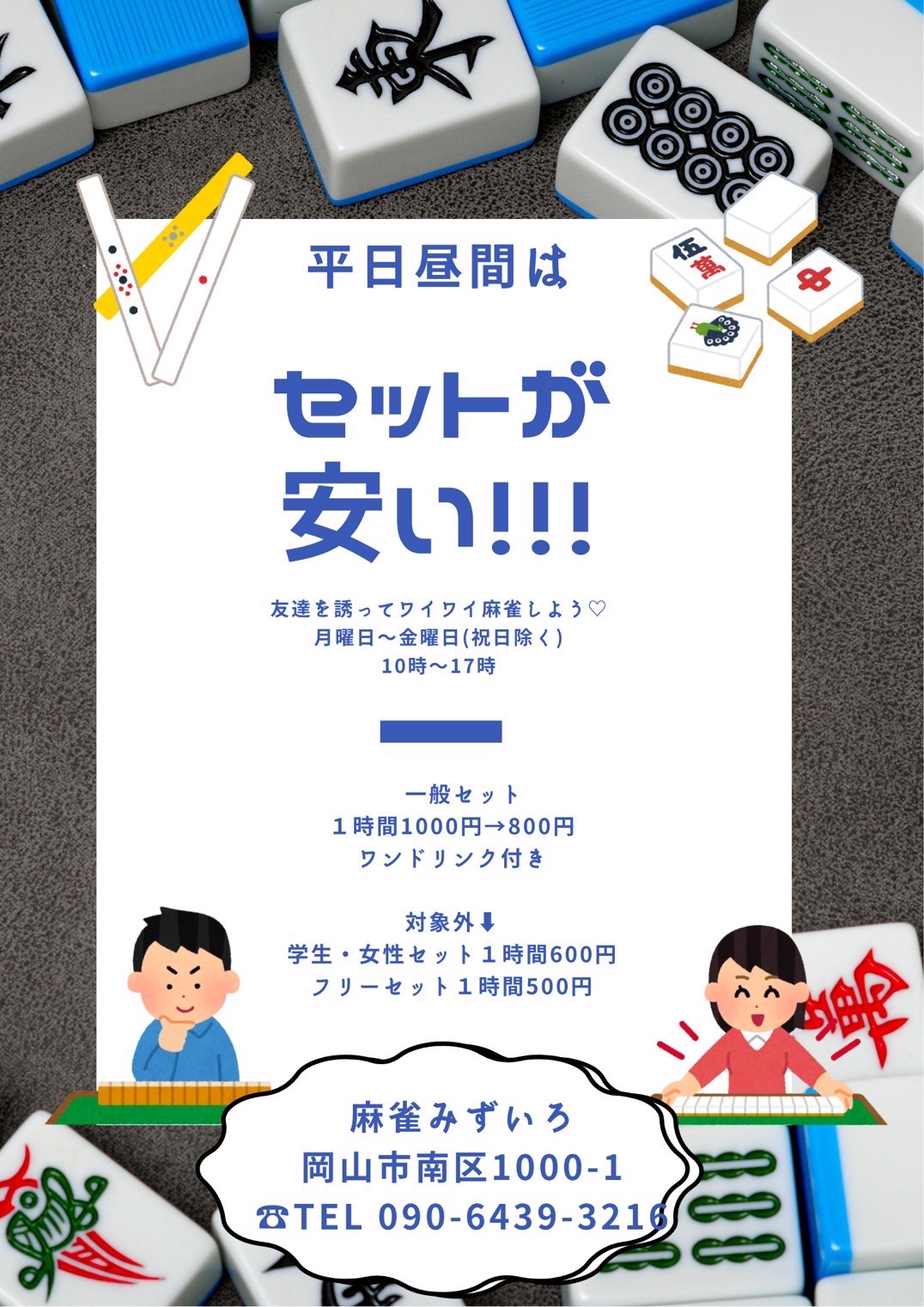 麻雀みずいろ岡山県 マージャンミズイロ 岡山県 妹尾駅 徒歩20分 三麻、麻雀教室、セット、フリー 電話する090-6439-3216 地図 店舗トップ ルール 写真/動画 イベント 求人 クーポン プロ イチオシ ランキング クチコミ 写真一覧 動画一覧 お店のコトを友達に教える Facebook X(旧Twitter) Line Mail お店を評価する 閉店・休業・移転・情報違い報告 クチコミ投稿 報告内容詳細※必須 閉店 休業 移転 情報違い 送信する